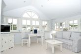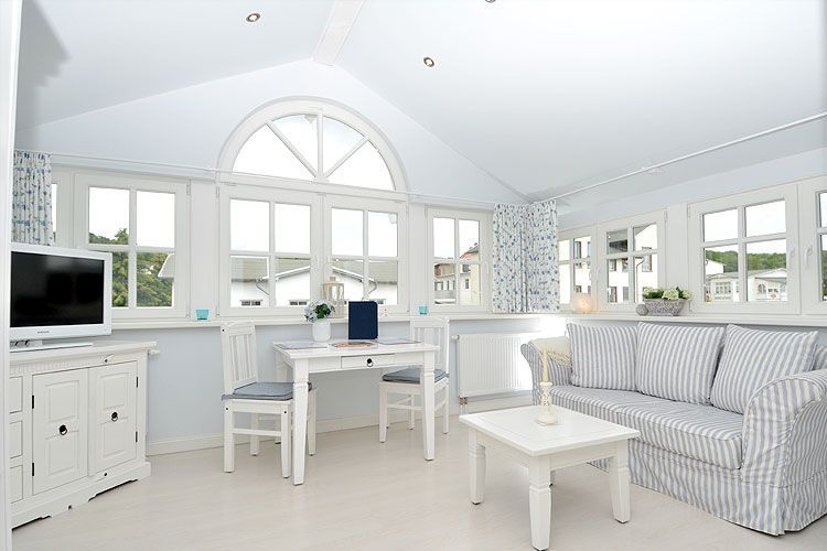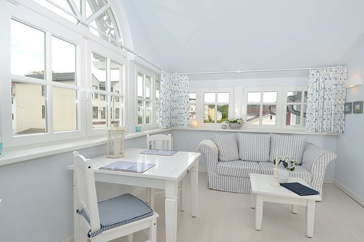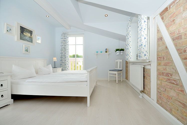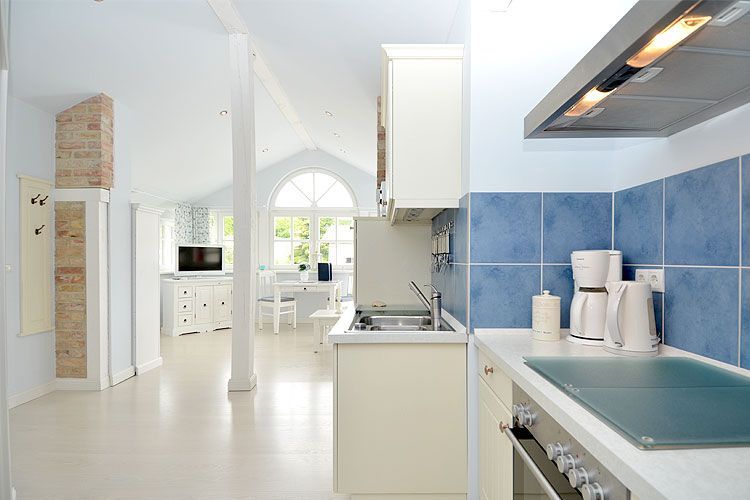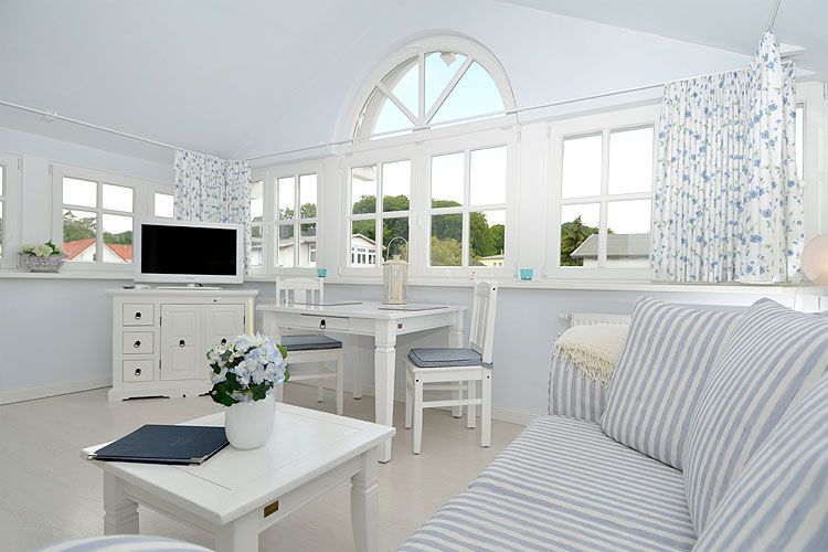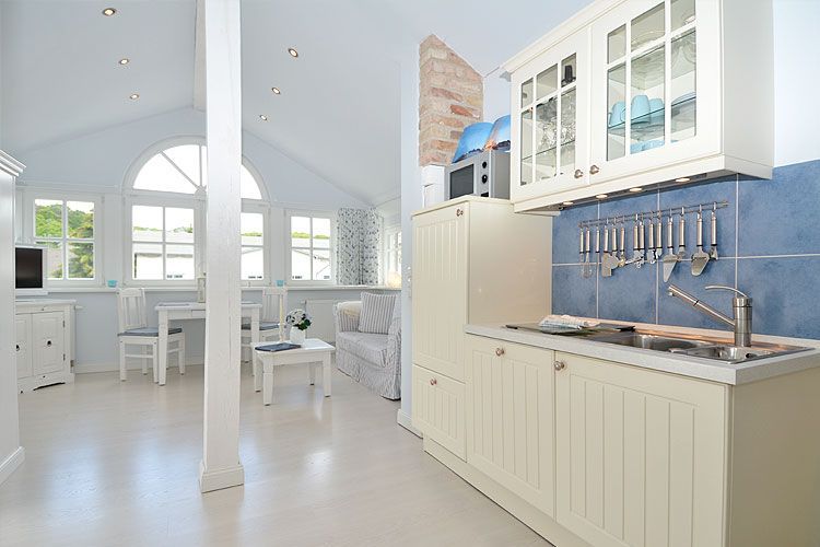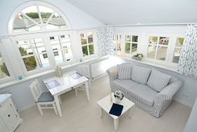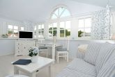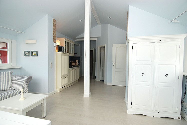 Wohnung 6: Dieses sehr schöne 2-Raum-Appartement im Dachgeschoss ist im weißen Landhausstil eingerichtet und hat eine Wohnfläche von ca. 48 m² sowie einen möblierten Balkon (ca. 5 m²) zur Abendsonne.
