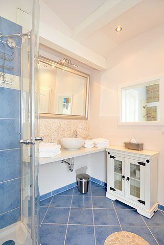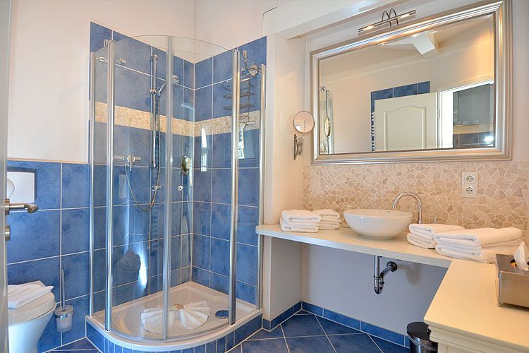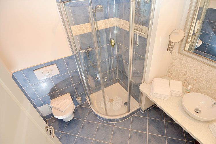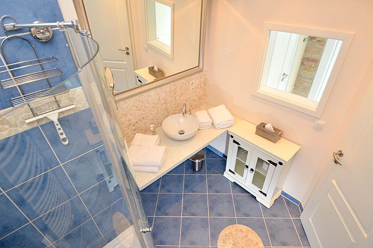 Ein modernes Duschbad mit WC, Waschbecken, Handtuchheizung und Fußbodenheizung rundet den hervorrasgenden Gesamteindruck dieser Ferienwohnung in Sellin ab.