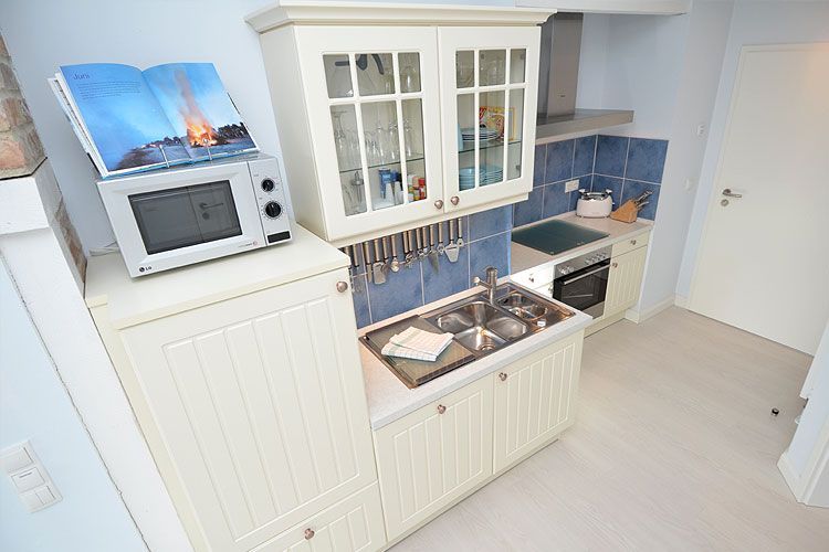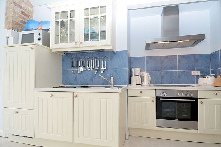 Die Landhausküchenzeile lässt keine Wünsche offen. Hier finden Sie einen Kühlschrank mit Gefrierfach, einen Backofen, ein 4 Platten-Ceranfeld, eine Spülmaschine, sowie Mikrowelle, Toaster, Mixer, einen Eierkocher und diverses Kleininventar, das die Küchenausstattung komplettiert. Der JURA-Kaffeeautomat sorgt auf Knopfdruck für Kaffee satt.
