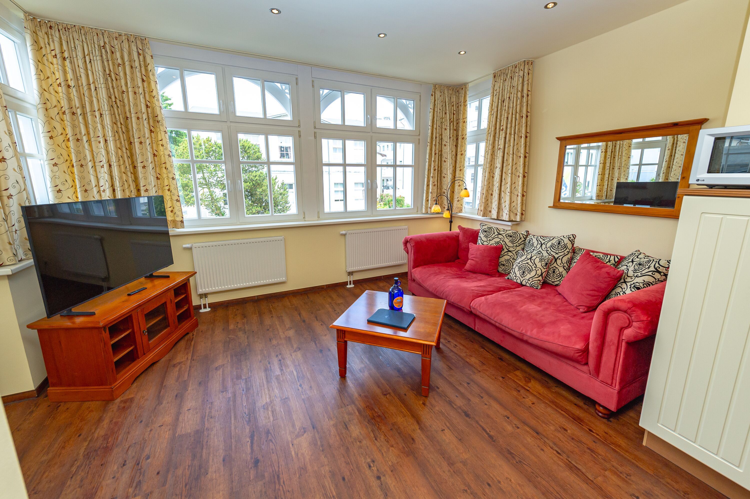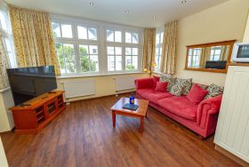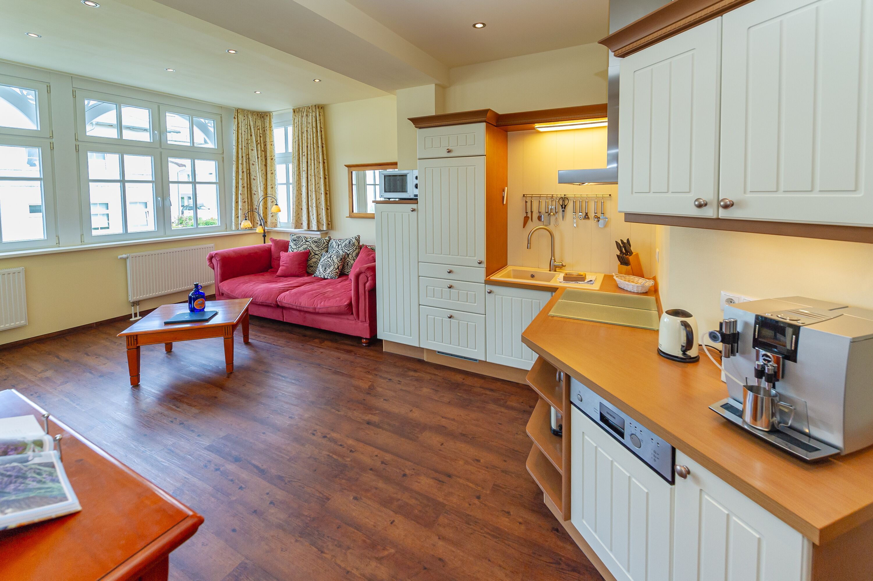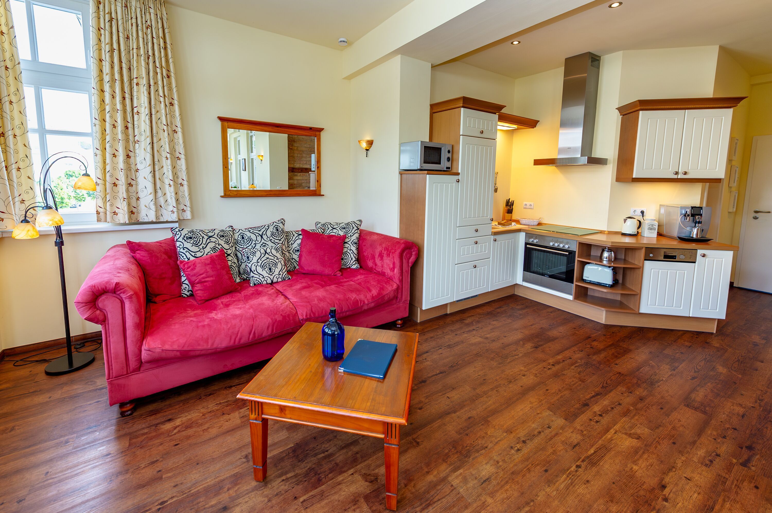 Dieses schöne 2-Raum-Appartement im 1. Obergeschoss ist im bernsteinfarbenen Landhausstil eingerichtet, hat eine Wohnfläche von ca. 56 m² und einen möblierten Balkon (ca. 5 m²) zur Abendsonne.