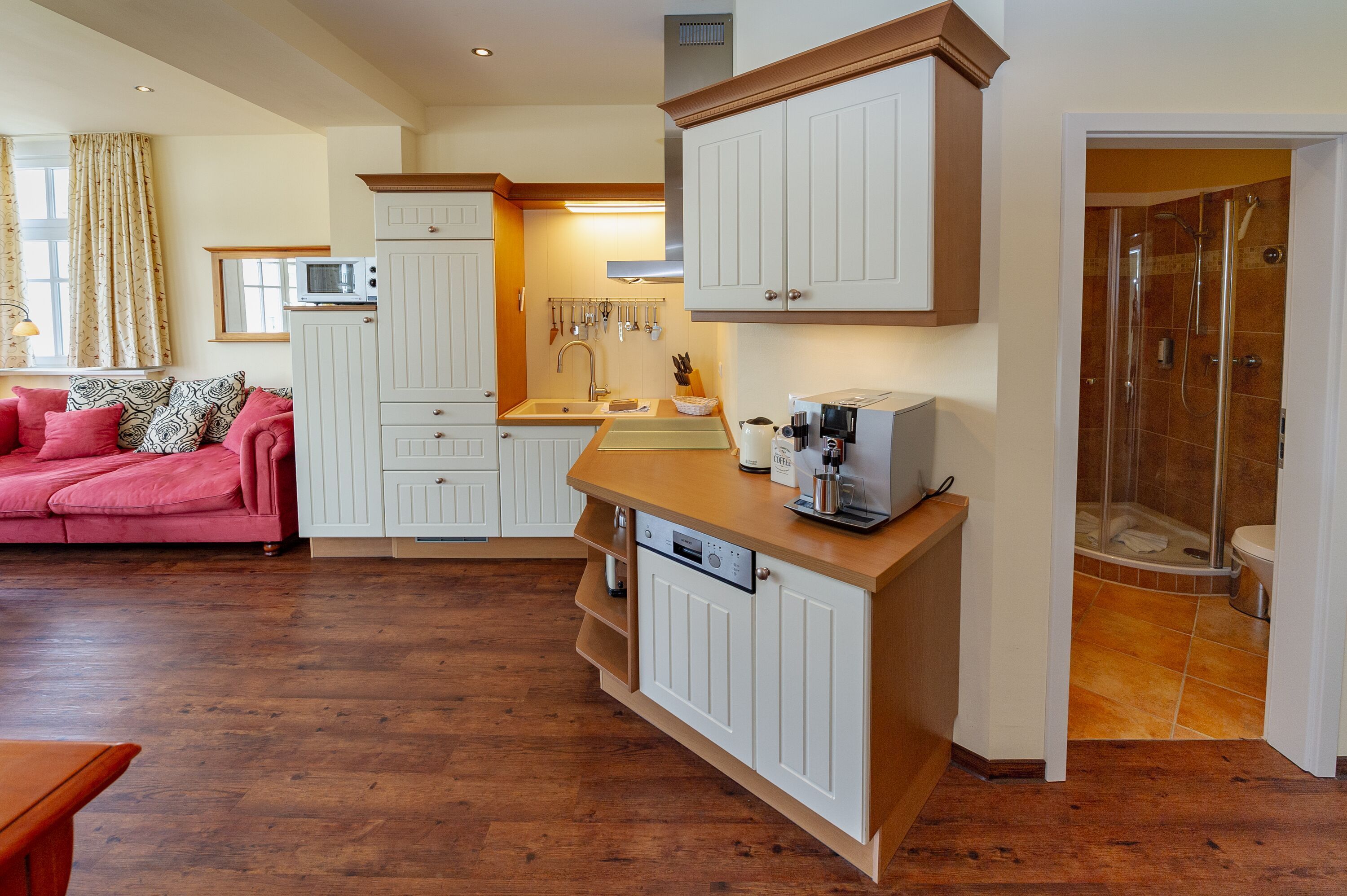 Die Landhausküchenzeile lässt keine Wünsche offen. Hier finden Sie u.a. einen Kühlschrank mit Gefrierfach, einen Backofen, ein 4-Platten-Ceranfeld, eine Spülmaschine sowie Mikrowelle, Toaster, Mixer, einen Eierkocher und diverses Kleininventar, das die Küchenausstattung komplettiert. Ein JURA-Kaffeeautomat sorgt für Kaffee satt.