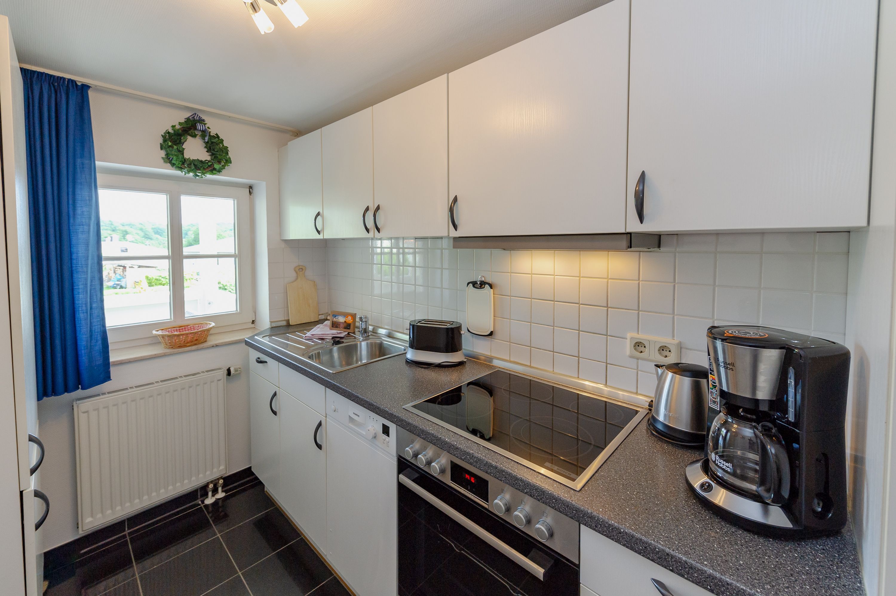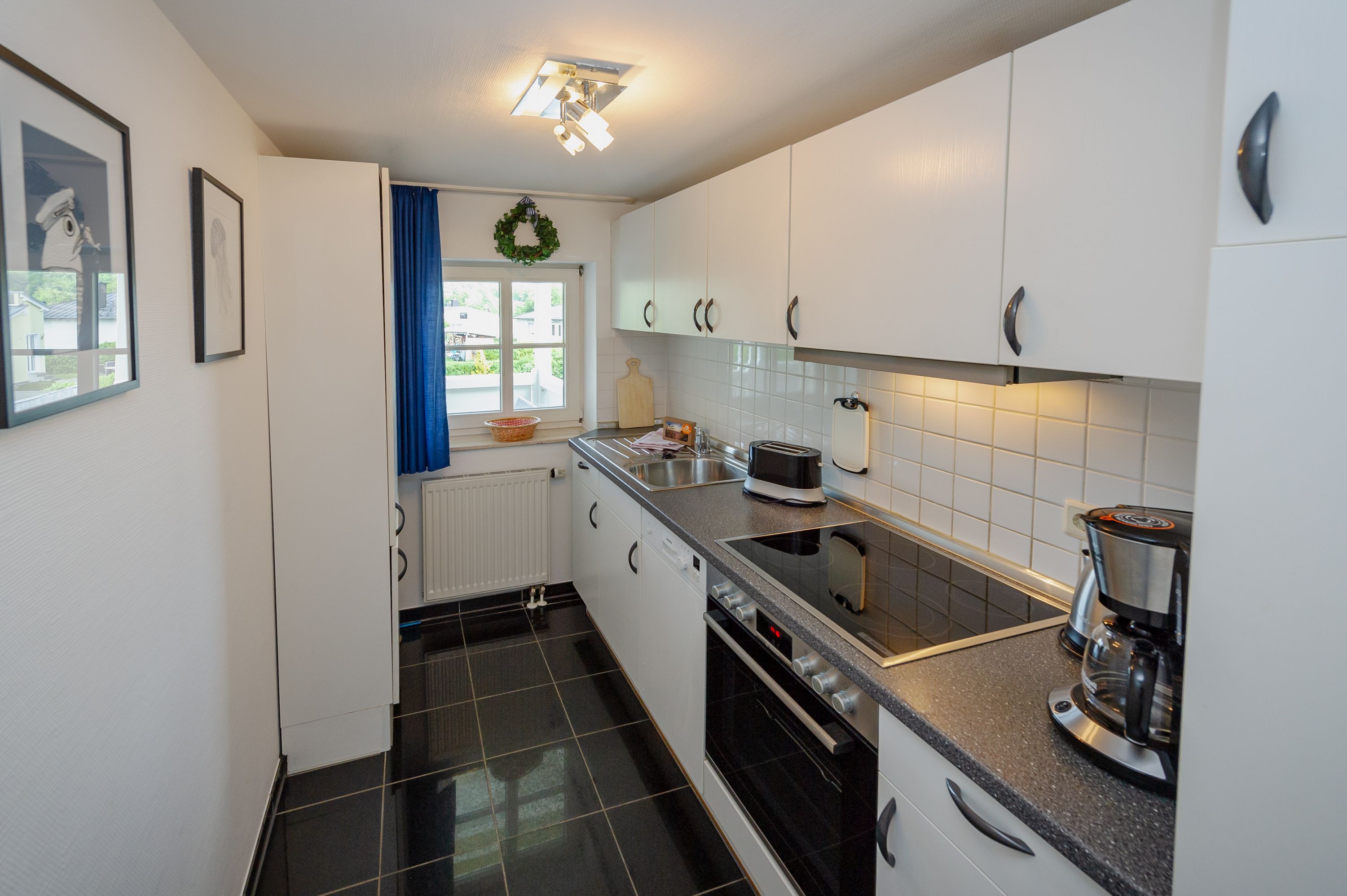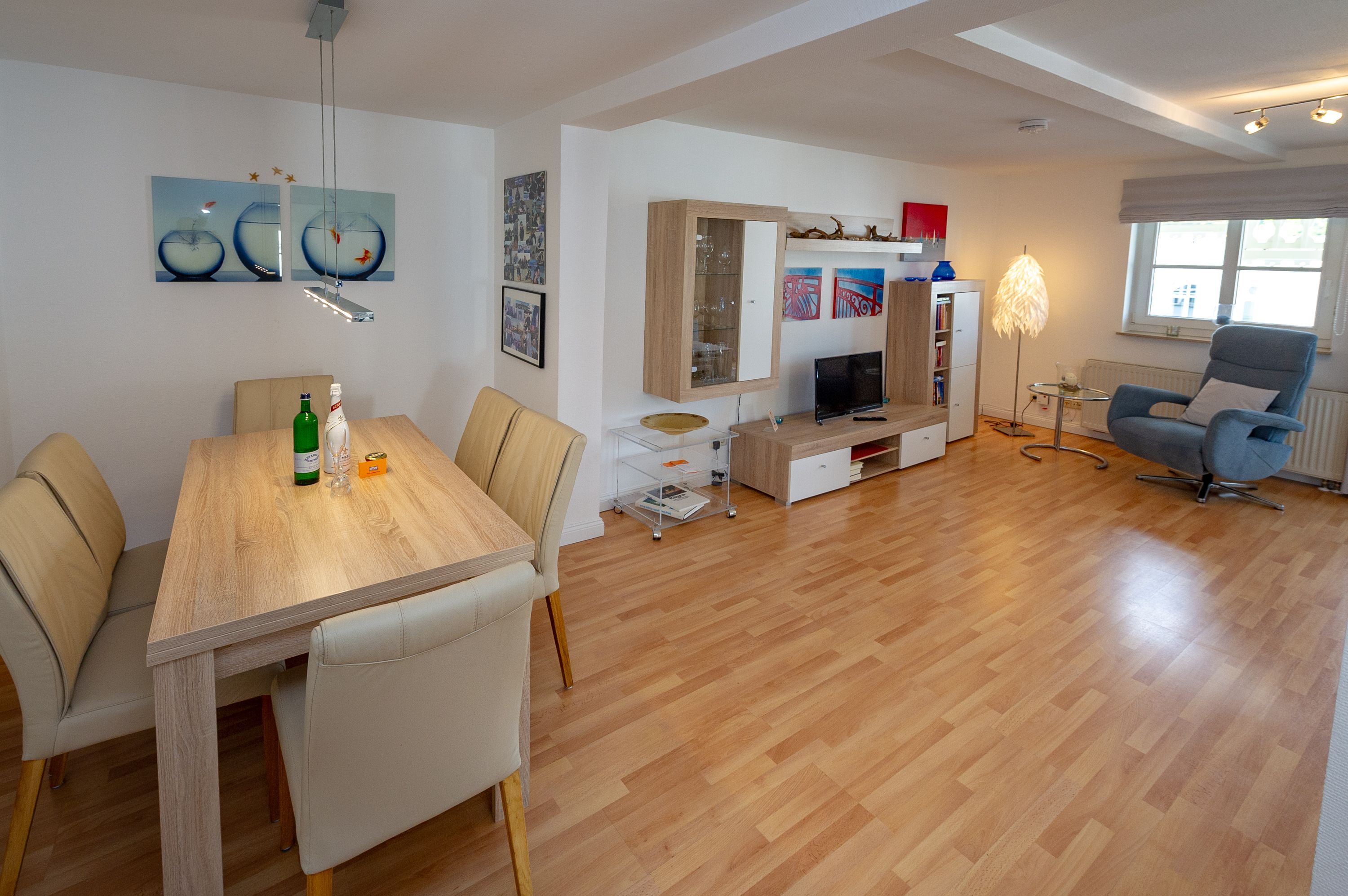 Über den Flur gelangen Sie in den modern und gemütlich ausgestatteten Wohnbereich mit einer bequemen Couchgarnitur, einem Relaxsessel, einem Flachbild-TV, Büchern zum Schmökern und dem Esstisch. Die separate Küche bietet Ihnen mit einem 4-Zonen-Ceranherd inkl. Backofen und Dunstabzug, einem Kühlschrank mit Gefrierfach, einer Spülmaschine, Kaffeemaschine, Wasserkocher und Toaster alle Möglichkeiten zur bequemen Selbstverpflegung. Mehrere Bäckershops finden Sie in fußläufiger Entfernung. Speisen und relaxen können Sie natürlich auch wunderbar auf Ihren beiden Balkonen. Diese sind überdacht.