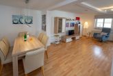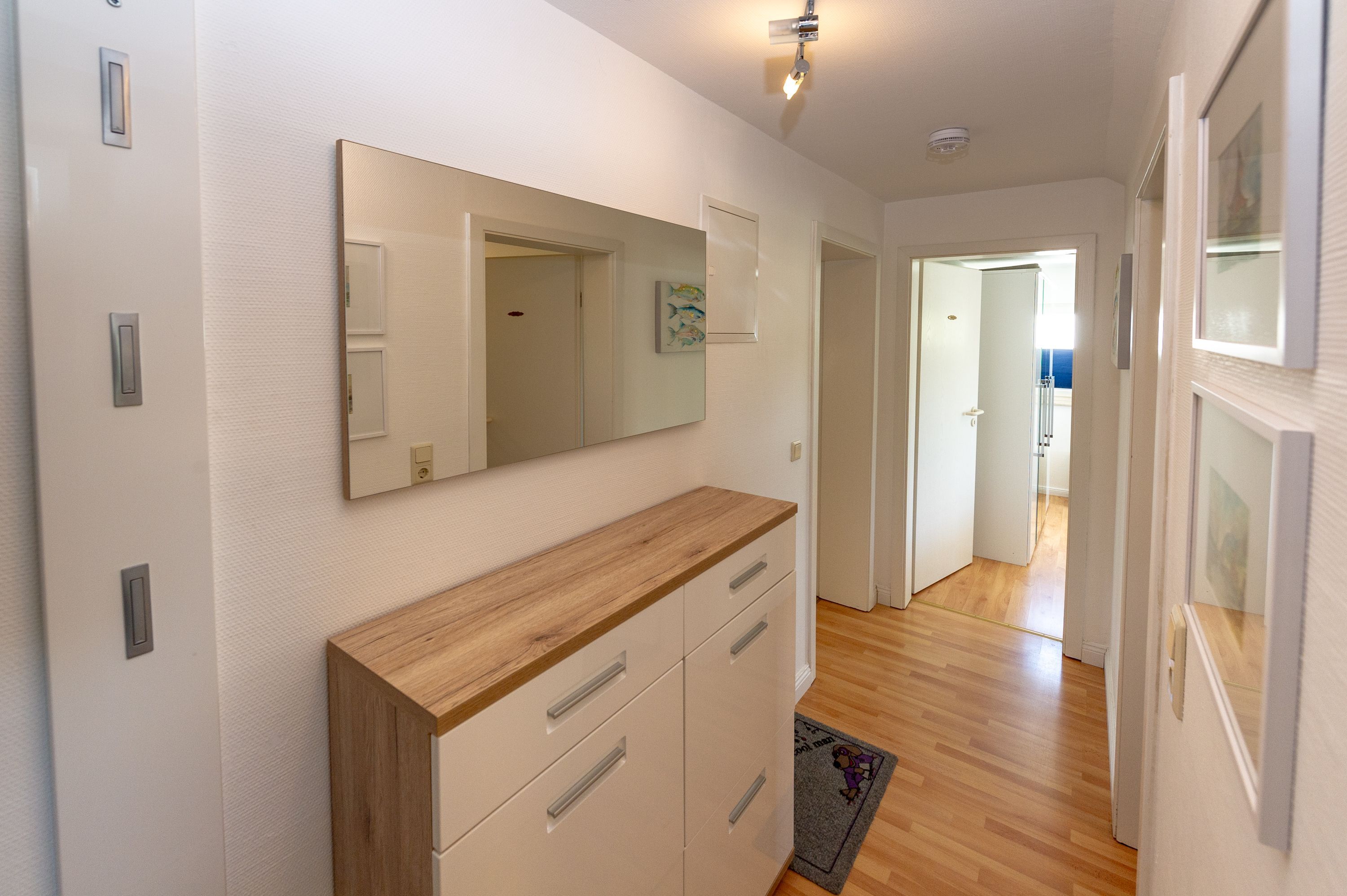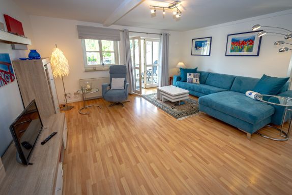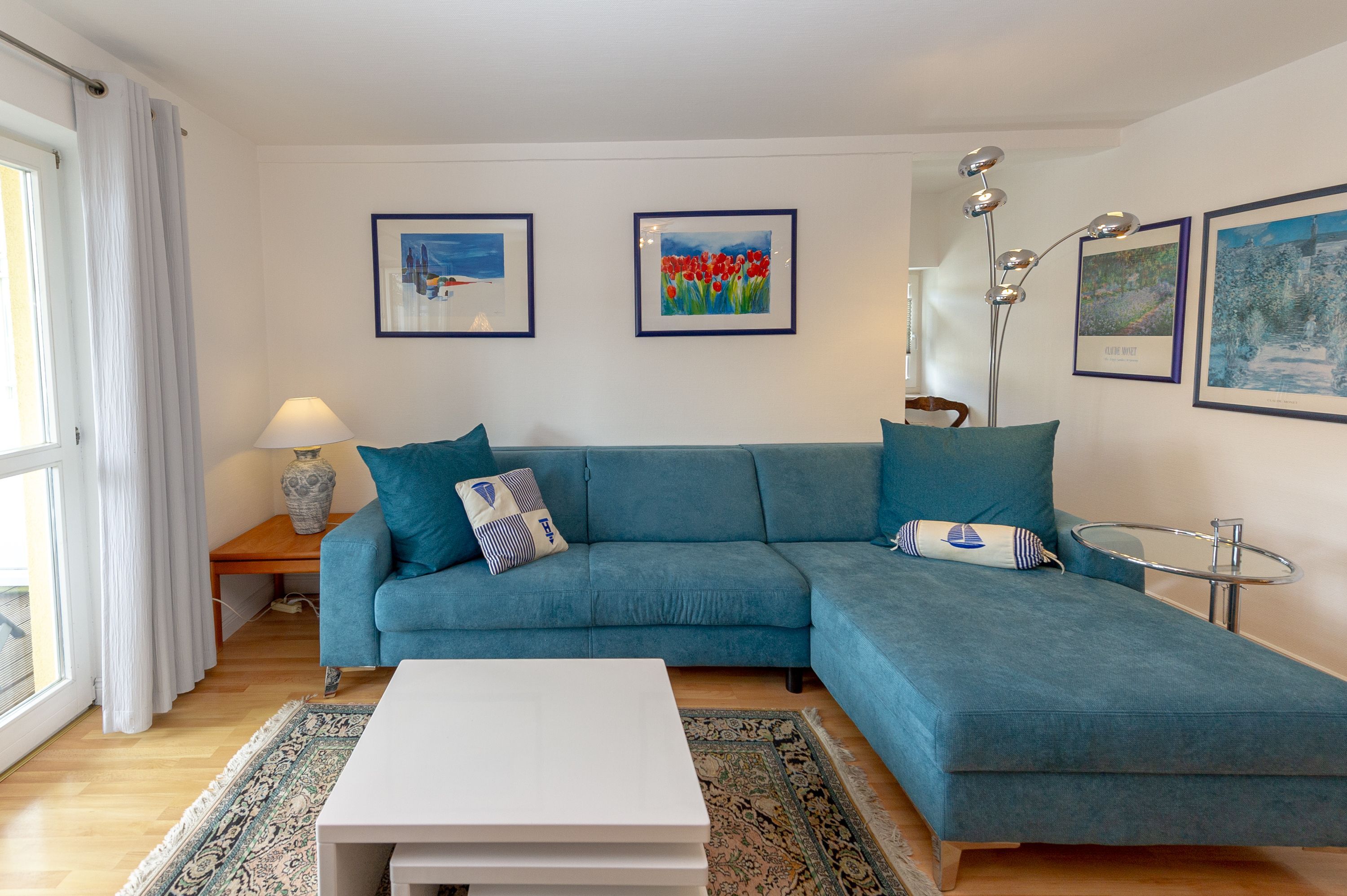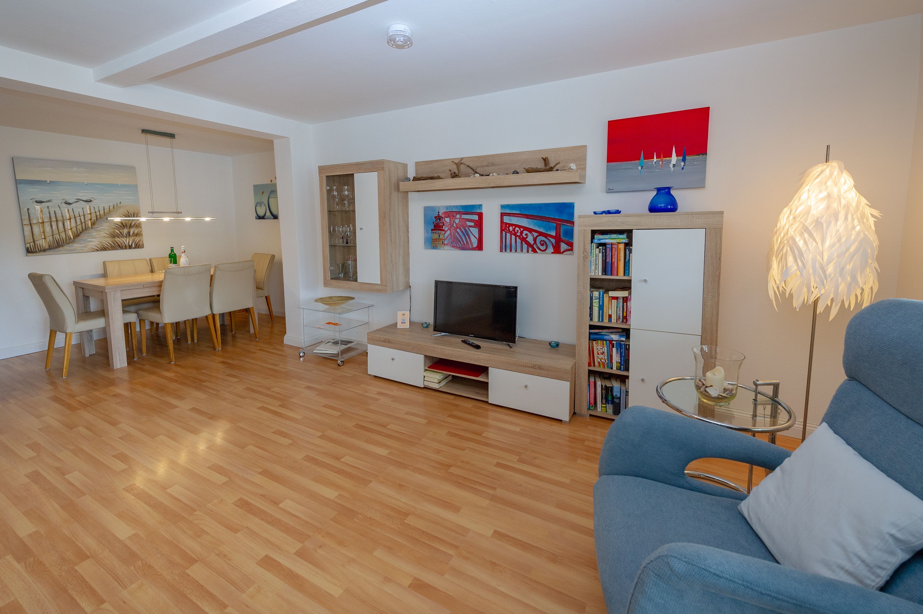 Über den Flur gelangen Sie in den modern und gemütlich ausgestatteten Wohnbereich mit einer bequemen Couchgarnitur, einem Relaxsessel, einem Flachbild-TV, Büchern zum Schmökern und dem Esstisch. Die separate Küche bietet Ihnen mit einem 4-Zonen-Ceranherd inkl. Backofen und Dunstabzug, einem Kühlschrank mit Gefrierfach, einer Spülmaschine, Kaffeemaschine, Wasserkocher und Toaster alle Möglichkeiten zur bequemen Selbstverpflegung. Mehrere Bäckershops finden Sie in fußläufiger Entfernung. Speisen und relaxen können Sie natürlich auch wunderbar auf Ihren beiden Balkonen. Diese sind überdacht.