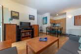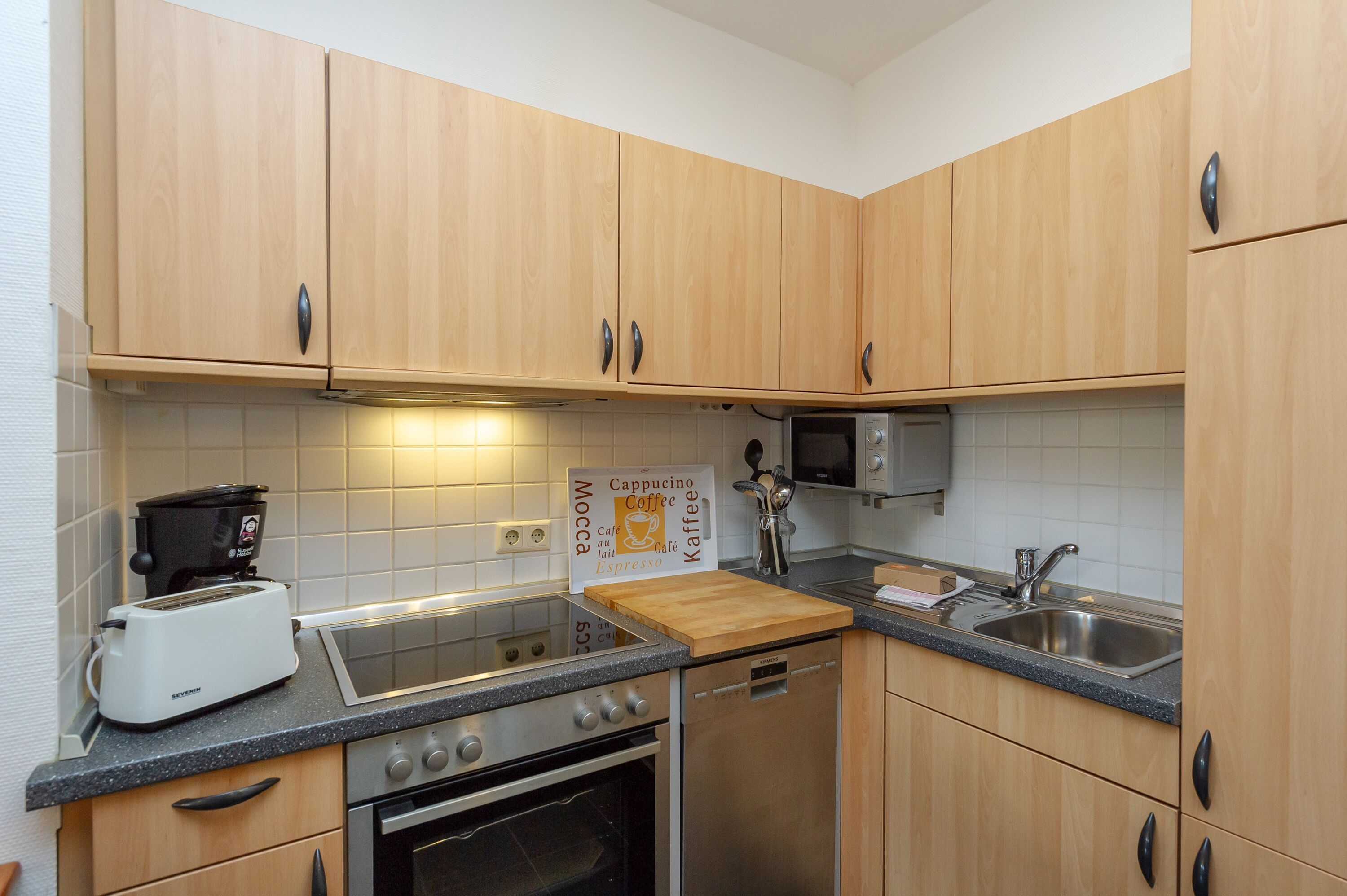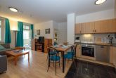 Der kombinierte Wohn- und Essbereich ist mit einer Schlafcouch, die als Aufbettung für zwei Personen genutzt werden kann, einem Flachbild-TV mit DVD-Player, einer Stereoanlage und einer kleinen Bücher- und Spieleauswahl ausgestattet. W-LAN ist kostenfrei verfügbar. In der offenen Küche finden Sie u.a. einen Kühlschrank mit Gefrierfach, eine Mikrowelle, einen Backofen, einen 4-Platten-Herd, eine Spülmaschine, eine Senseo-Kaffeemaschine, eine Filterkaffeemaschine, einen Toaster und weiteres Kleininventar, das die Küchenausstattung komplettiert.