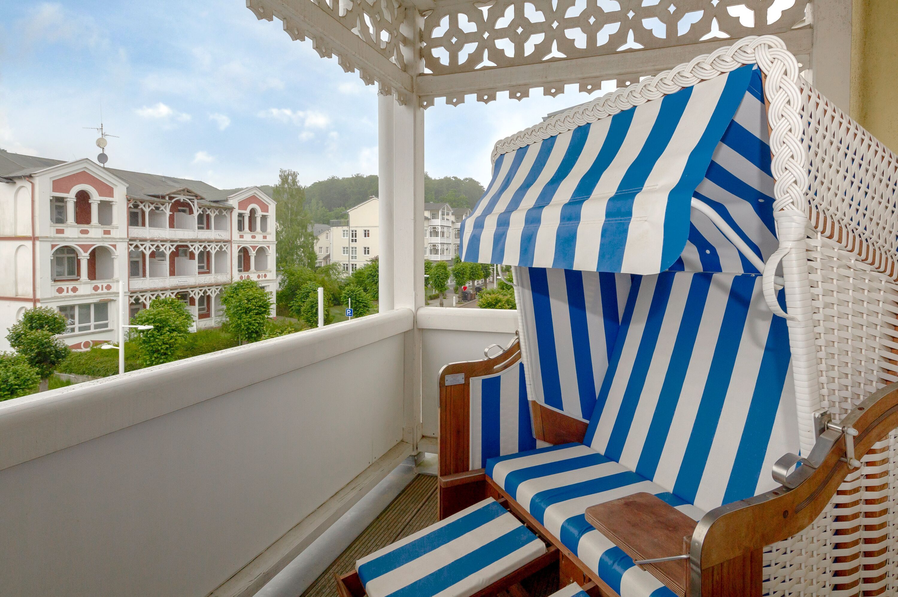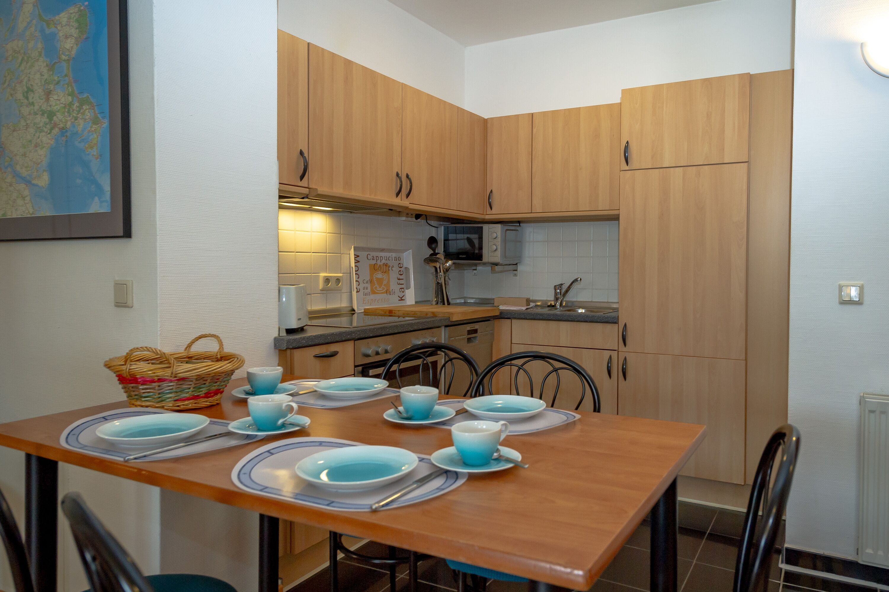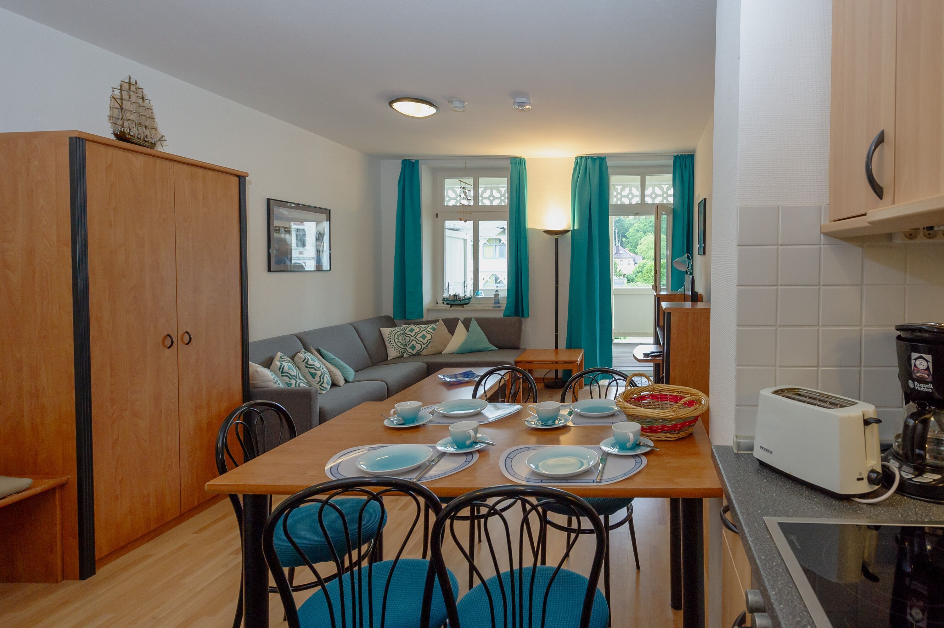 Speisen können Sie ganz nach Belieben entweder am großen Esstisch im Wohnzimmer oder auf dem Balkon. Zusätzlich zum Tisch mit Stühlen steht Ihnen dort als besonderes Extra sogar ein Strandkorb zum Einkuscheln zur Verfügung.