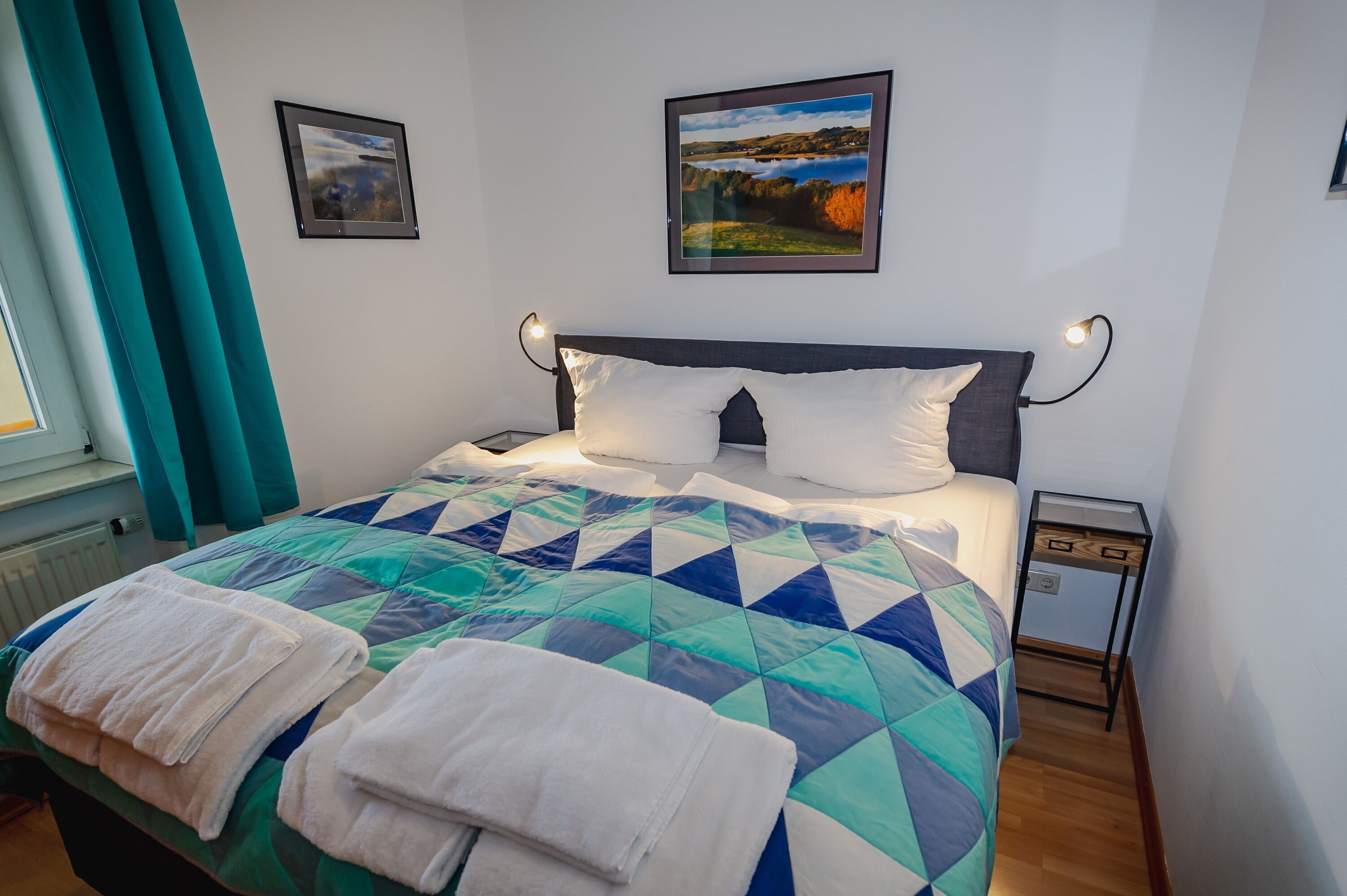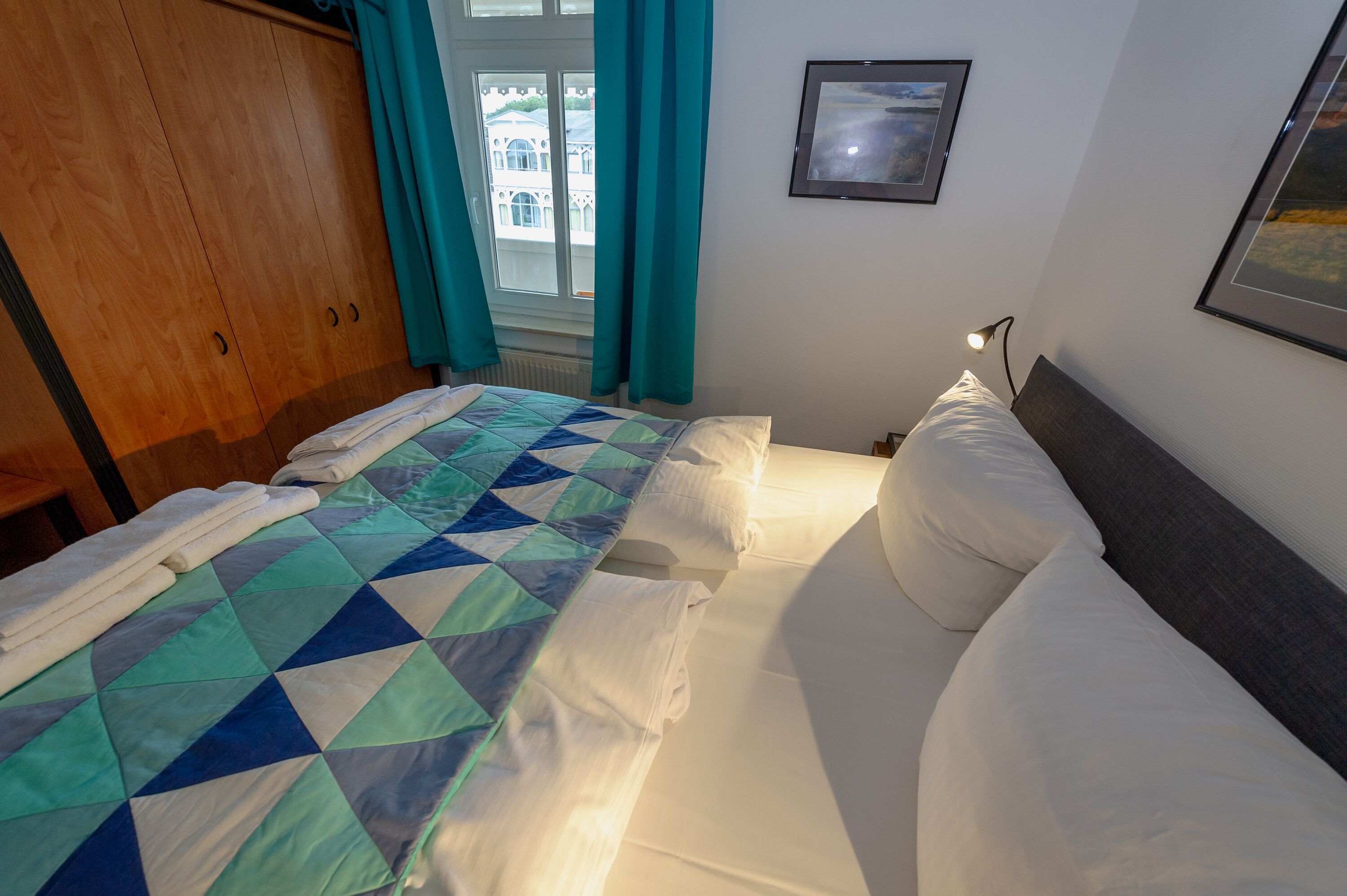 Im separaten Schlafzimmer erwarten Sie ein bequemes Doppelbett und ein Kleiderschrank für Ihre Urlaubsgarderobe. Gleich nebenan finden Sie das Badezimmer, ausgestattet mit Dusche/WC, Waschbecken, Spiegel und Fön.