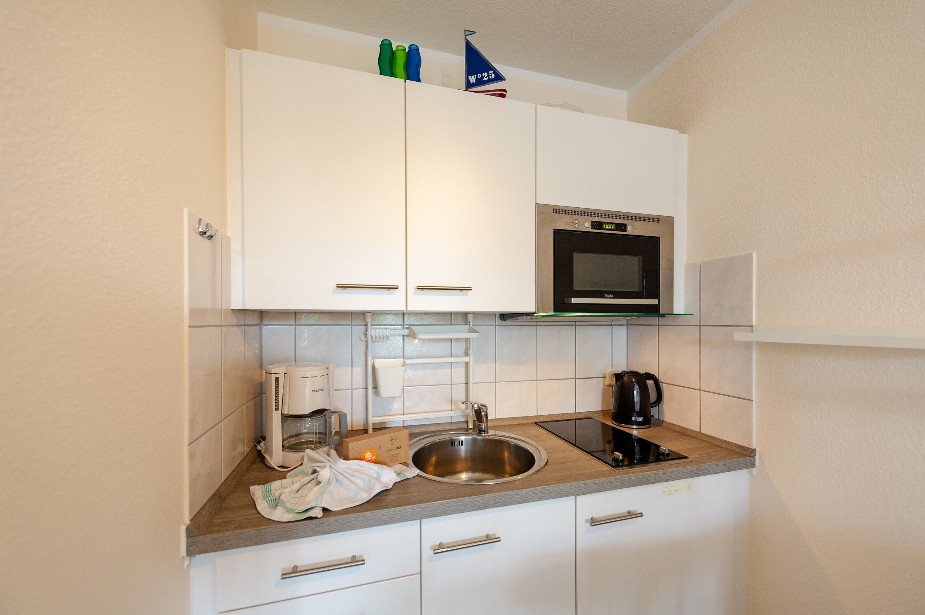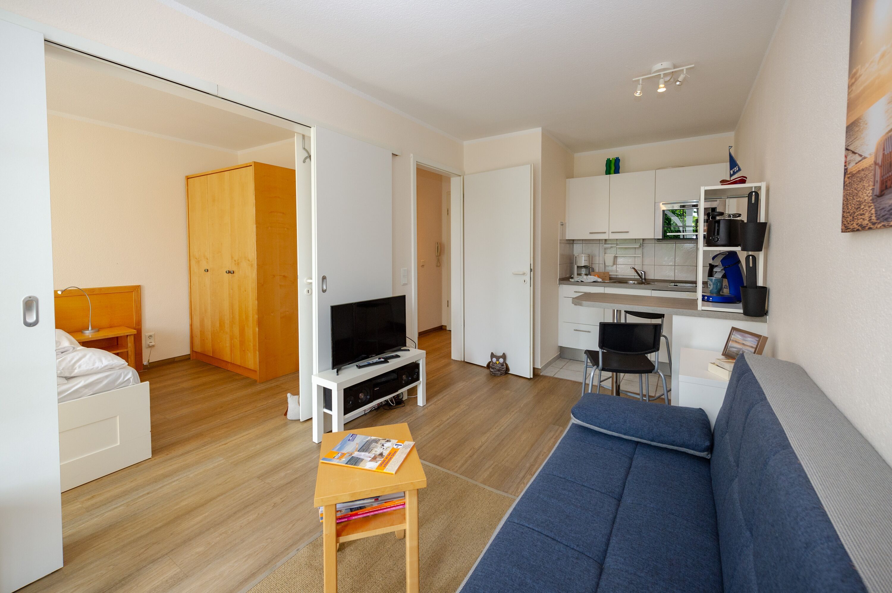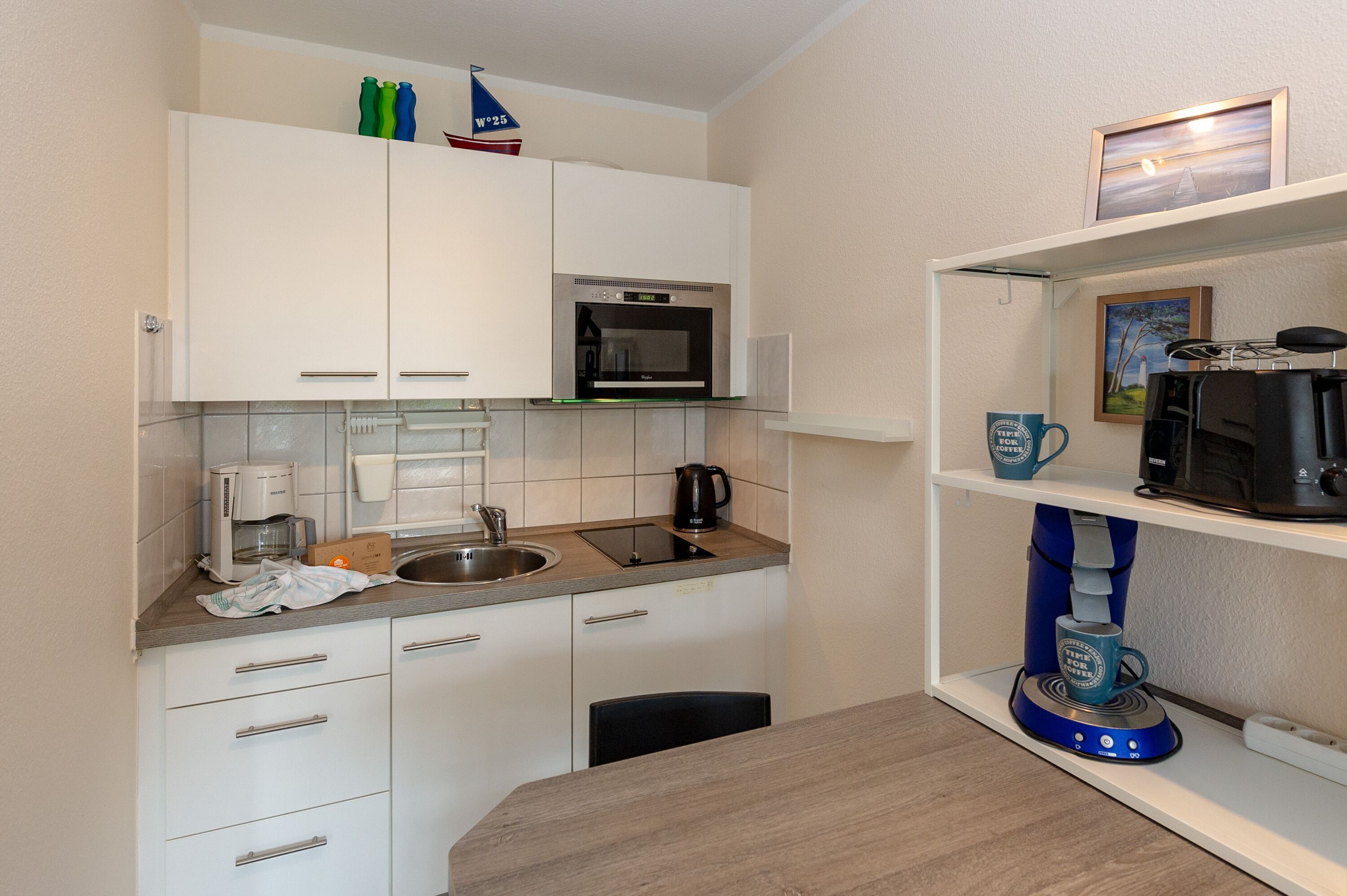 Herzlich Willkommen im gemütlichen Wohnbereich mit integrierter Küche und Ess-Theke für drei Personen. Für den guten Start in Ihren Urlaubstag sorgt ein entspanntes Frühstück mit frischen Brötchen vom Bäcker nebenan, krossen Toastbrot und duftendem, aromatischen Kaffee, je nach Ihrem Geschmack aus der Cafissimo Kapselmaschine oder aus der Standard Kaffeemaschine. Oder möchten Sie Ihren Lieblingstee aufbrühen? Dafür steht Ihnen ein Wasserkocher und eine Teekanne zur Verfügung. Nutzen Sie die Mikrowelle, den Kühlschrank mit Gefrierfach und die zahlreichen Küchenutensilien für die Kreation Ihrer Mahlzeiten.