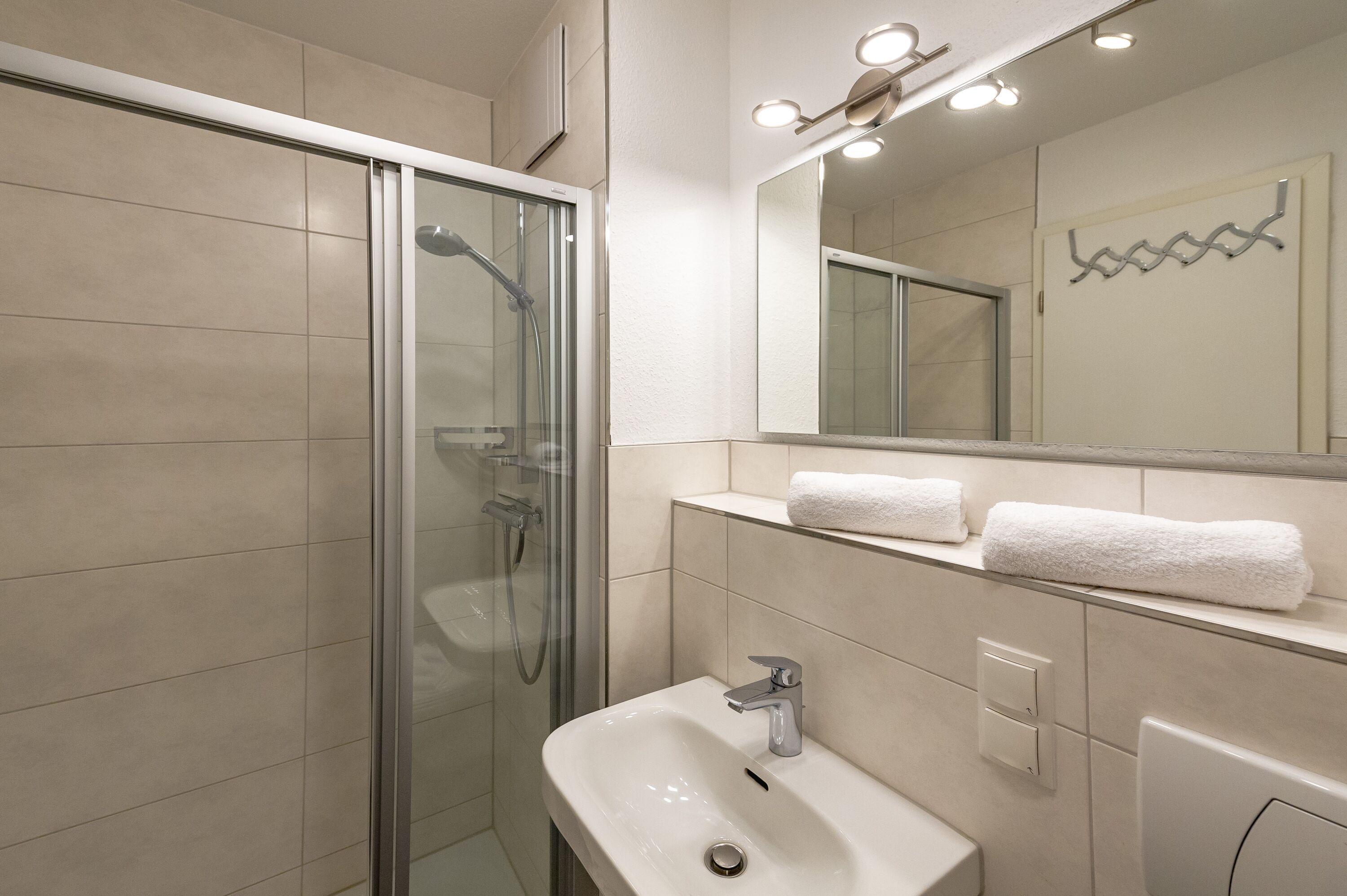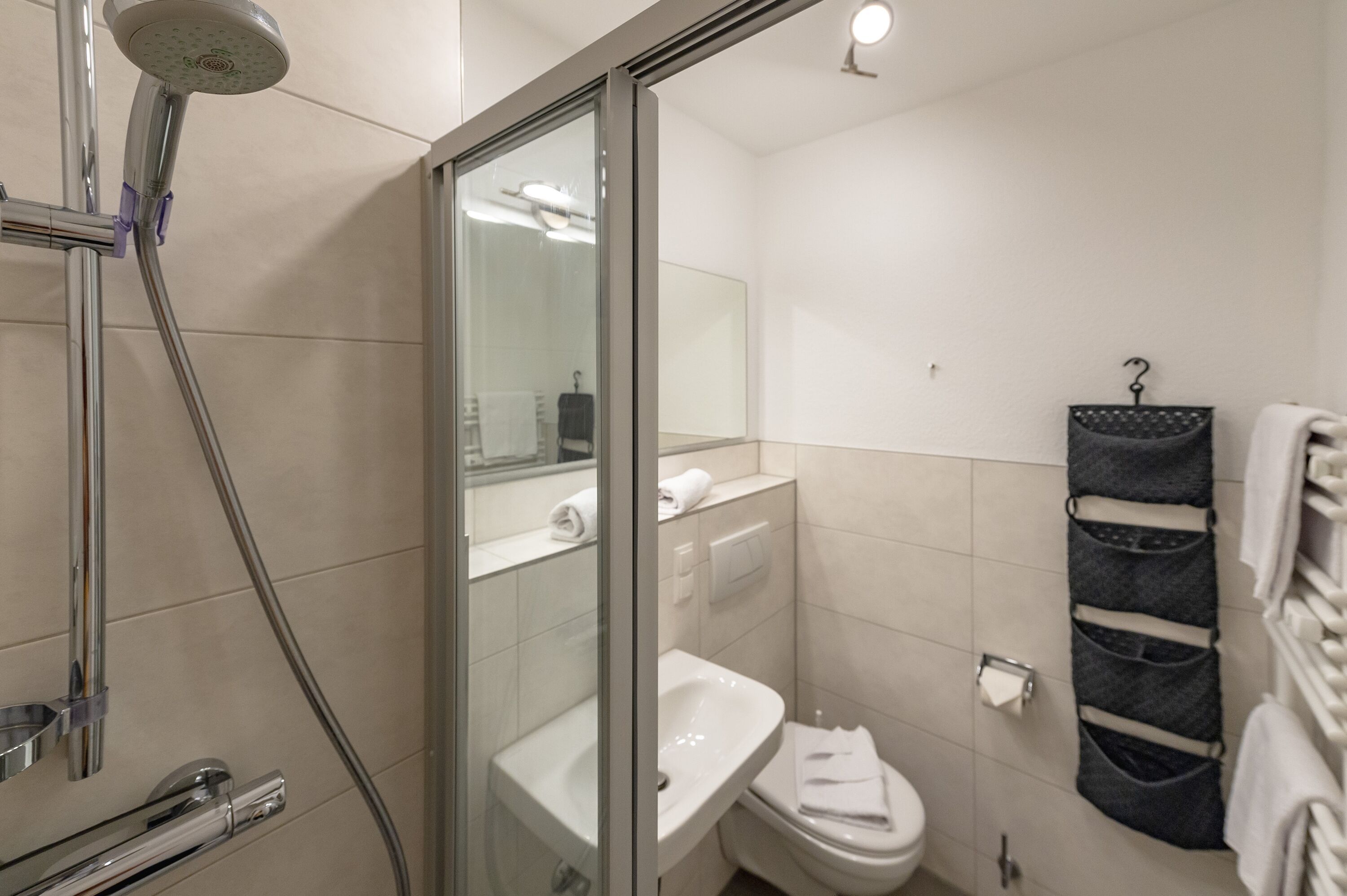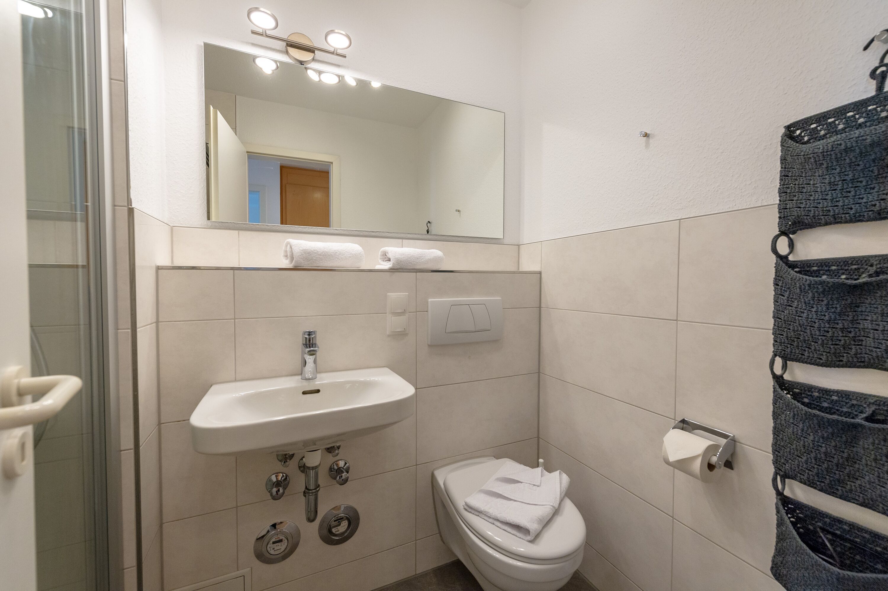 Die Wohlfühloase der Wohnung ist das moderne Duschbad mit großer Dusche, WC, beheizbarem Handtuchhalter und Fön.