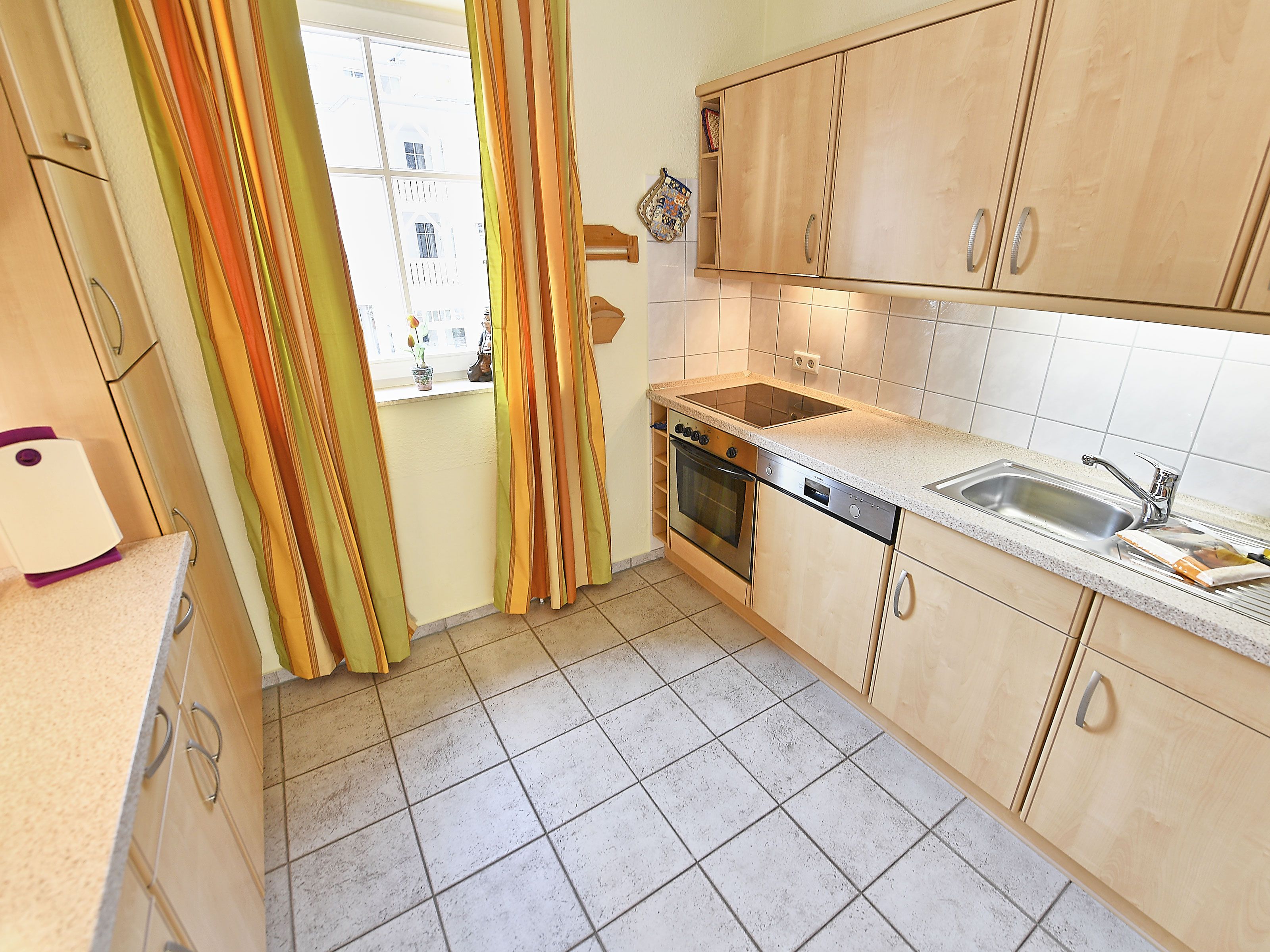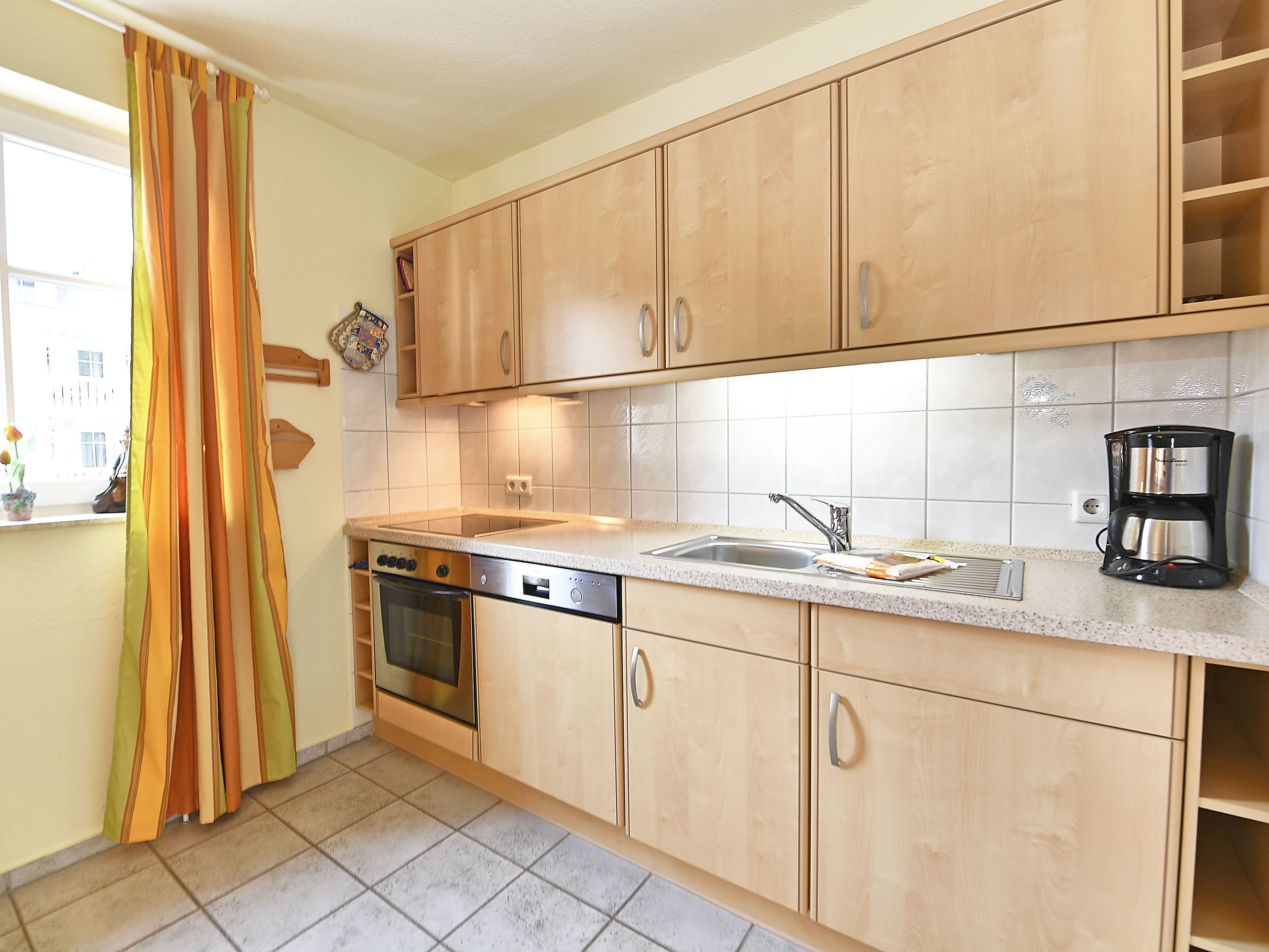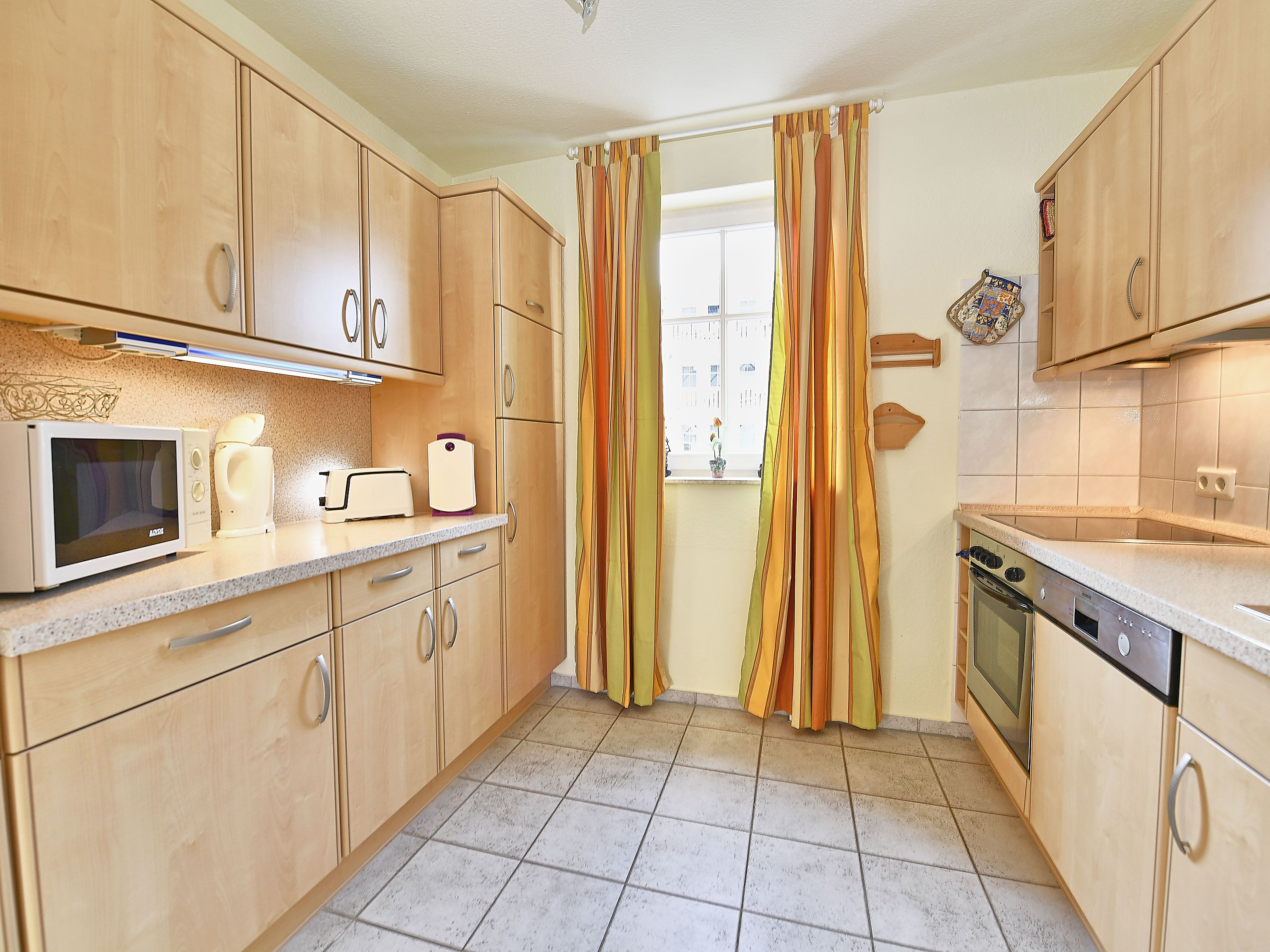 Die separate Küche ist komplett ausgestattet mit einem 4-Zonen-Cerankochfeld, einem Backofen, einem großen Kühlschrank mit Tiefkühlfach, einer Mikrowelle, einer Geschirrspülmaschine und diversem Kleininventar.