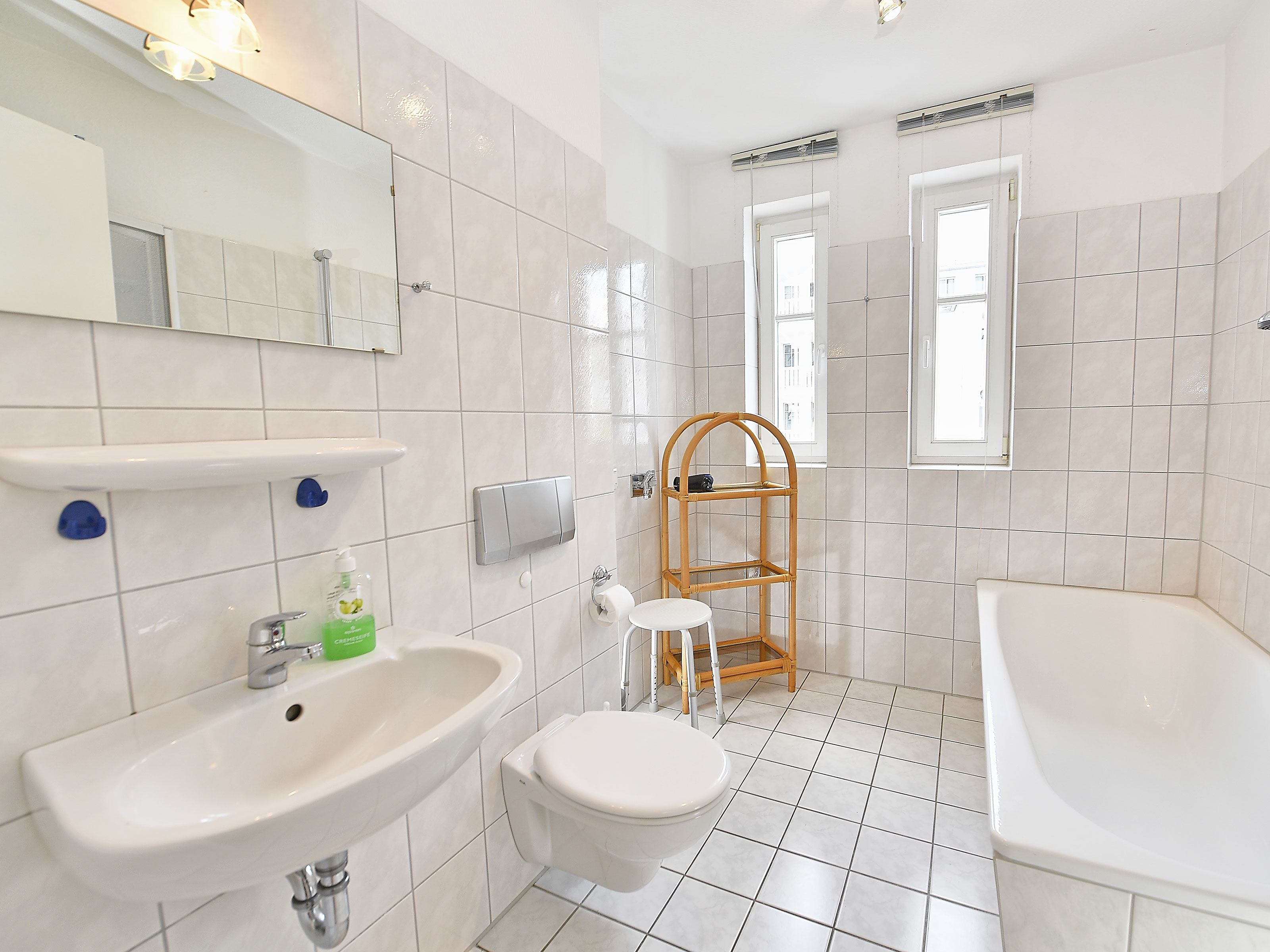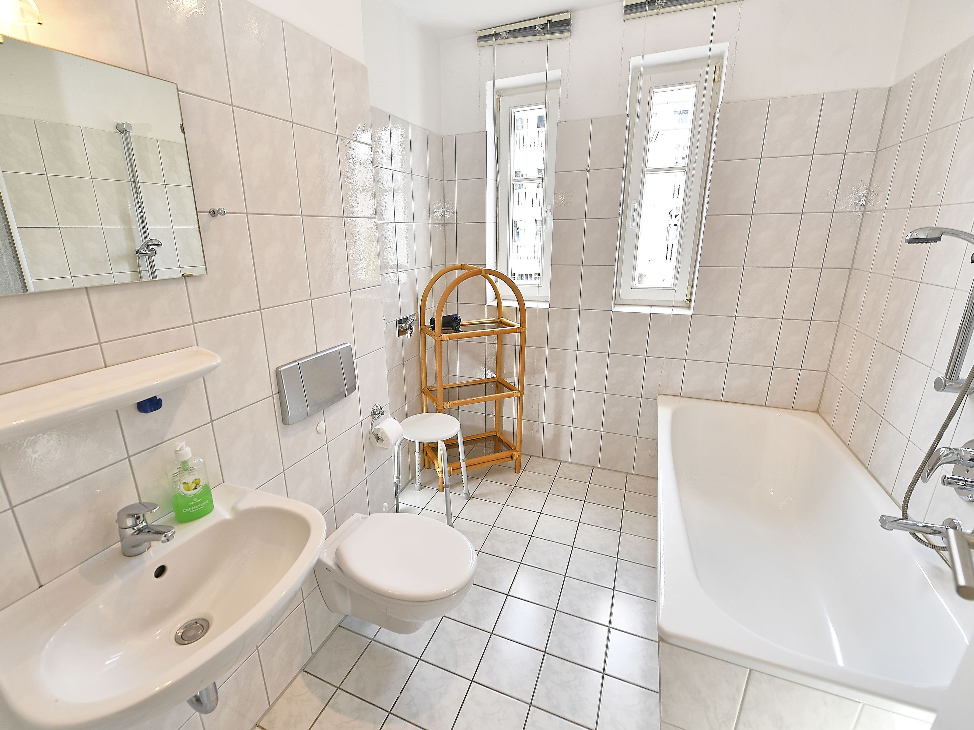 Das moderne Bad hat eine Badewannen/Duschkombination, WC und Waschbecken.