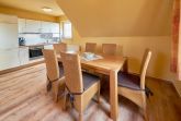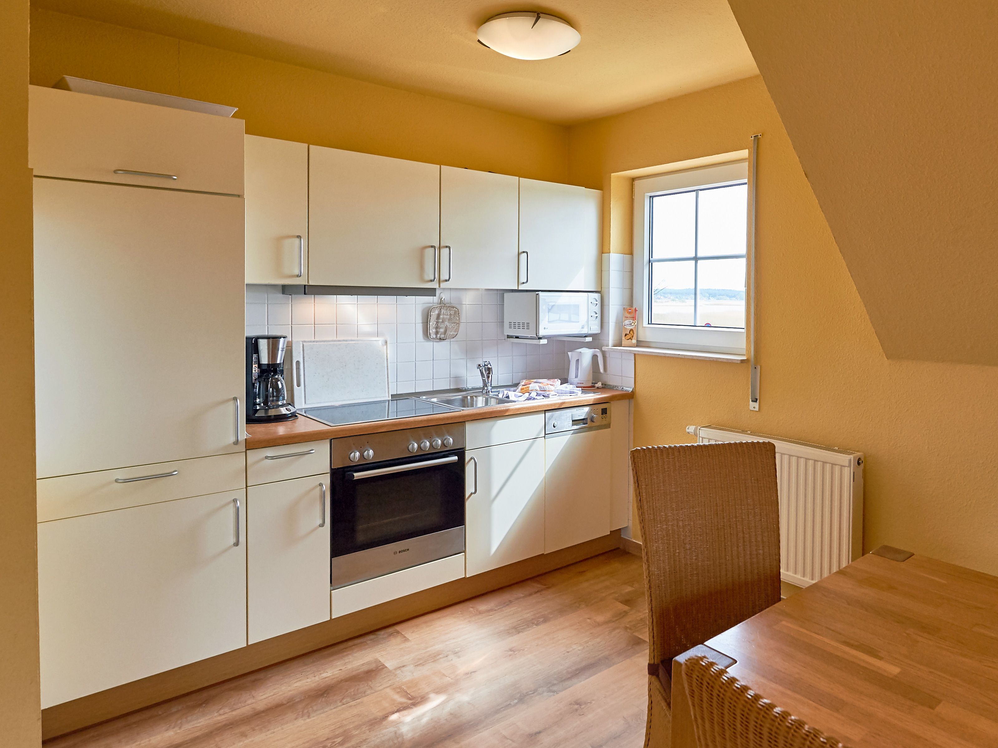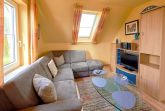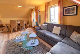 Der elegante Wohnbereich ist mit einer gemütlichen Couch (als Aufbettung für 2 Personen nutzbar), TV, Stereoanlage mit CD-Player und einem Esstisch für 6 Personen eingerichtet. Internet per W-LAN steht Ihnen selbstverständlich zur Verfügung. In der harmonisch im Wohnbereich integrierten Küchenzeile finden Sie einen Kühlschrank mit Gefrierfach, einen Backofen, ein 4-Platten-Cerankochfeld, eine Spülmaschine vor und diverses Kleininventar, das die Küchenausstattung komplettiert.