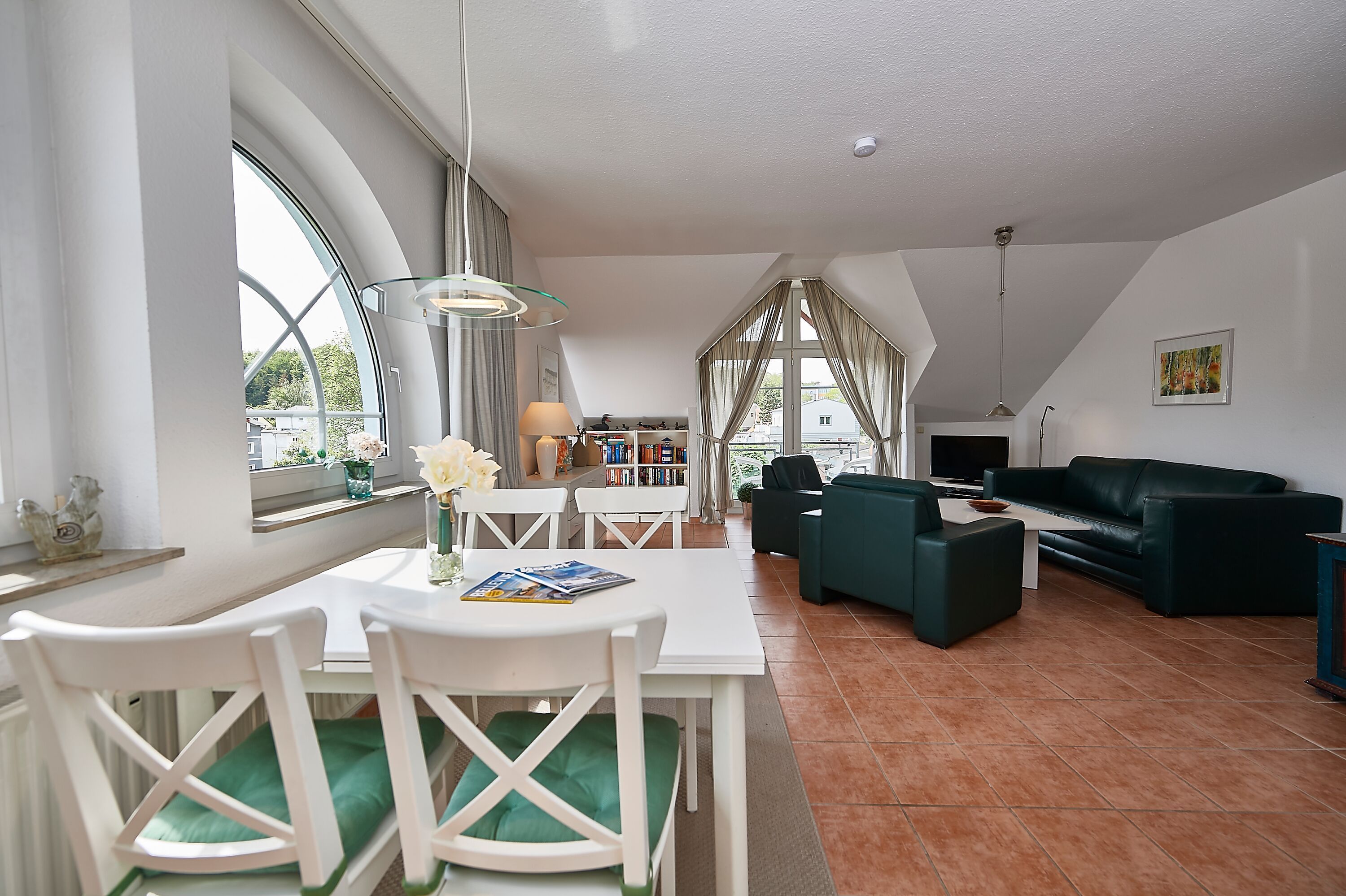 Appartement 18: Dieses sonnige 2-Raum-Appartement mit 64 qm Wohnfläche erwartet Sie im Dachgeschoss des Hauses. Über den geräumigen Flur gelangen Sie in das große, gemütliche Wohnzimmer mit Flachbild-TV, Stereo-Anlage, zwei gemütlichen Sessel und einer großzügigen Couch, die als Aufbettung für eine Personen genutzt werden kann. Durch die leichten Dachschrägen entsteht eine romantische Atmosphäre.