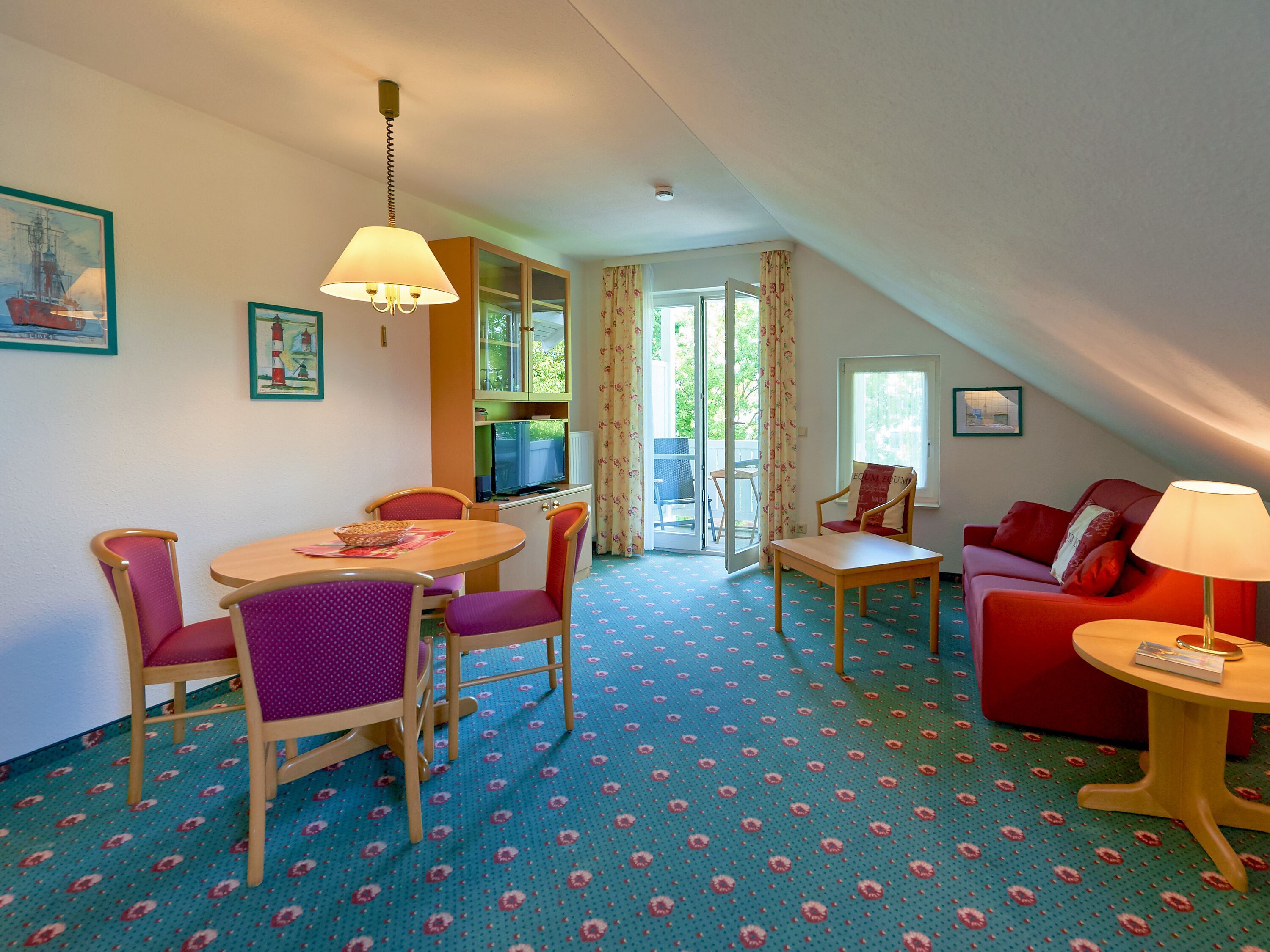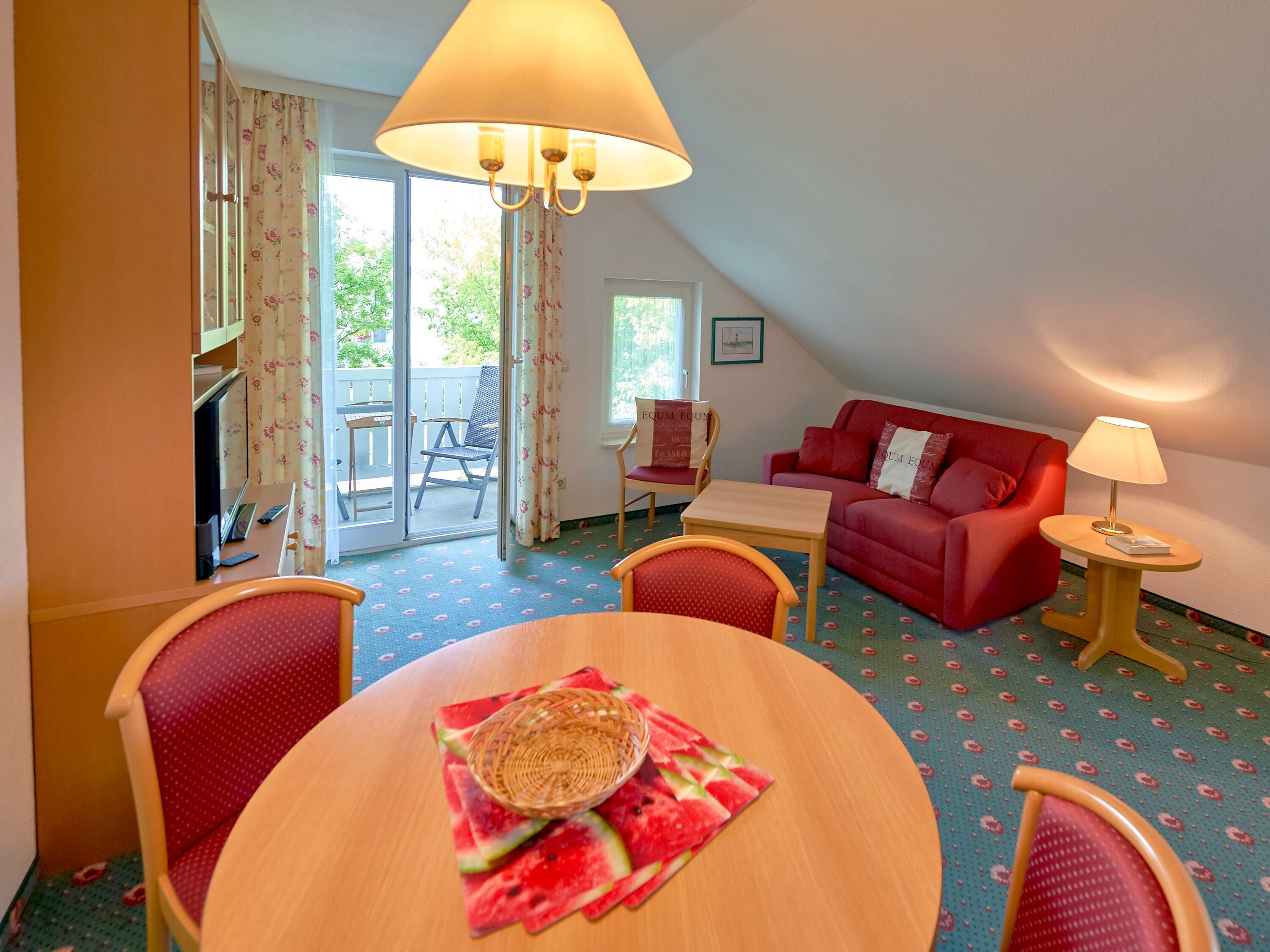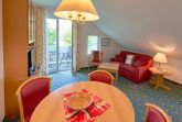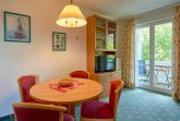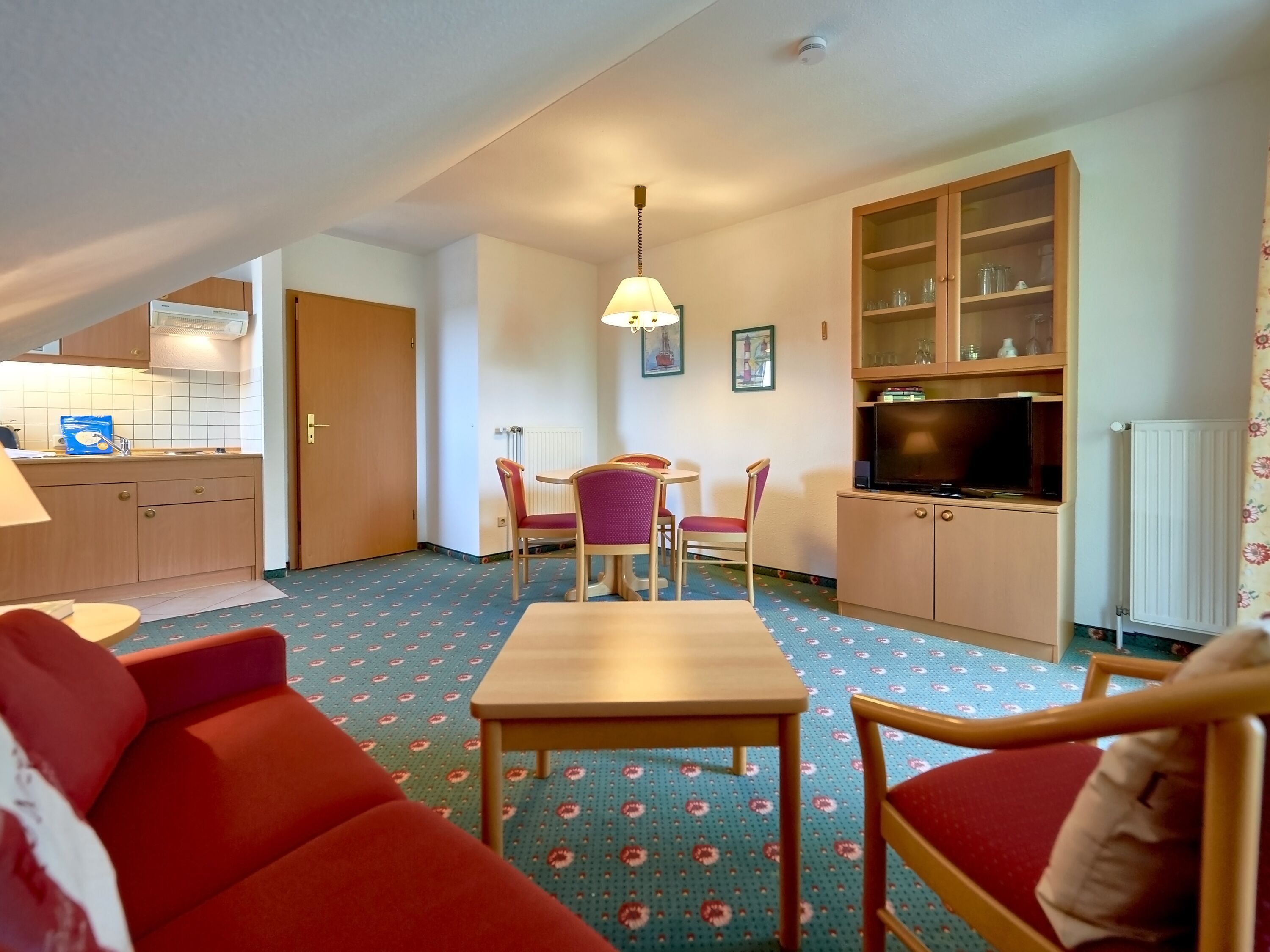 Das kombinierte Wohn-/Esszimmer verfügt über eine Couch, einen Flachbild-TV, eine Stereoanlage mit Radio/CD-Player und einen Esstisch. Die in den Wohnbereich integrierte Küchenzeile ist ausgestattet mit einem Kühlschrank mit Gefrierfach, einer Mikrowelle, einem 2-Platten-Herd sowie Wasserkocher, Kaffeemaschine, Toaster und diversem Kleininventar, das die Küchenausstattung komplettiert.