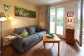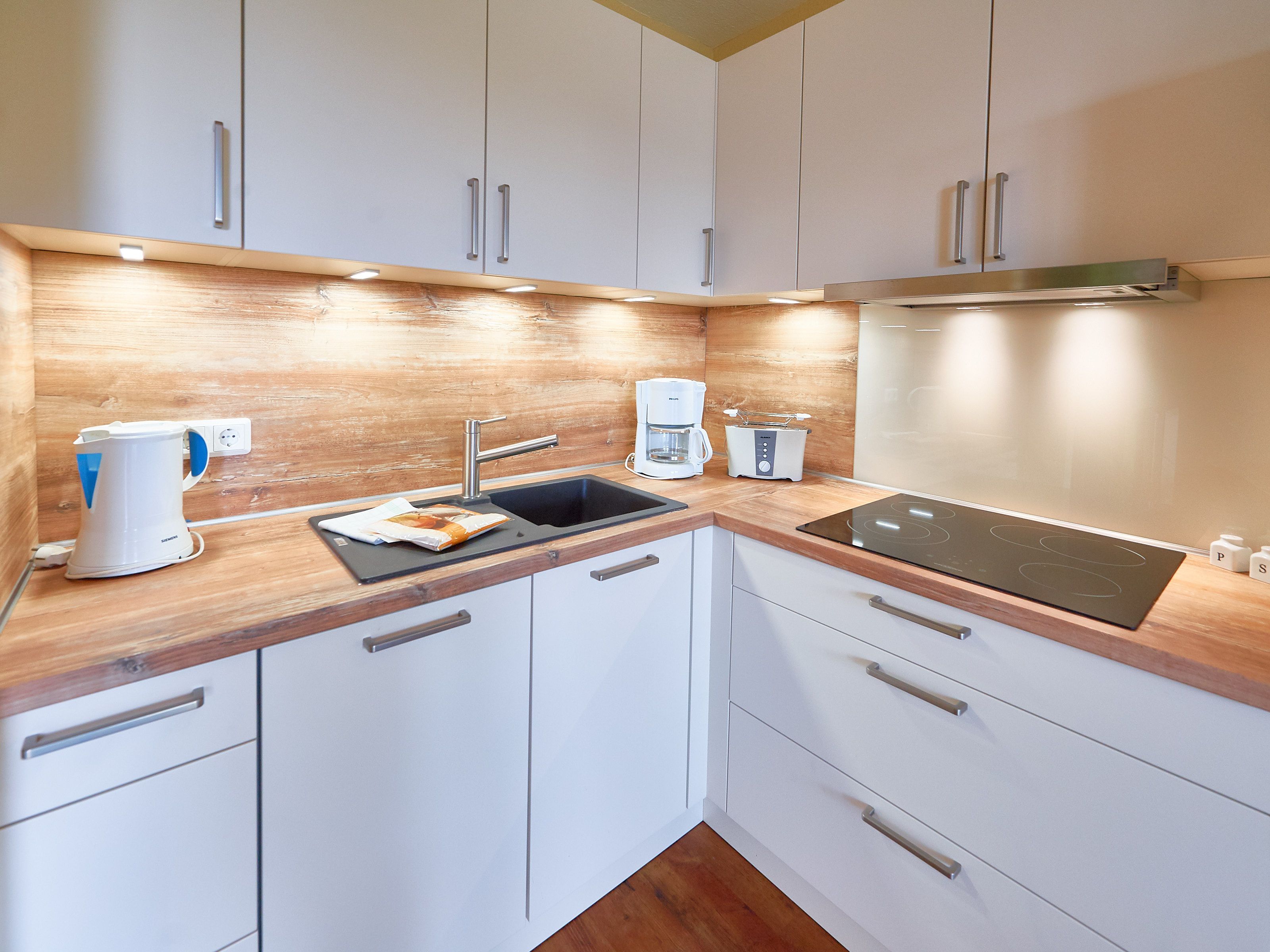 Das behaglich gestaltete Wohnzimmer ist mit einem Esstisch für 4 Personen, einer bequemen Schlafcouch (Aufbettungsmöglichkeit für zwei Personen) einem Flachbild-TV, einer Mini-Stereoanlage mit Radio/CD-Player und der harmonisch in den Raum integrierten Küchenzeile eingerichtet. Hier finden Sie u.a. einen Kühlschrank mit Gefrierfach, ein 4-Platten-Cerankochfeld nebst Backofen, einen Geschirrspüler, Wasserkocher, Kaffeemaschine, Toaster und natürlich diverses Kleininventar, das die Küchenausstattung komplettiert.