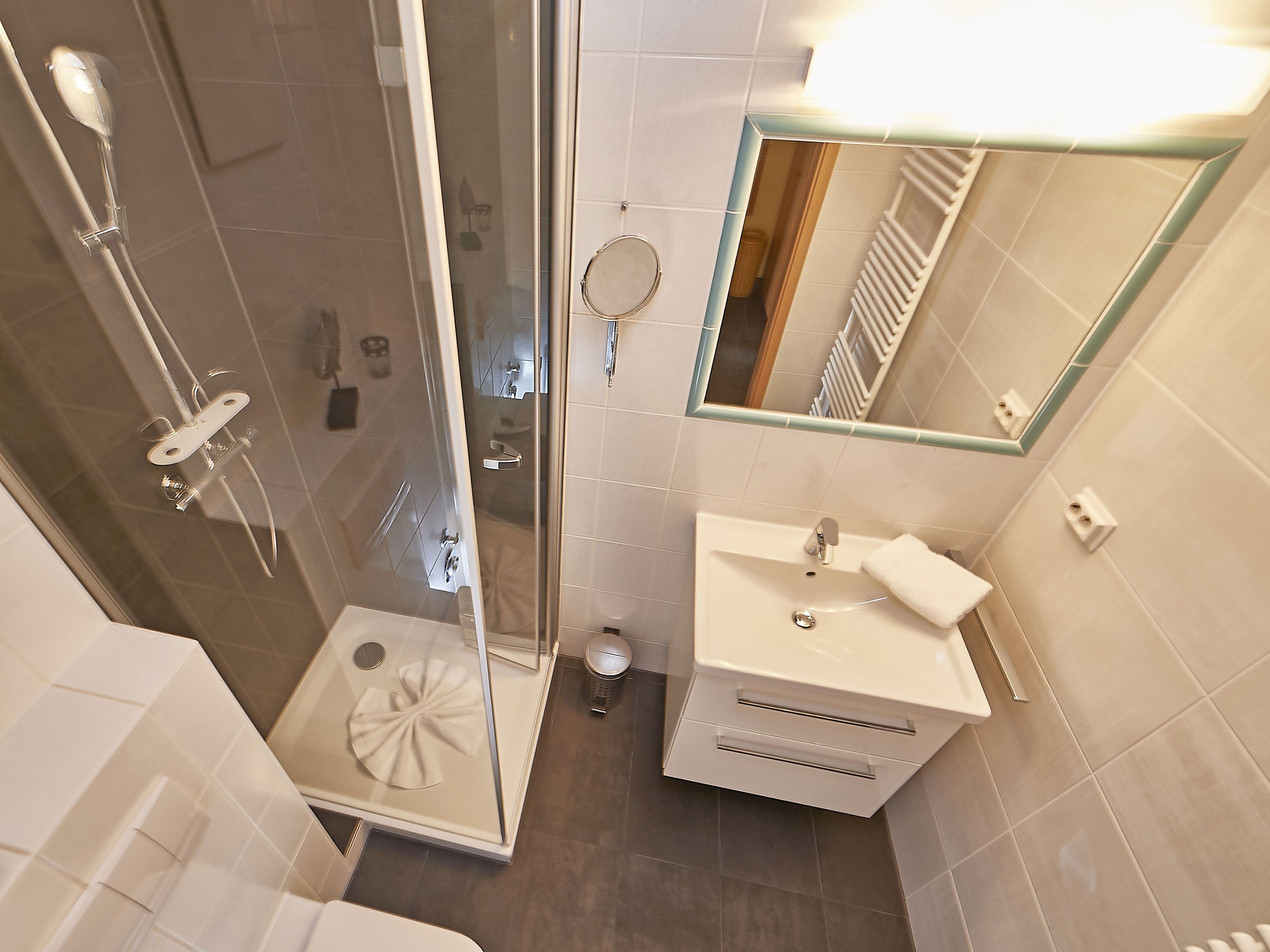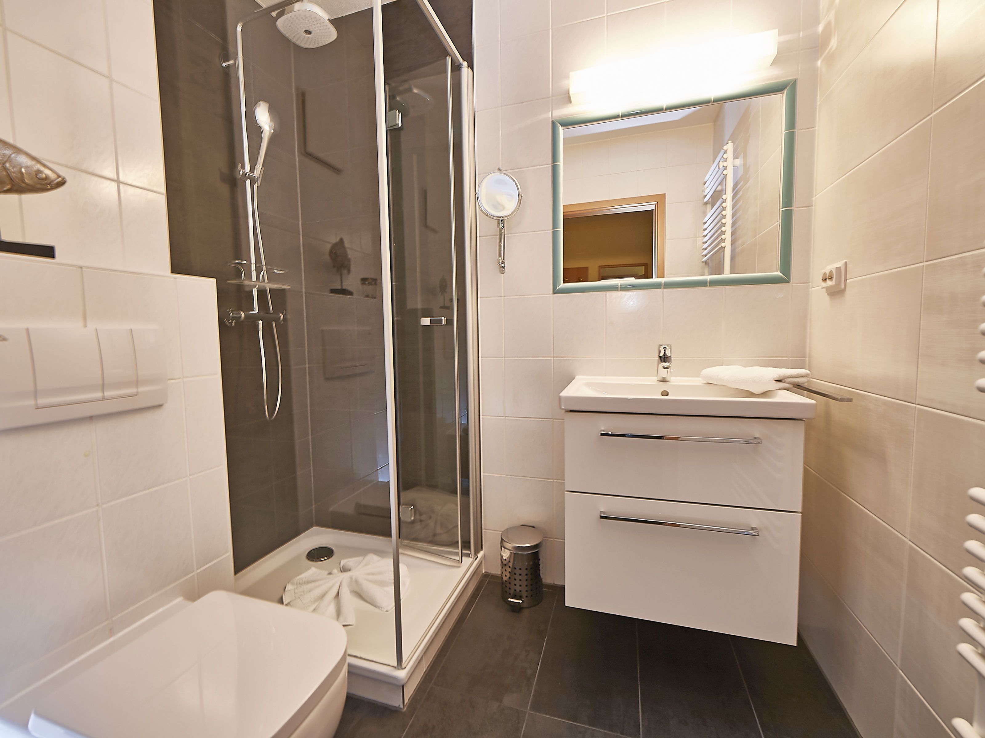 Im separaten Schalzimmer steht Ihnen ein komfortables Doppelbett und ein Kleiderschrank mit ausreichend Platz für die Urlaubsgarderobe zur Verfügung. Auch im Flur gibt es entsprechende Ablagemöglichkeiten. Das innenliegende Badezimmer ist mit Dusche/WC und einem Waschtisch inkl. Kosmetikspiegel ausgestattet.