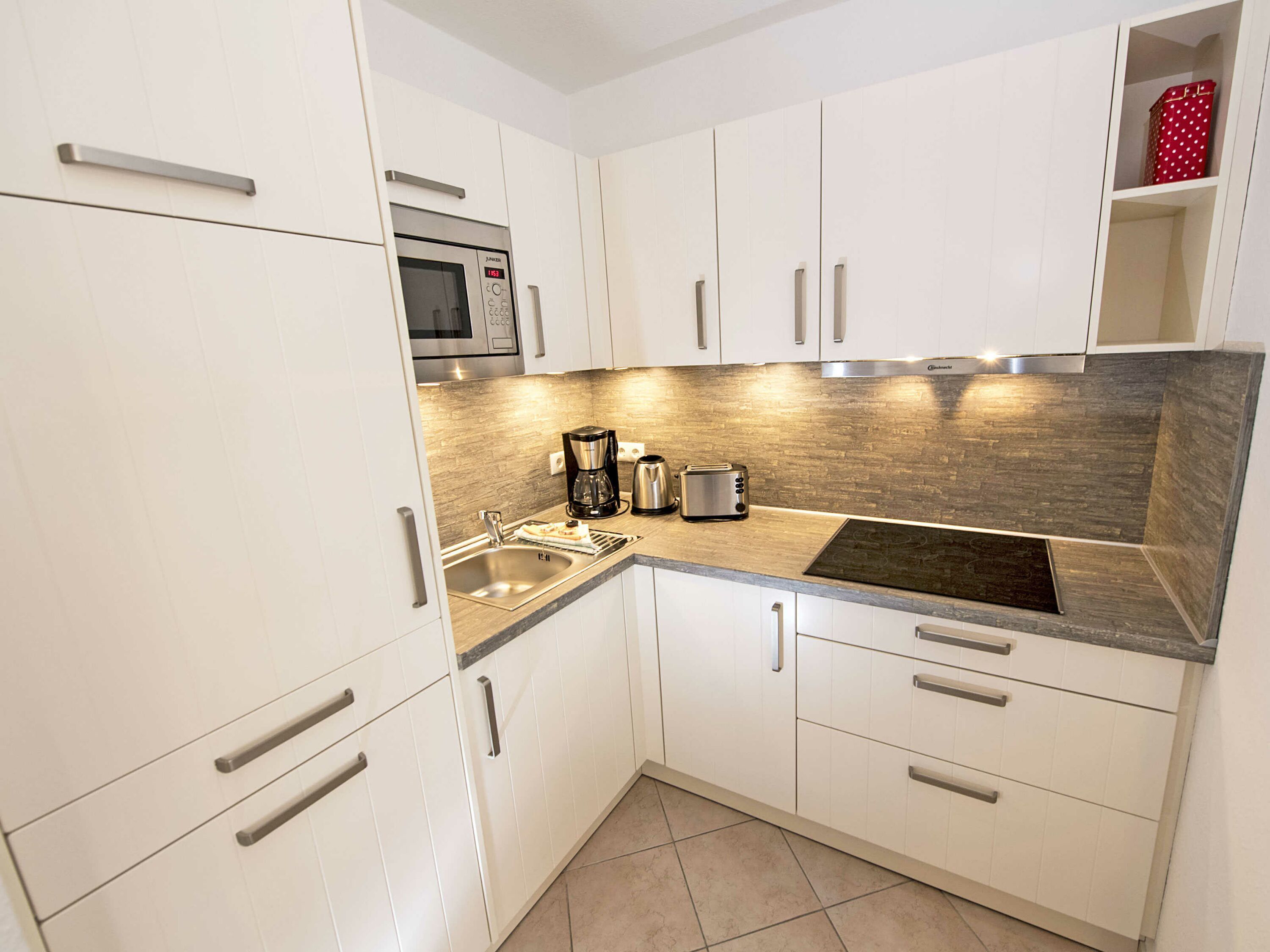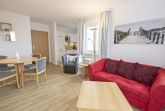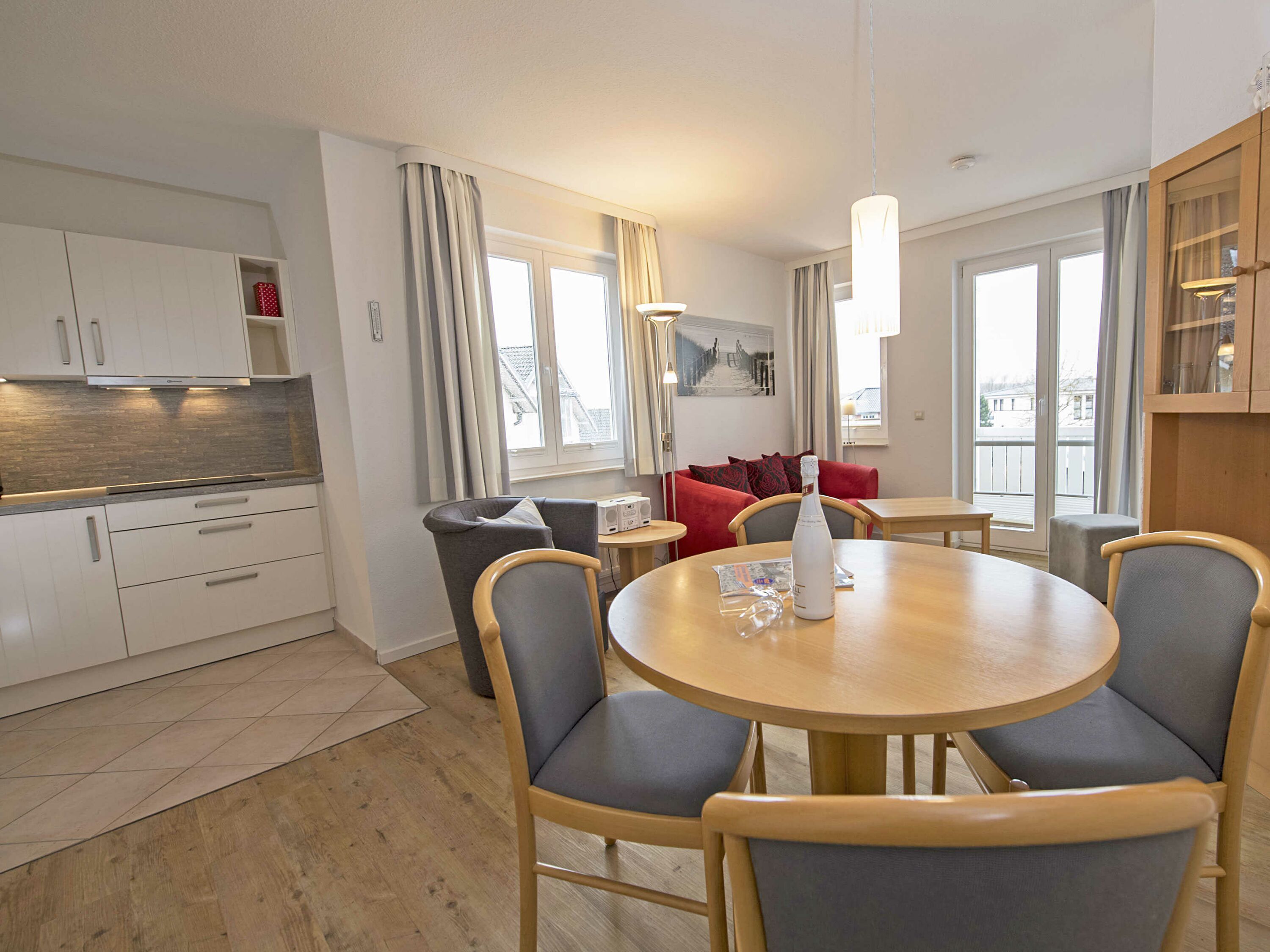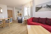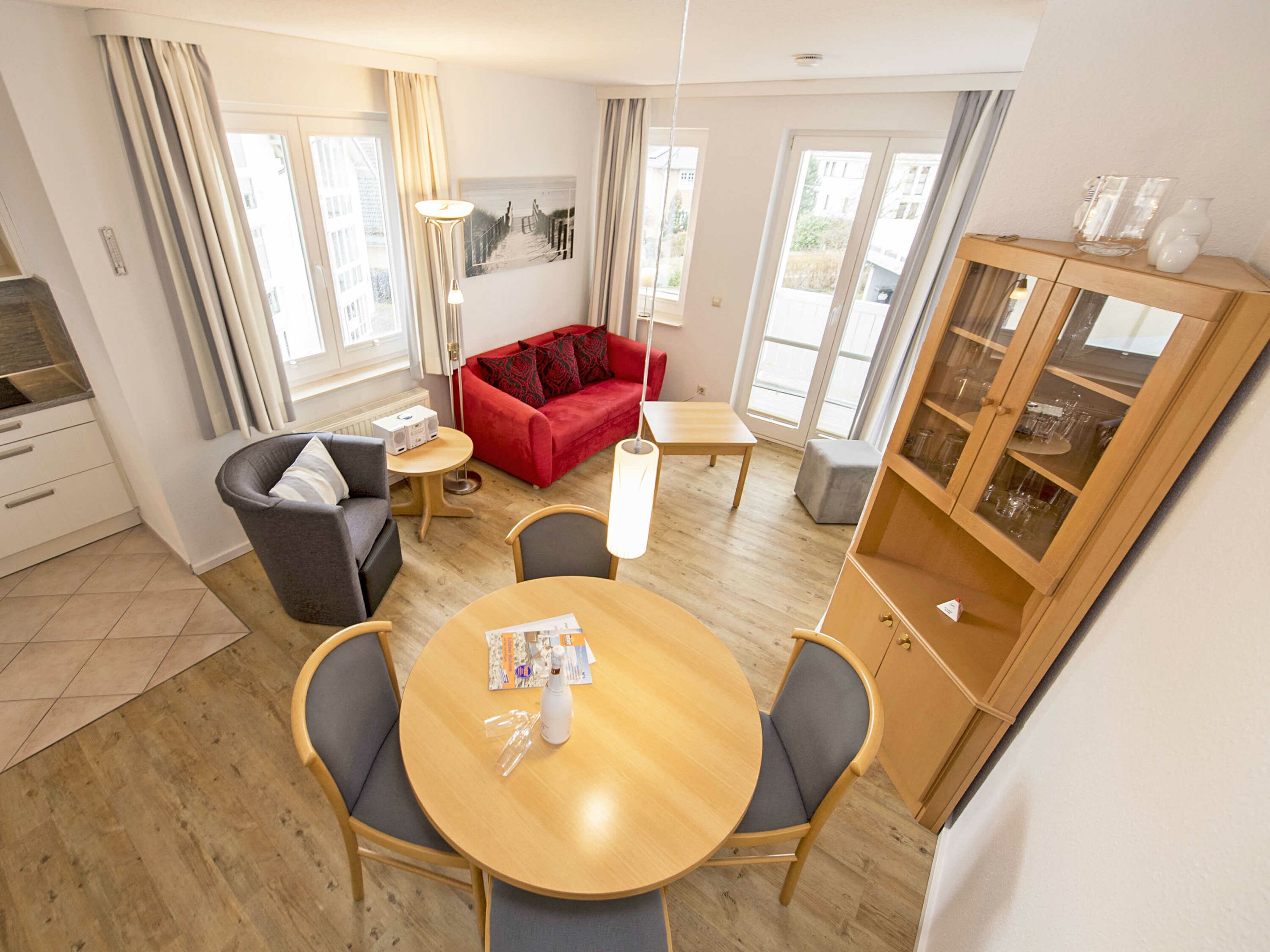 Der Wohnraum verfügt über einen Esstisch, einen Sessel und eine Schlafcouch, die als Aufbettung für 1 Person genutzt werden kann, eine Mini-Stereoanlage mit CD-Player, einen Flachbild-TV und eine im Wohnbereich harmonisch integrierte Küchenzeile. Diese ist ausgestattet mit einem Kühlschrank mit Gefrierfach, einer Mikrowelle, einem Cerankochfeld, Wasserkocher, Kaffeemaschine, Toaster und diversem Kleininventar, das die Küchenausstattung komplettiert.