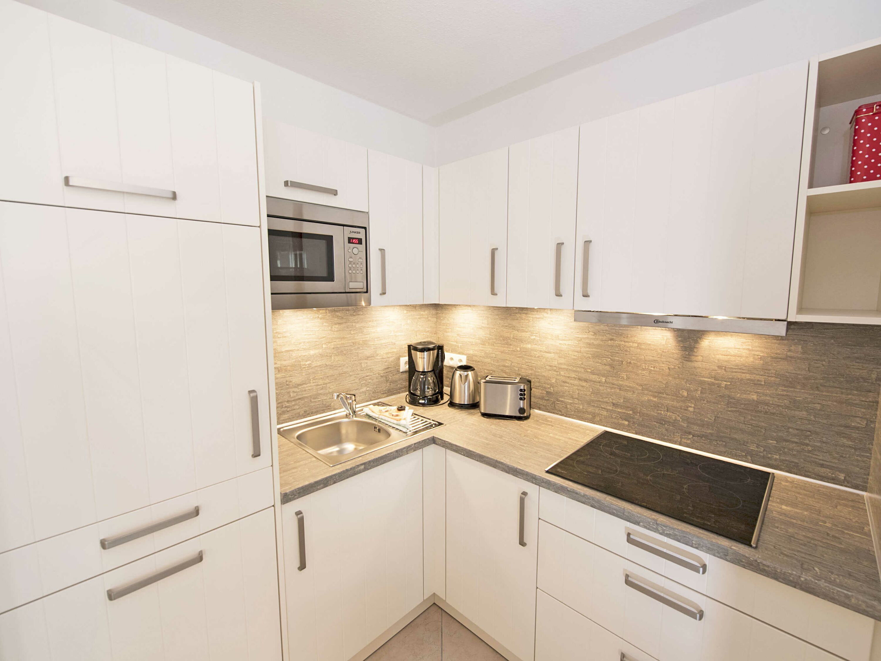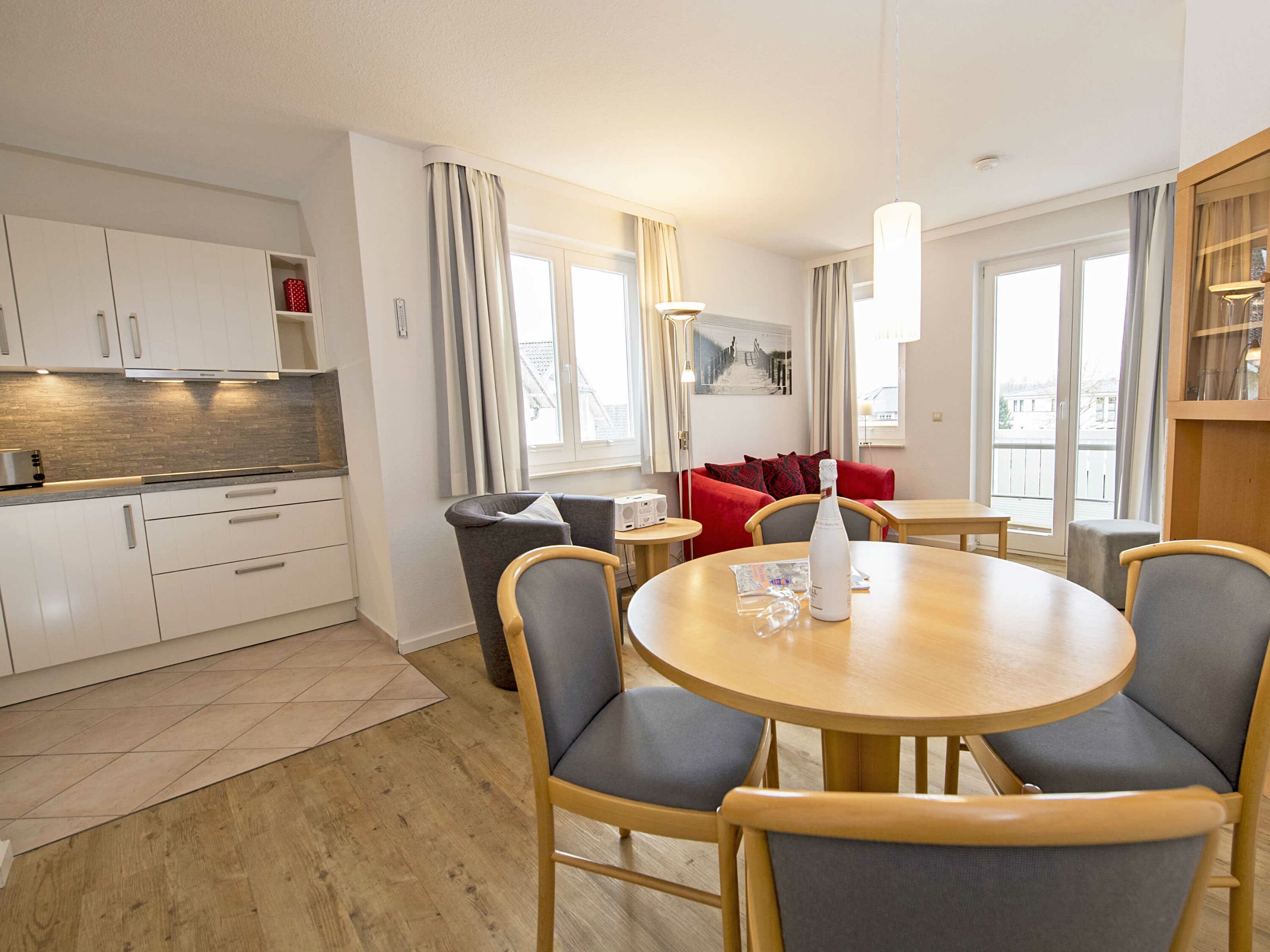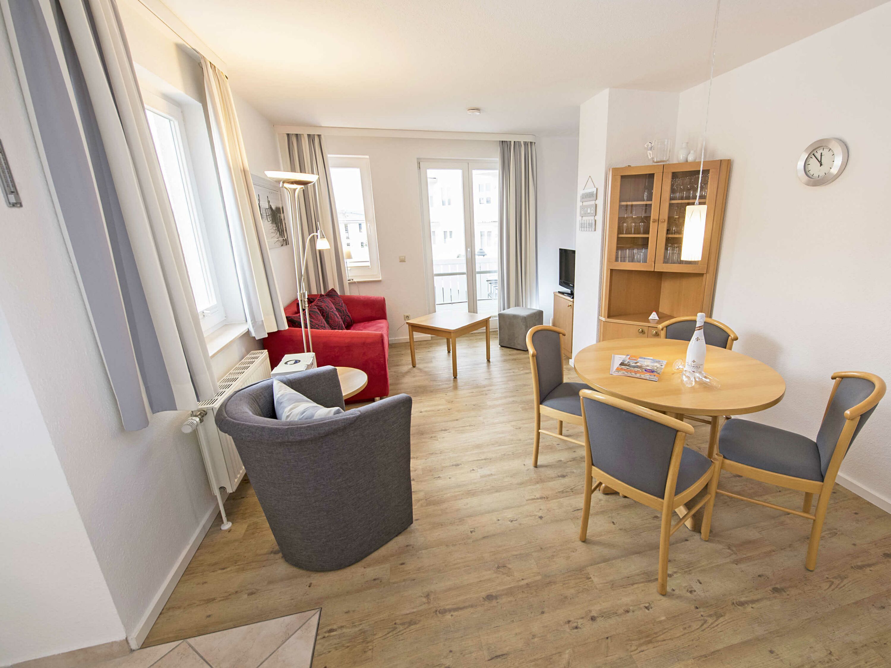 Der Wohnraum verfügt über einen Esstisch, einen Sessel und eine Schlafcouch, die als Aufbettung für 1 Person genutzt werden kann, eine Mini-Stereoanlage mit CD-Player, einen Flachbild-TV und eine im Wohnbereich harmonisch integrierte Küchenzeile. Diese ist ausgestattet mit einem Kühlschrank mit Gefrierfach, einer Mikrowelle, einem Cerankochfeld, Wasserkocher, Kaffeemaschine, Toaster und diversem Kleininventar, das die Küchenausstattung komplettiert.