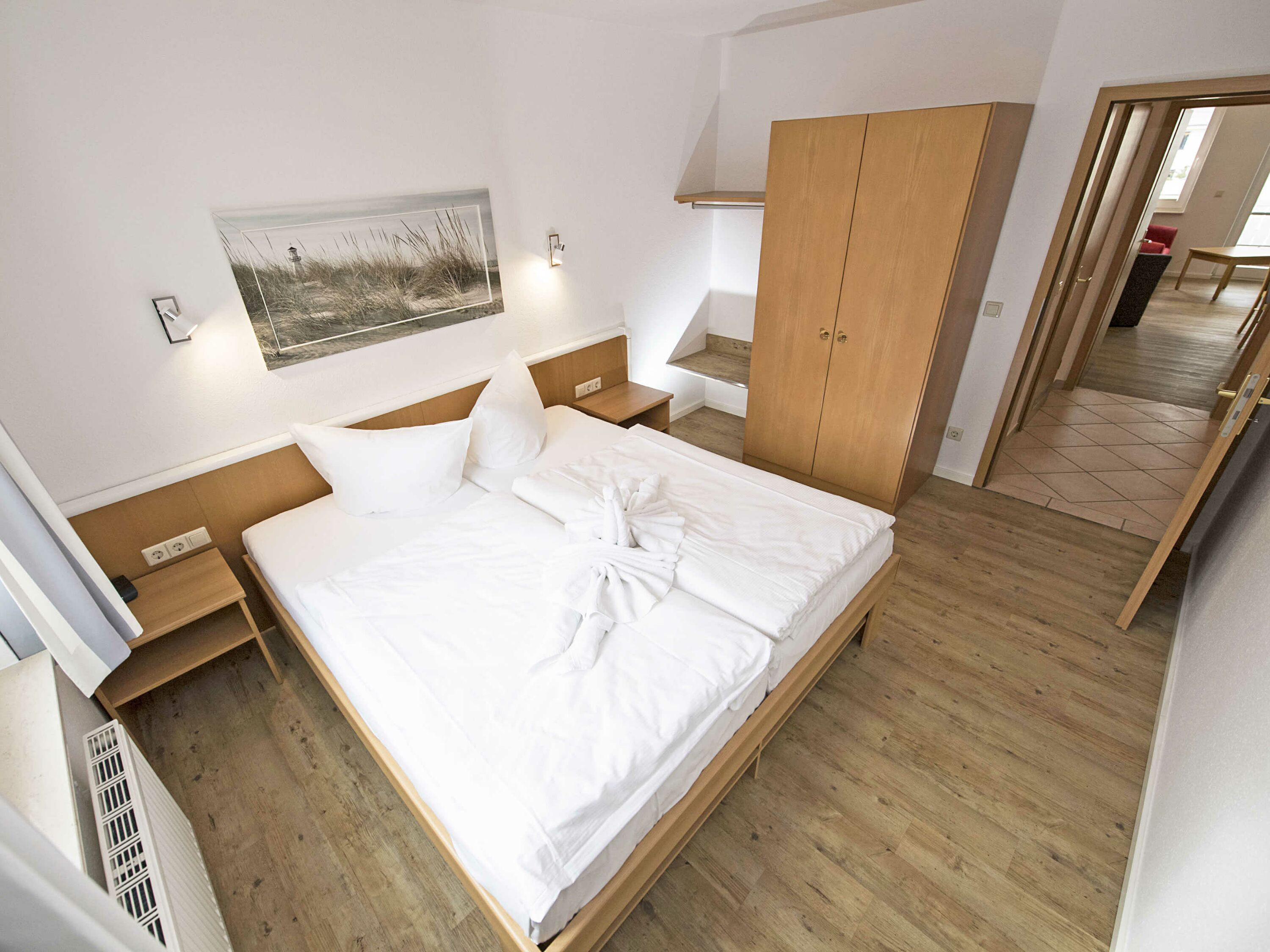 Weiterhin gibt es ein Schlafzimmer mit einem Doppelbett und ausreichend Platz für Ihre Garderobe sowie ein Bad mit Dusche/WC und einem Haartrockner.