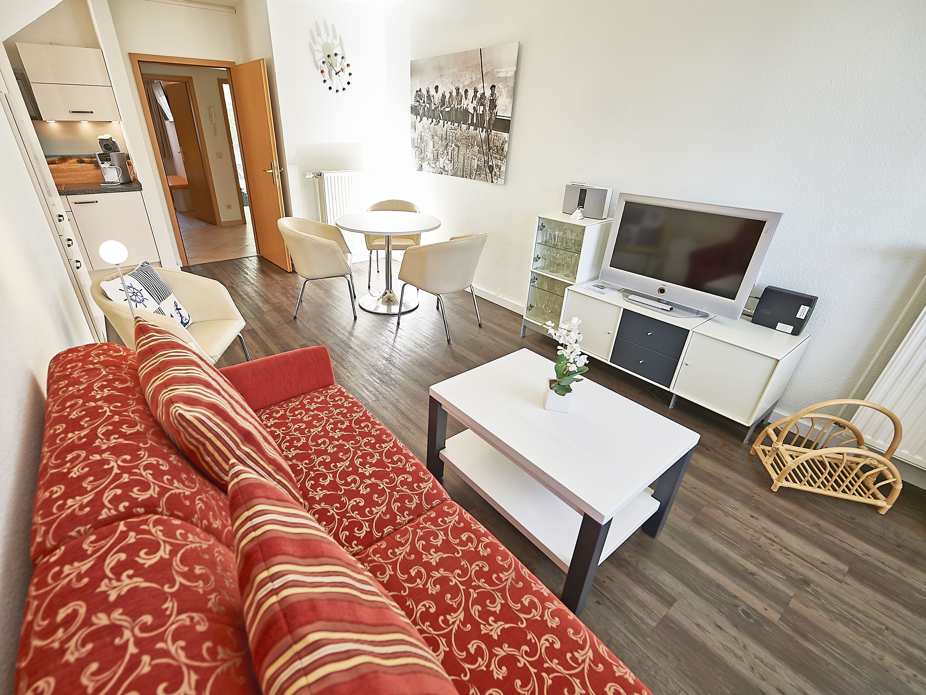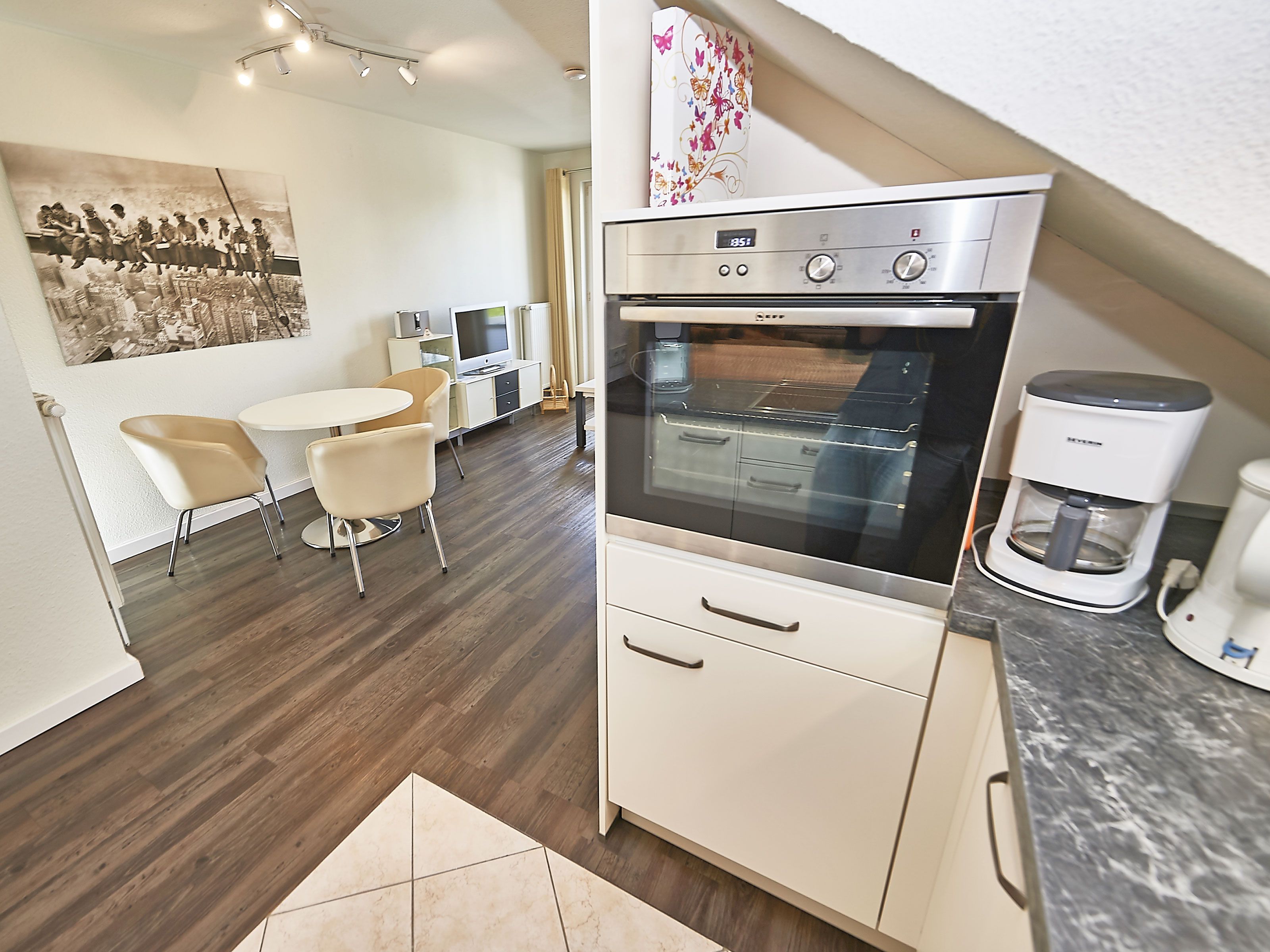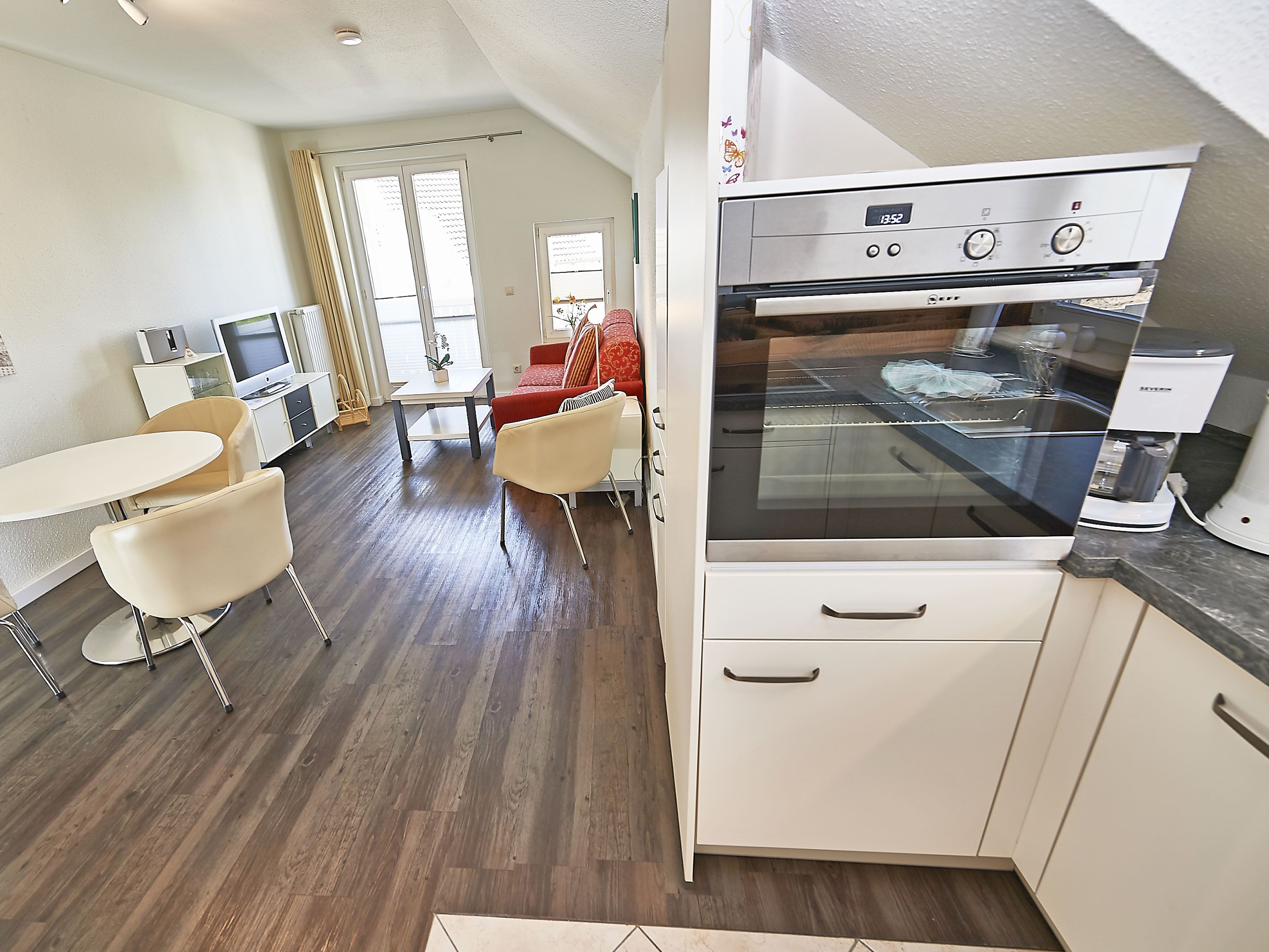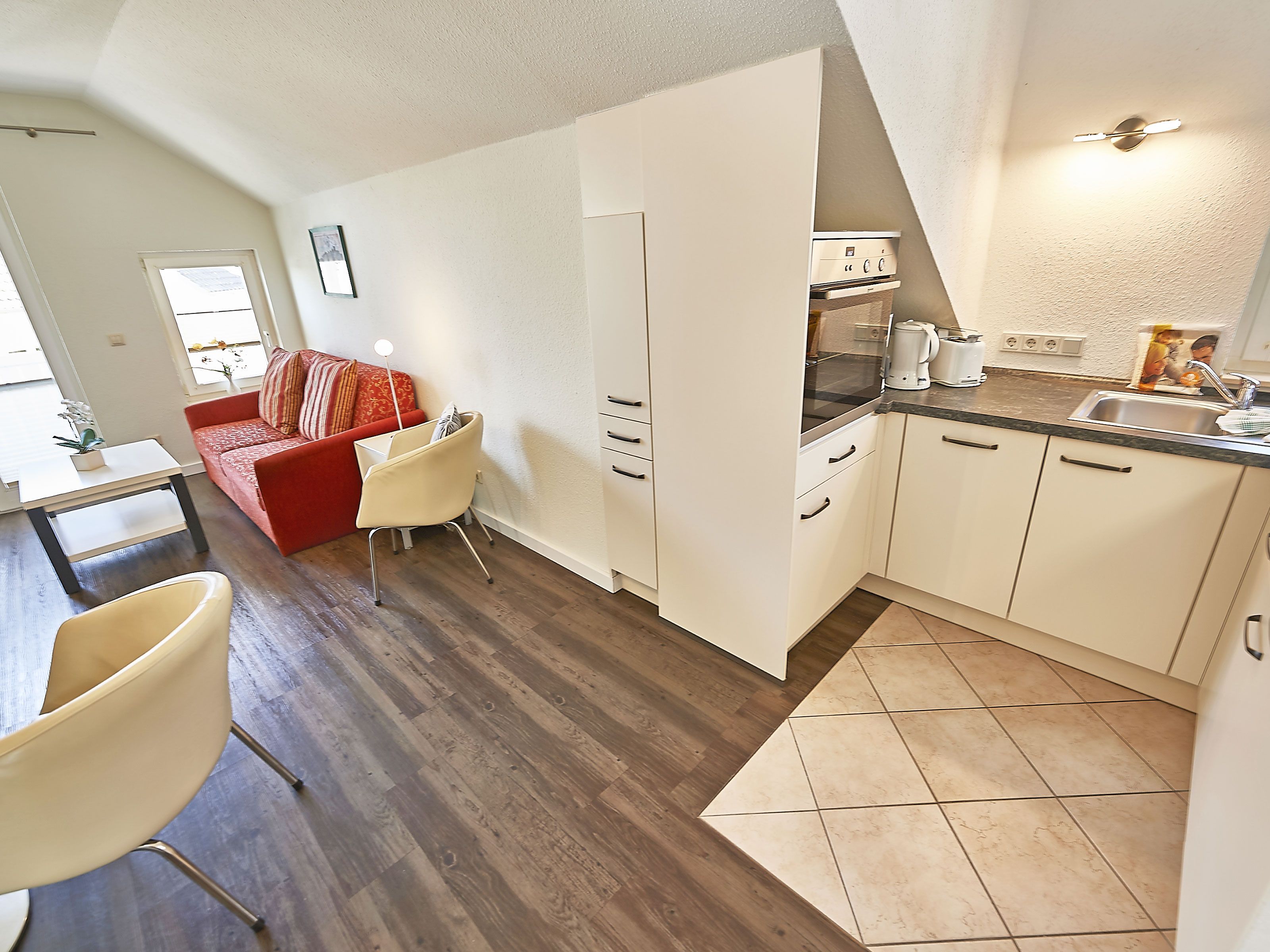 Der Wohnraum verfügt über einen Esstisch, eine Schlafcouch, die als Aufbettung für 2 Personen genutzt werden kann, eine BOSE Bluetooth-Soundanlage, einen Flachbild-TV und eine im Wohnbereich harmonisch integrierte Küchenzeile. Diese ist ausgestattet mit einem Kühlschrank mit Gefrierfach, einem 4-Zonen-Cerankochfeld, Backofen, Geschirrspüler, Wasserkocher, Kaffeepadmaschine Senseo Duo Latte, Toaster und diversem Kleininventar, das die Küchenausstattung komplettiert.
