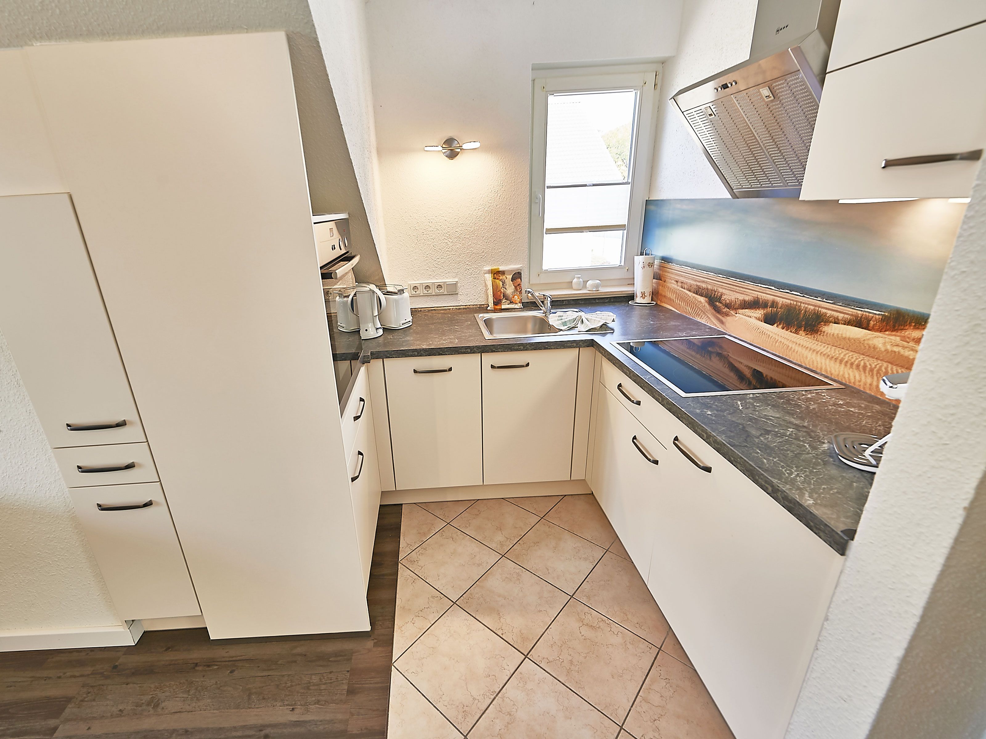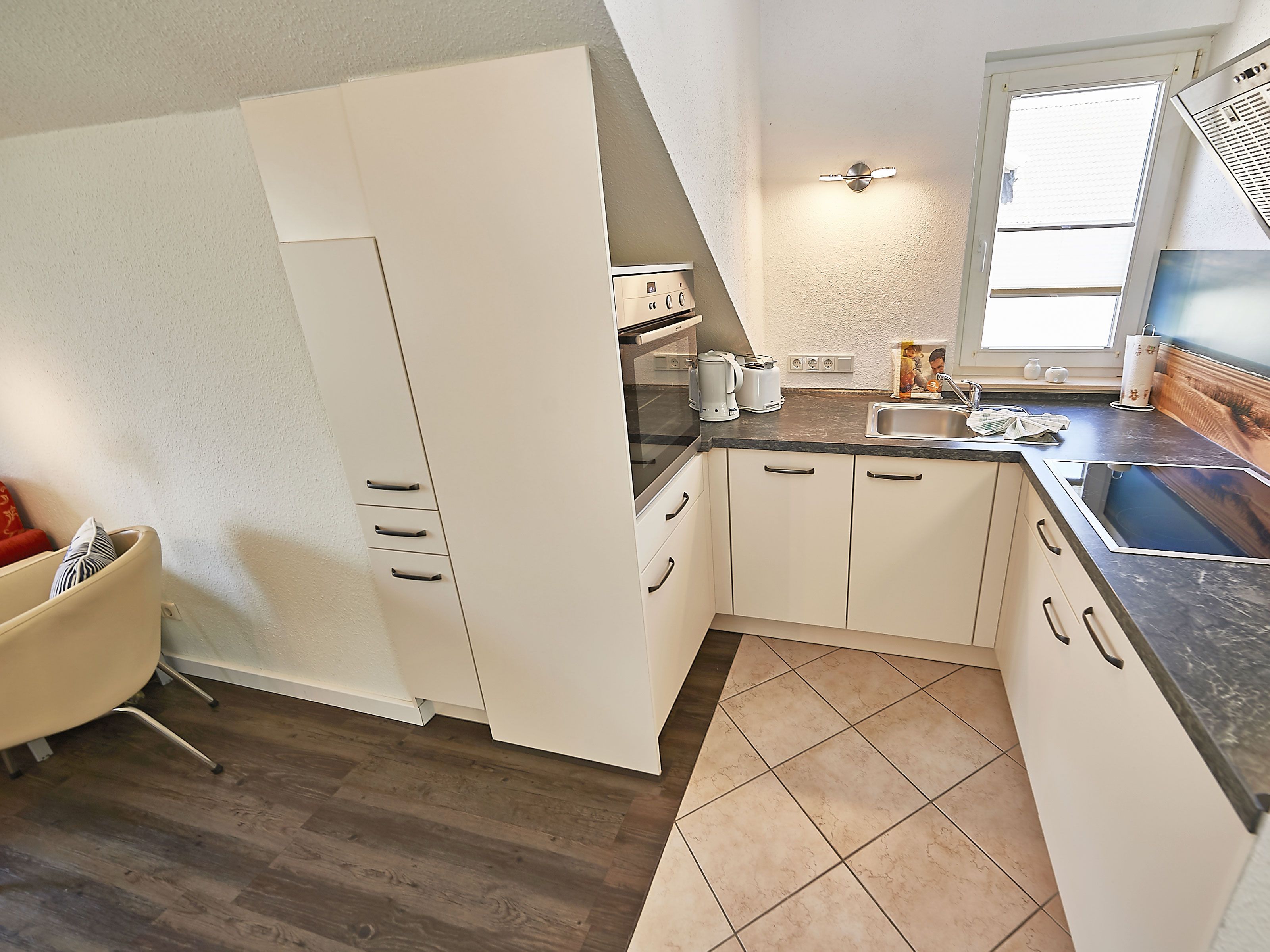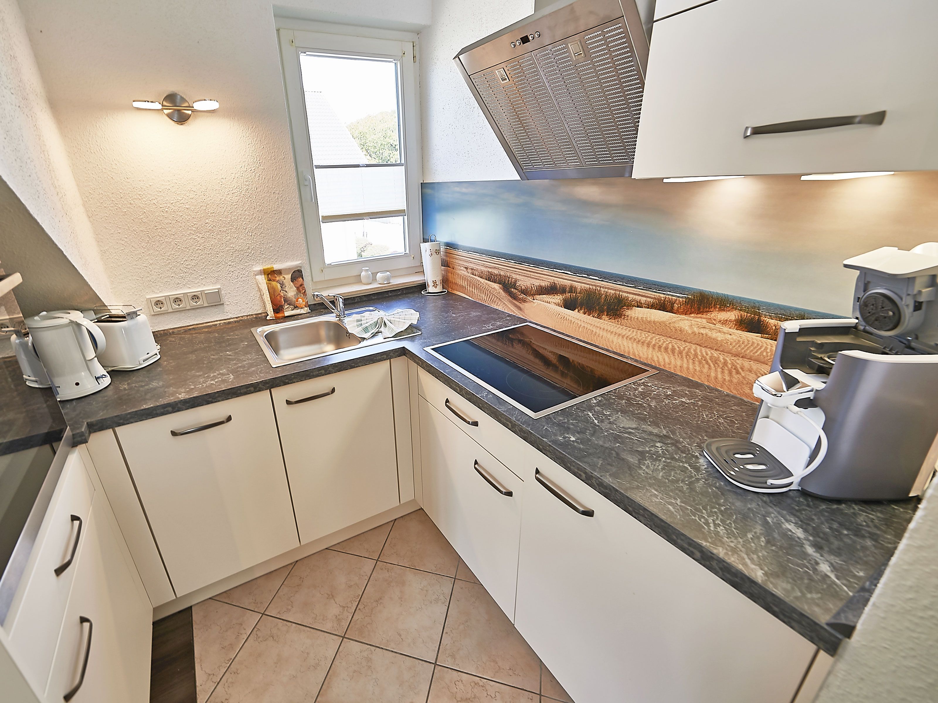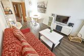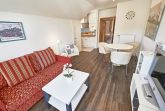 Der Wohnraum verfügt über einen Esstisch, eine Schlafcouch, die als Aufbettung für 2 Personen genutzt werden kann, eine BOSE Bluetooth-Soundanlage, einen Flachbild-TV und eine im Wohnbereich harmonisch integrierte Küchenzeile. Diese ist ausgestattet mit einem Kühlschrank mit Gefrierfach, einem 4-Zonen-Cerankochfeld, Backofen, Geschirrspüler, Wasserkocher, Kaffeepadmaschine Senseo Duo Latte, Toaster und diversem Kleininventar, das die Küchenausstattung komplettiert.