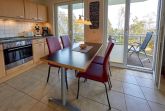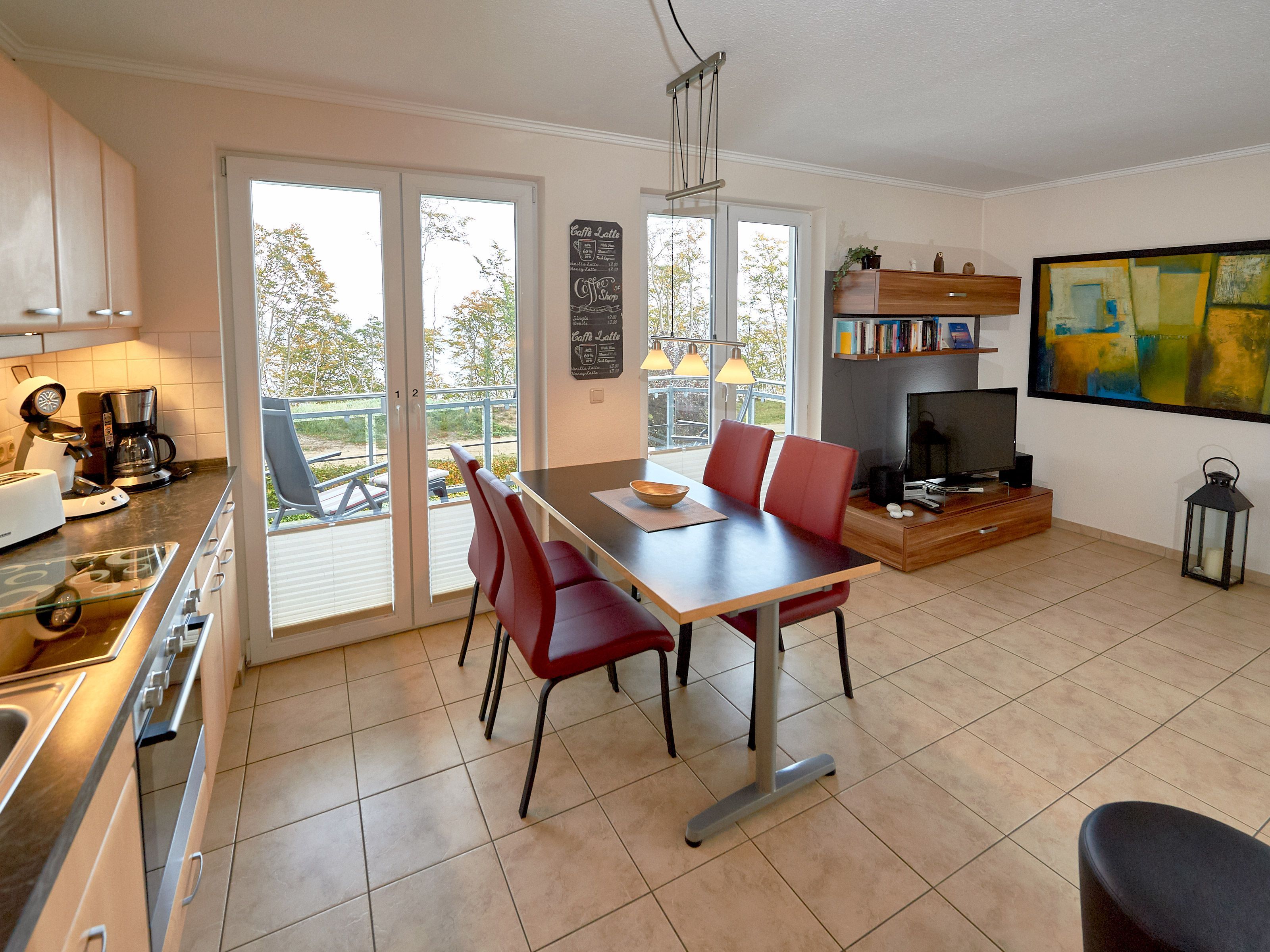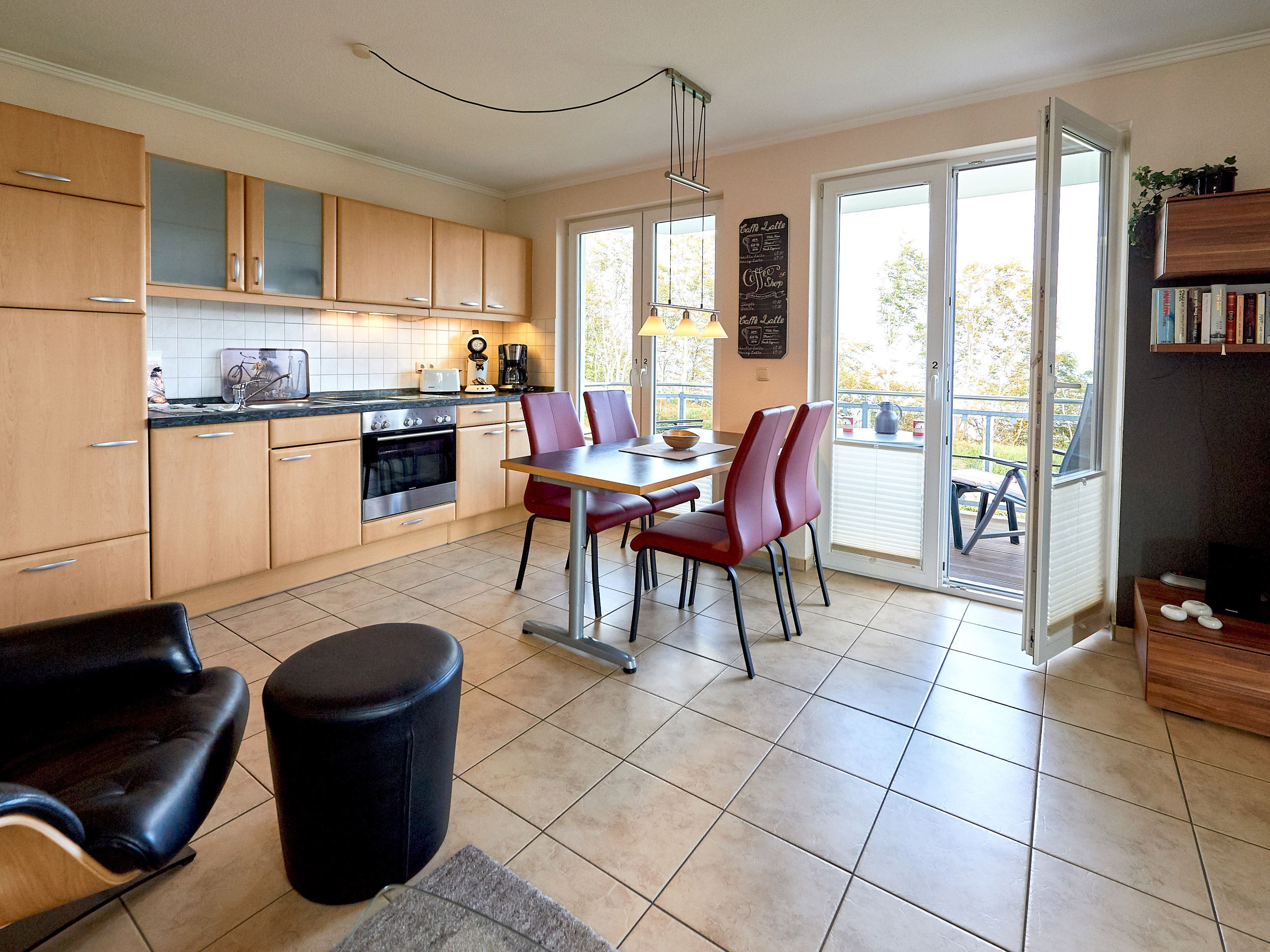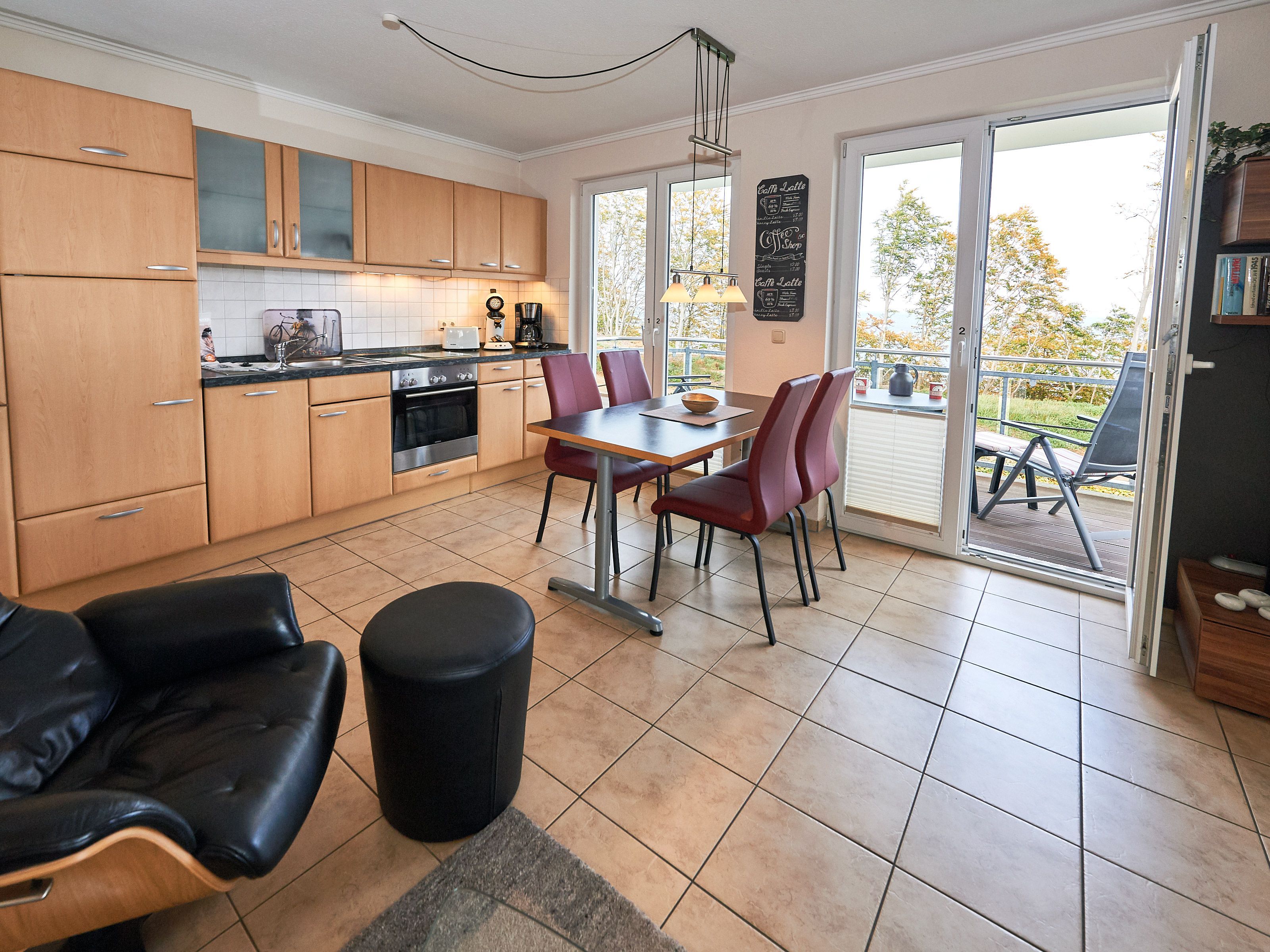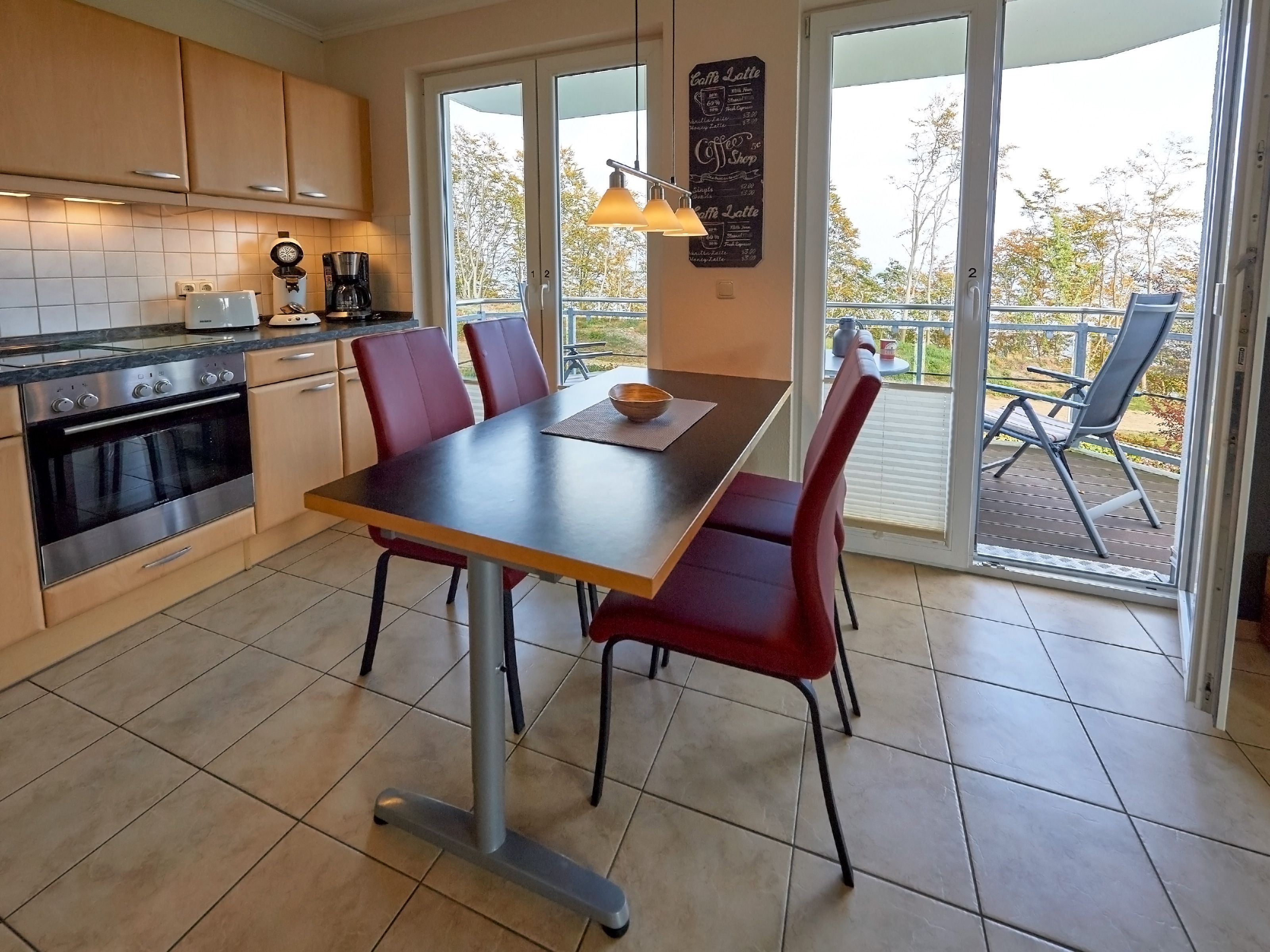 Der Wohnraum ist aufgeteilt in eine gemütliche Sitzecke mit Ledercouch, zwei Drehsesseln und Glastisch und den Koch- und Essbereich mit einem Esstisch für vier Personen sowie der Küchenzeile. Hier stehen Ihnen u.a. ein 4-Platten-Ceranfeld, ein Backofen, eine Spülmaschine, ein Kühlschrank mit Gefrierfach, eine Filterkaffeemaschine, eine Kaffeepad-Maschine, ein Toaster sowie weiteres Kleininventar zur Verfügung.