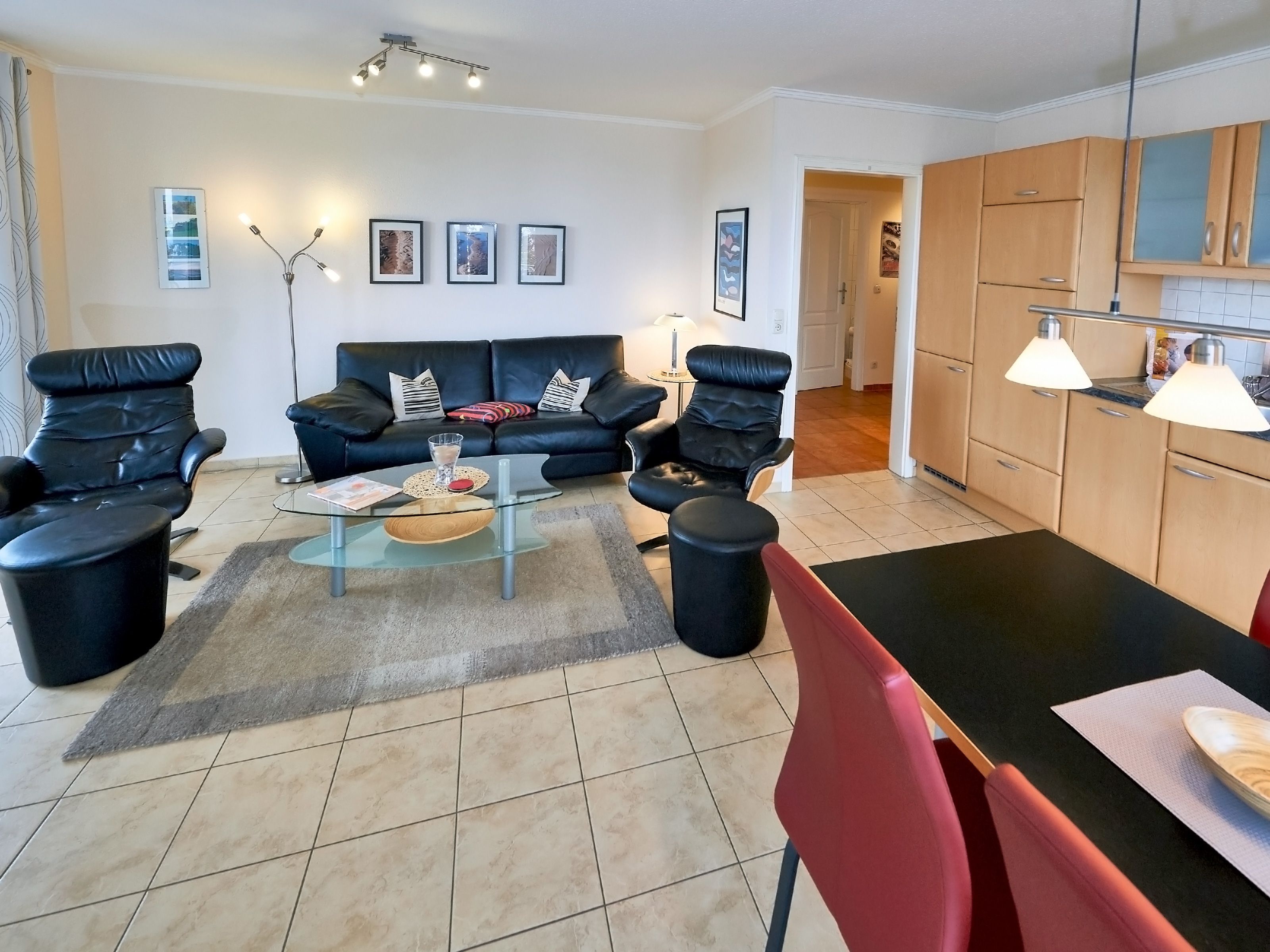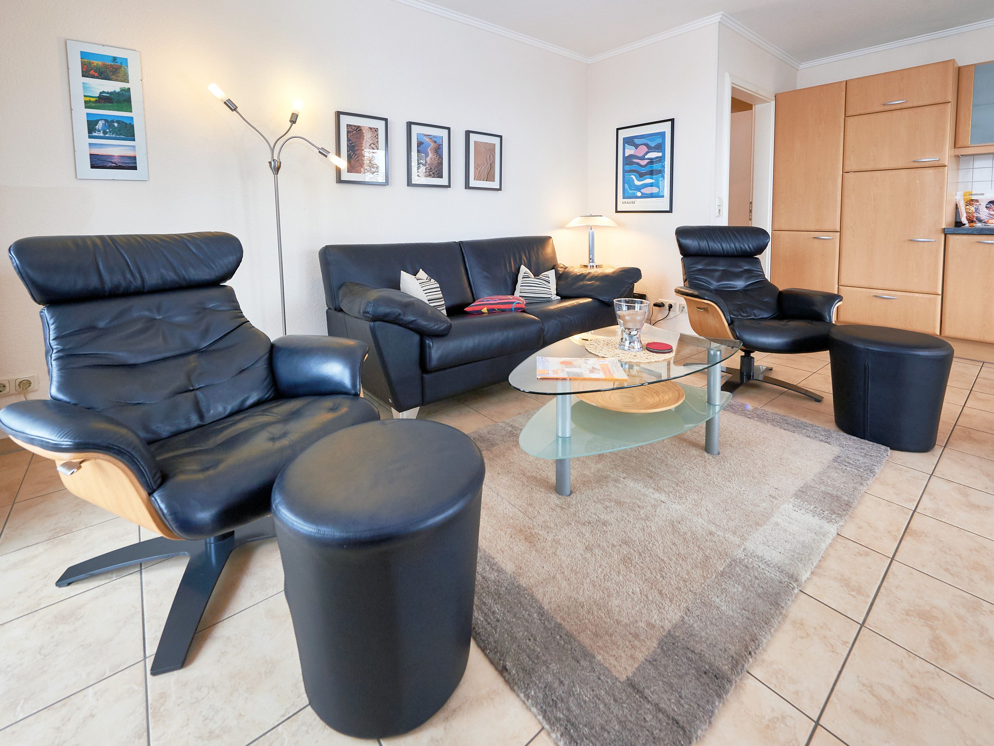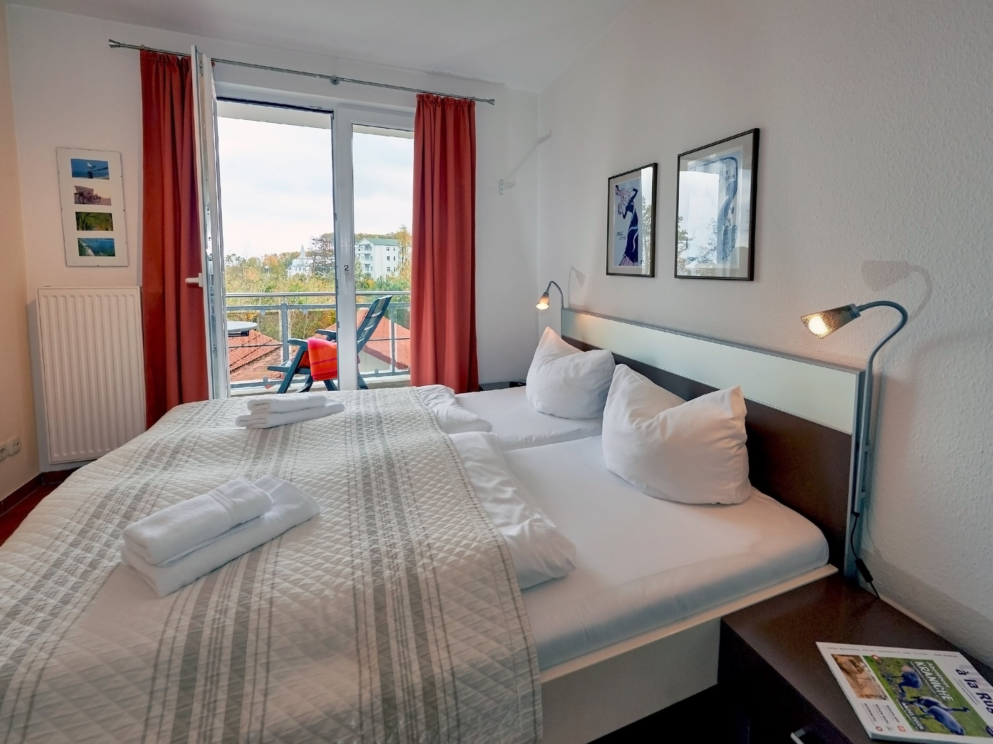 Ihr 3-Raum-Appartement besteht aus einem kombinierten Wohn-/Esszimmer, zwei Schlafzimmern mit komfortablen Doppelbetten (1,80 x 2,00 m bzw. 1,60 x 2,00 m), einer geräumigen Diele sowie einem Badezimmer mit Dusche/WC, Badewanne, beleuchtetem Waschtisch, Fön und beheizbarem Handtuchtrockner.