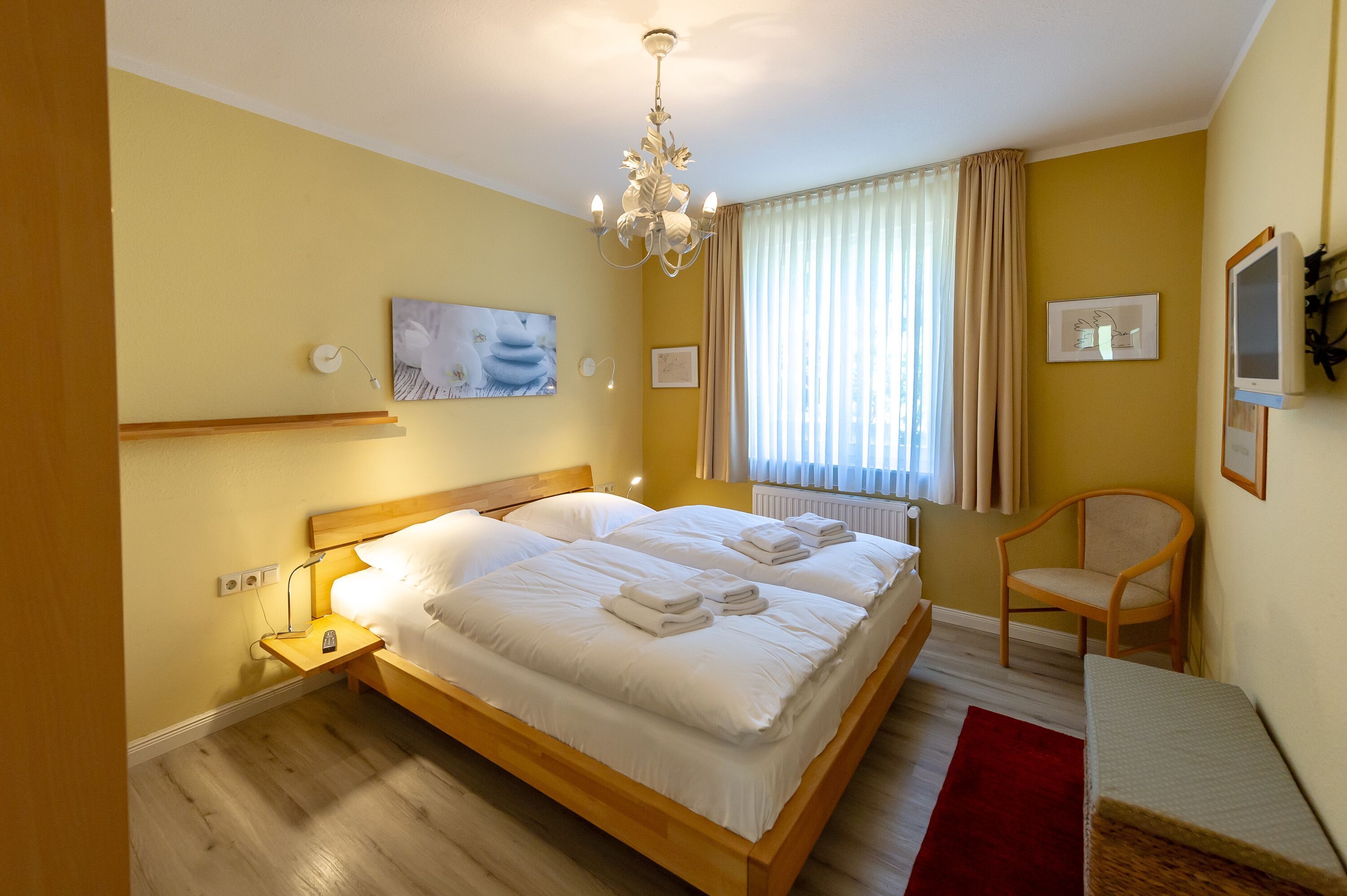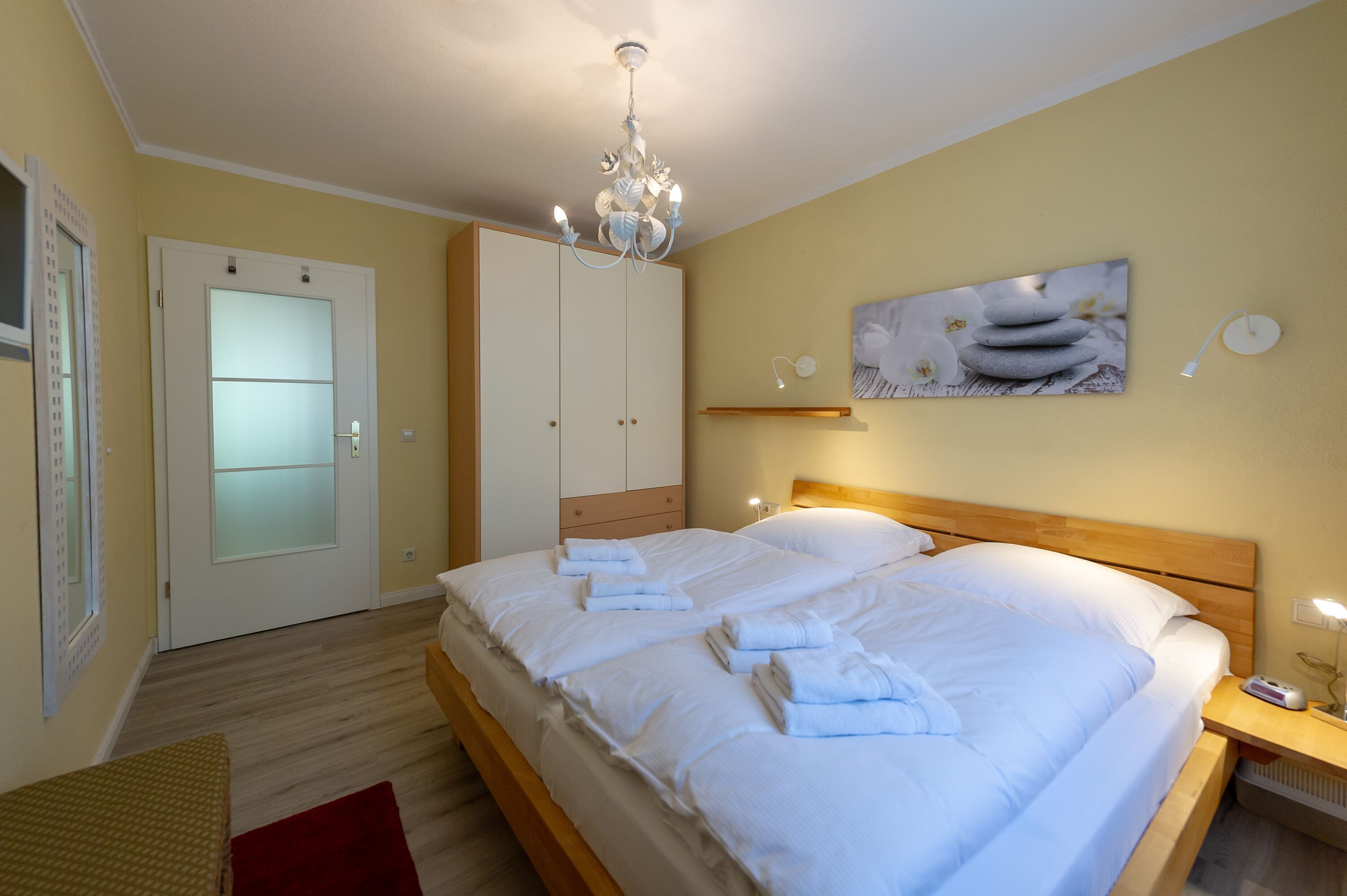 Im Schlafzimmer erwartet Sie ein großes, bequemes Doppelbett und ein geräumiger Kleiderschrank, der viel Platz für Ihre Garderobe bietet. Ein zweiter Fernseher sorgt für zusätzlichen Komfort. Das moderne Tageslichtbad überzeugt mit einer ebenerdigen Dusche, WC, einem beleuchteten Waschtisch inklusive Fön und Kosmetikspiegel sowie einem beheizbaren Handtucktrockner.