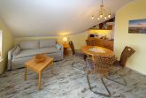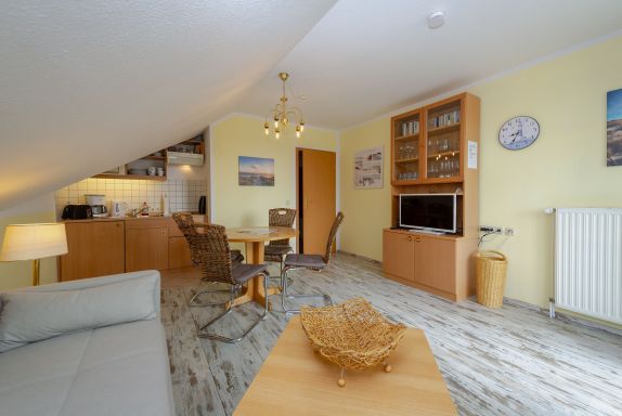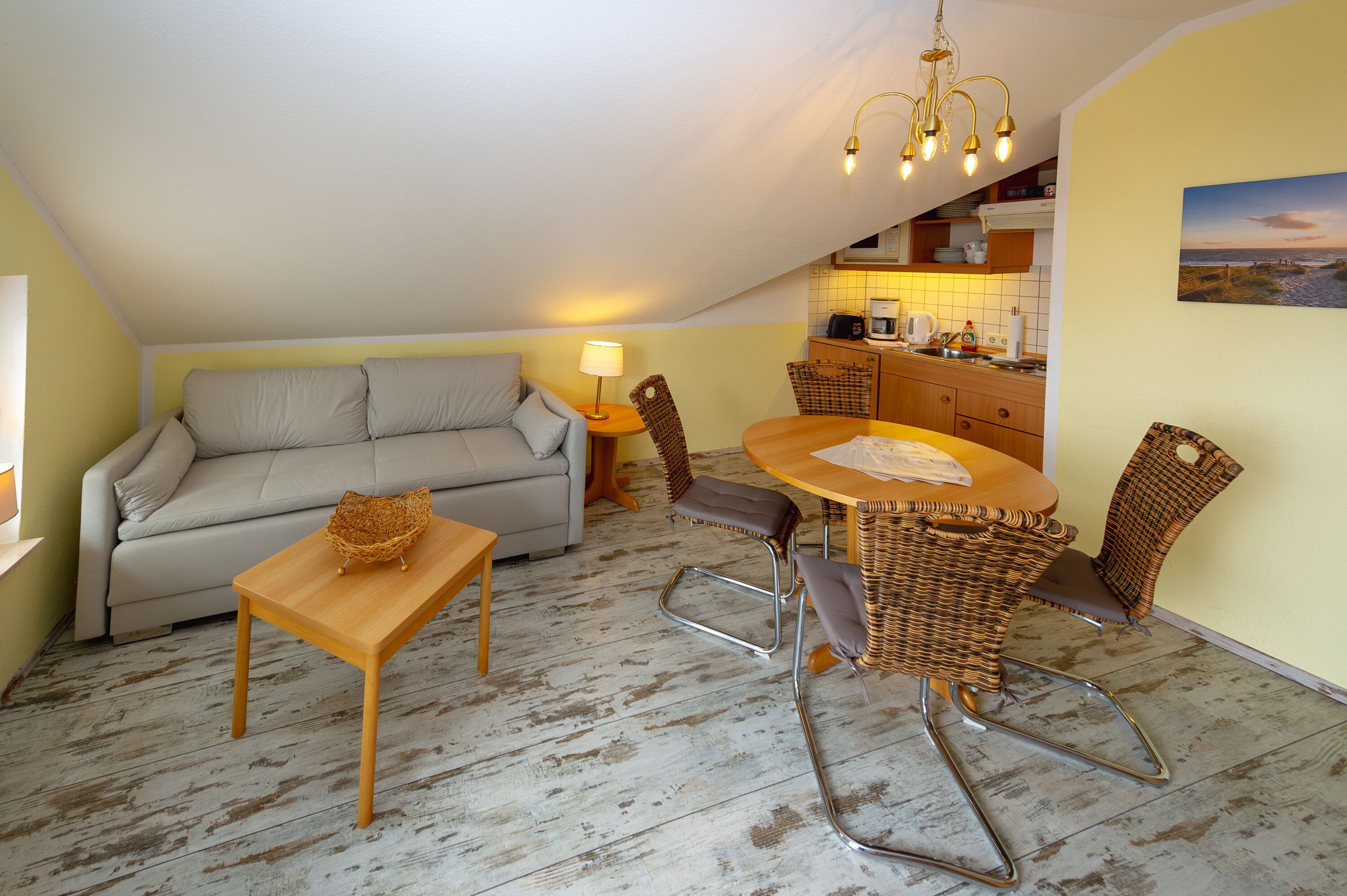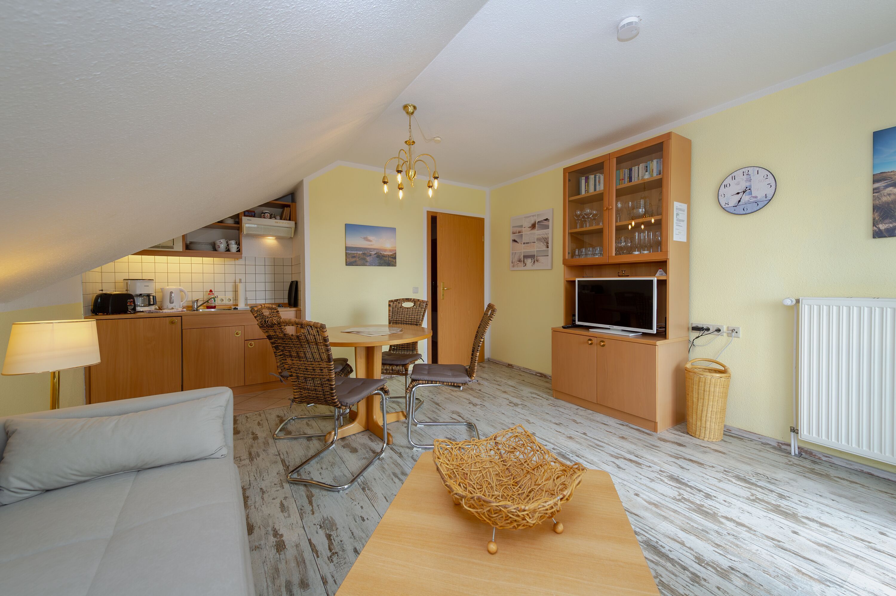 Der helle, freundliche Wohnraum verfügt über einen Esstisch, einen Sessel und eine Schlafcouch, die als Aufbettung für zwei Personen genutzt werden kann, eine Mini-Stereoanlage mit Radio/CD-Player, einen Flachbild-TV und eine im Wohnbereich harmonisch integrierte Küchenzeile. Diese ist ausgestattet mit einem Kühlschrank mit Gefrierfach, einer Mikrowelle, einem 2-Platten-Herd sowie Wasserkocher, Kaffeemaschine, Toaster und diversem Kleininventar, das die Küchenausstattung komplettiert.