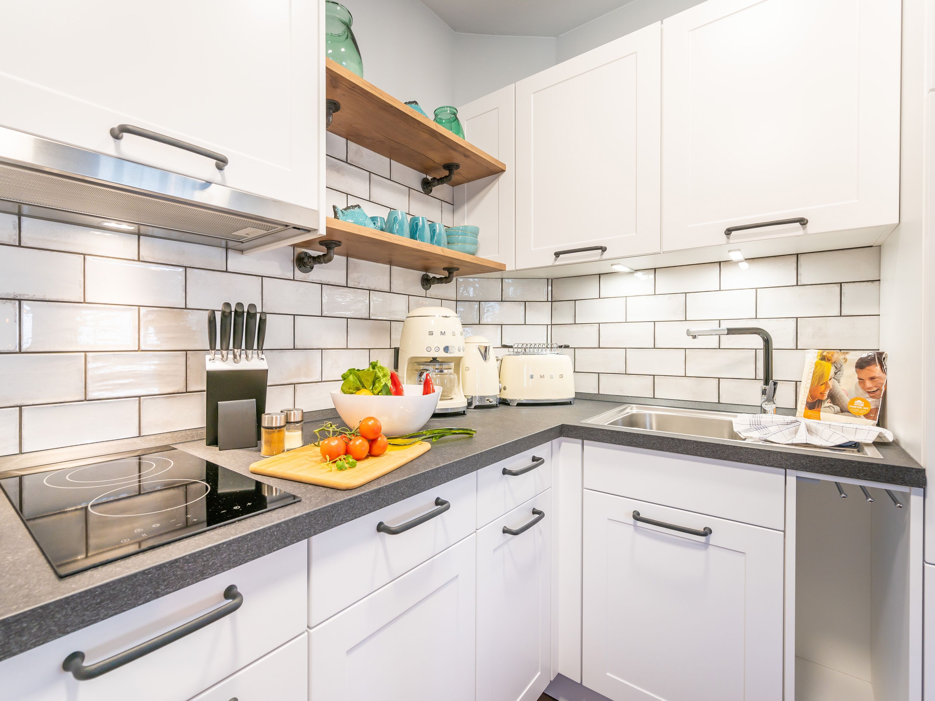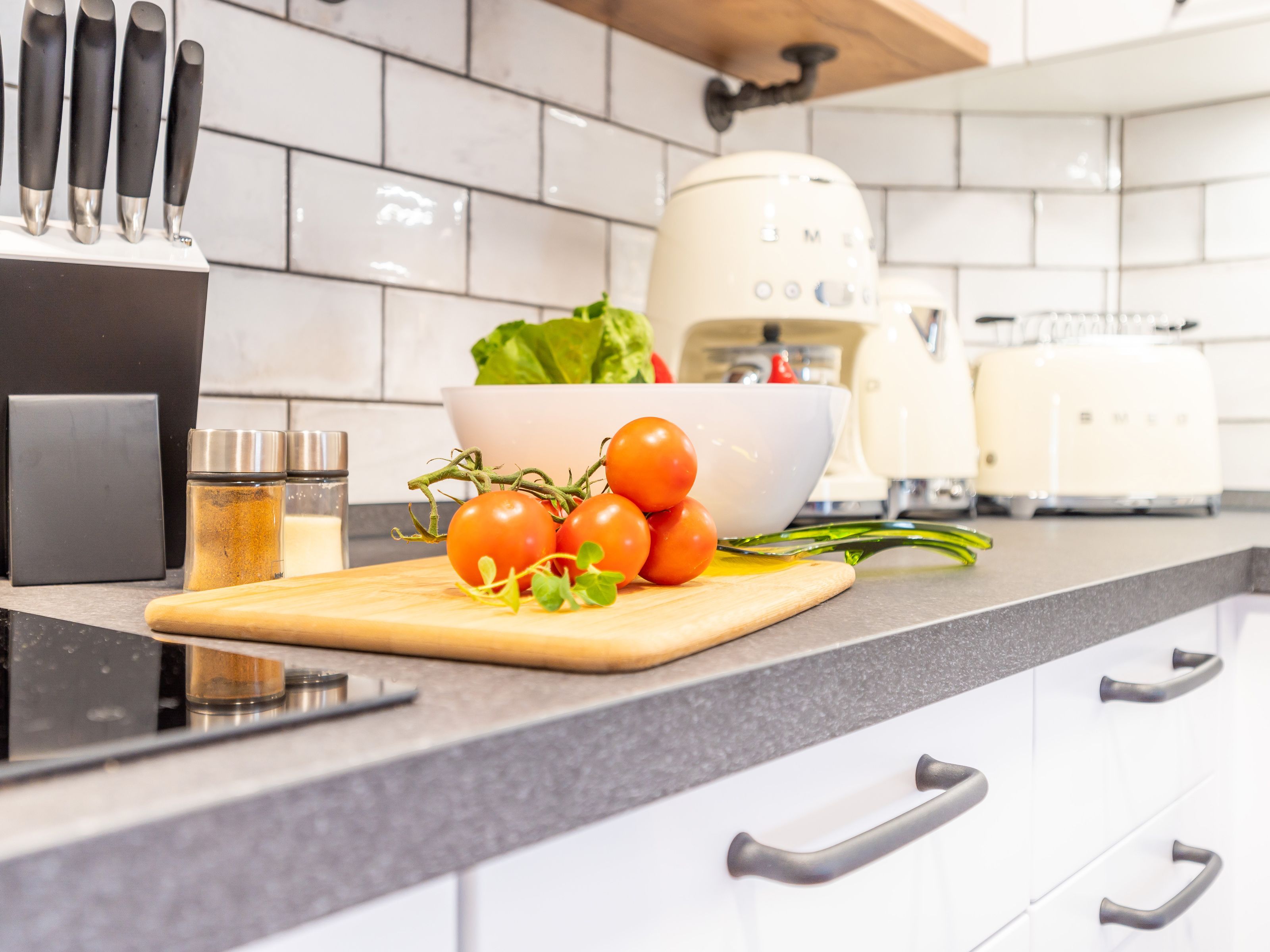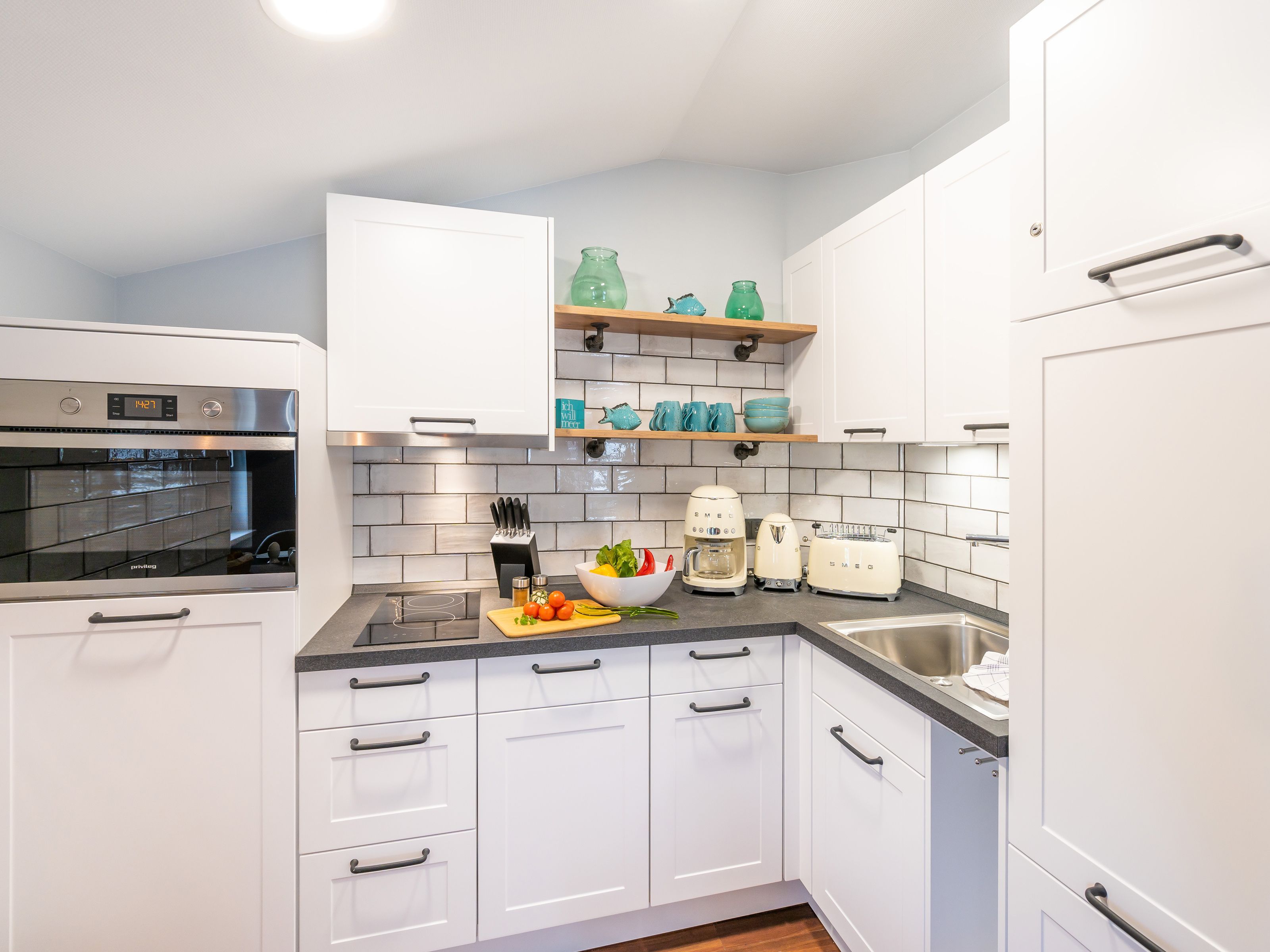 Der kombinierte Wohn- und Essbereich verfügt über einen Esstisch, eine Schlafcouch (Aufbettungsmöglichkeit für ein Kind bis 12 Jahren), einen Flachbild-TV und eine zusätzliche kleine, sonnendurchflutete Sitzecke. Die in den Wohnbereich integrierte Küchenzeile ist mit einem Kühlschrank, einem Backofen, einem 4-Zonen-Cerankochfeld, einer Mikrowelle, einer Kaffeepadmaschine, einem Wasserkocher, einem Toaster und diversem Kleininventar ausgestattet.