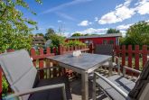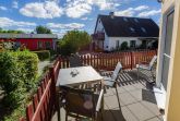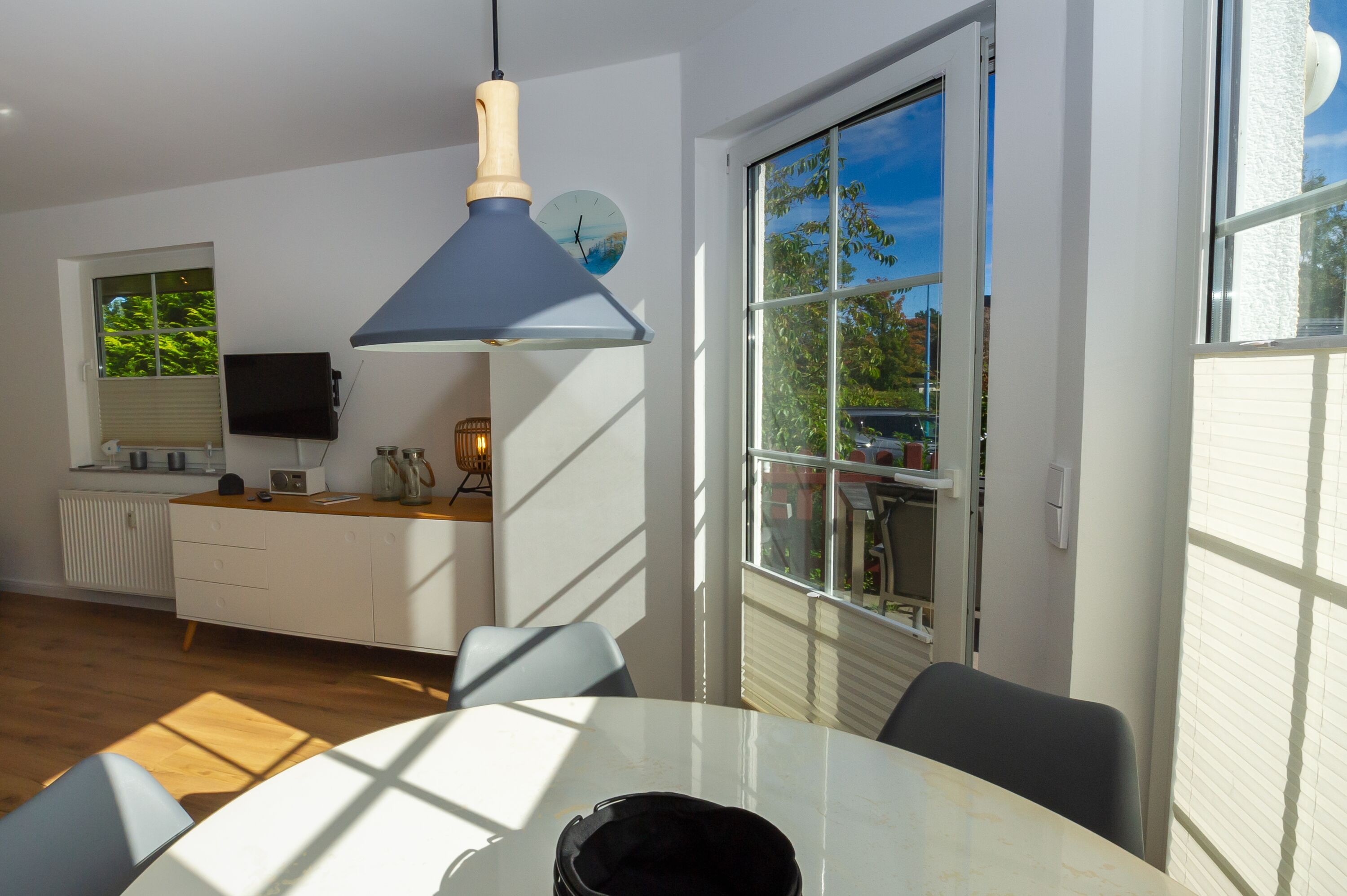 Im hell und freundlich eingerichteten Wohn-/Esszimmer stehen Ihnen u.a. eine komfortable Schlafcouch (Aufbettungsmöglichkeit für zwei Personen), ein großer SMART-TV und ein Radio mit Bluetooth-Anschluss zur Verfügung. W-LAN ist selbstverständlich ebenfalls vorhanden und kostenfrei nutzbar. Am runden Esstisch im sonnenbeschienenen Erker findet die ganze Familie Platz. Wenn das Wetter es erlaubt, können Sie auch ganz wunderbar draußen an der frischen Luft sitzen; eine große Terrasse zur Morgen- und Vormittagssonne macht es möglich.