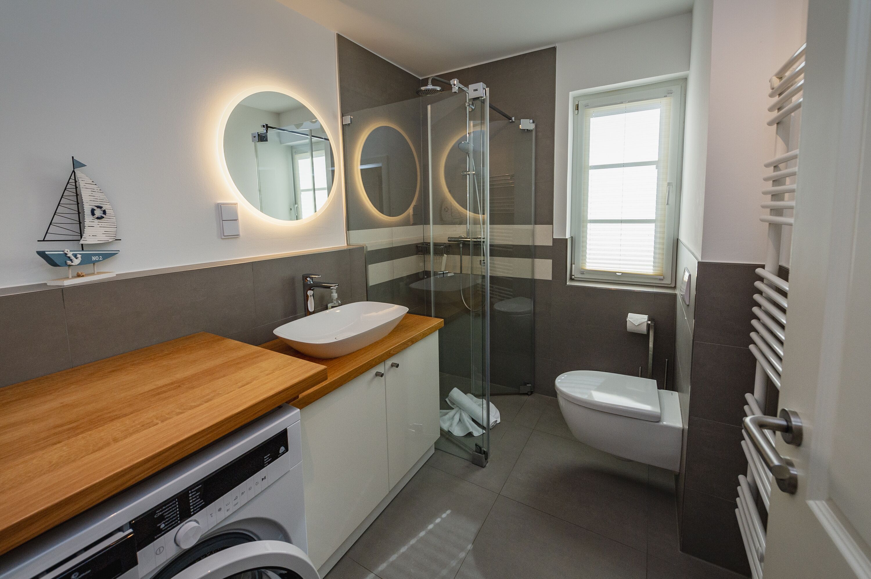 Ein separates Schlafzimmer mit einem komfortablen Doppelbett und Verdunkelungsplissees sowie modernes Badezimmer mit Dusche/WC, beleuchtetem Spiegel, Fön und Waschmaschine runden den stimmigen Gesamteindruck der Wohnung ab.