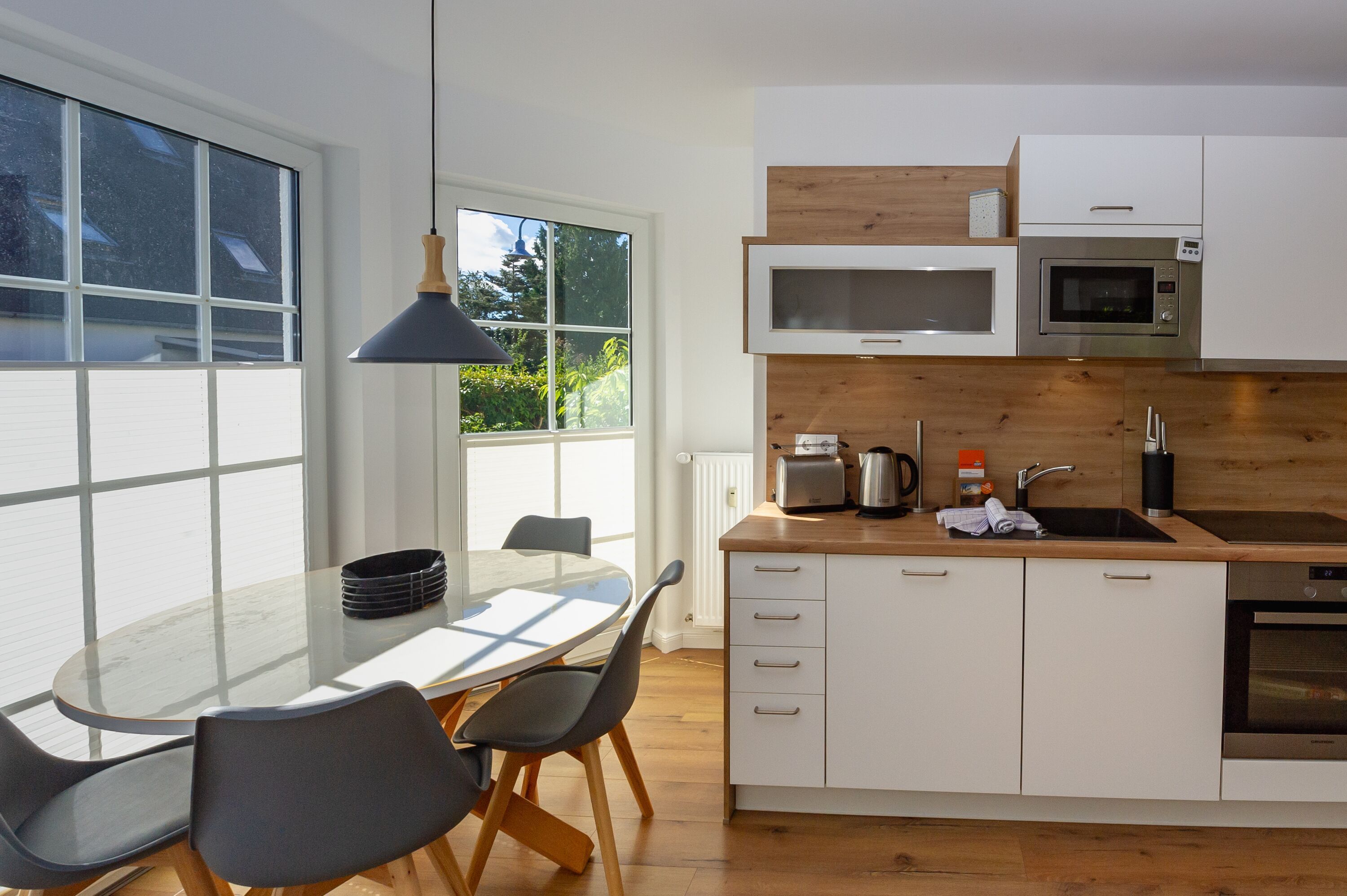 Die geschickt in den Raum integrierte Küchenzeile ist bestens ausgestattet, so dass Sie sich nach Lust und Laune selbst bekochen können. Hier stehen Ihnen u.a. ein Kühlschrank mit Gefrierfach, ein Induktionsherd inklusive Backofen und Dunstabzugshaube, eine Spülmaschine, eine Kaffeemaschine, ein Wasserkocher, ein Toaster, eine Mikrowelle, ein Mixer und diverses weiteres Kleininventar zur Verfügung.