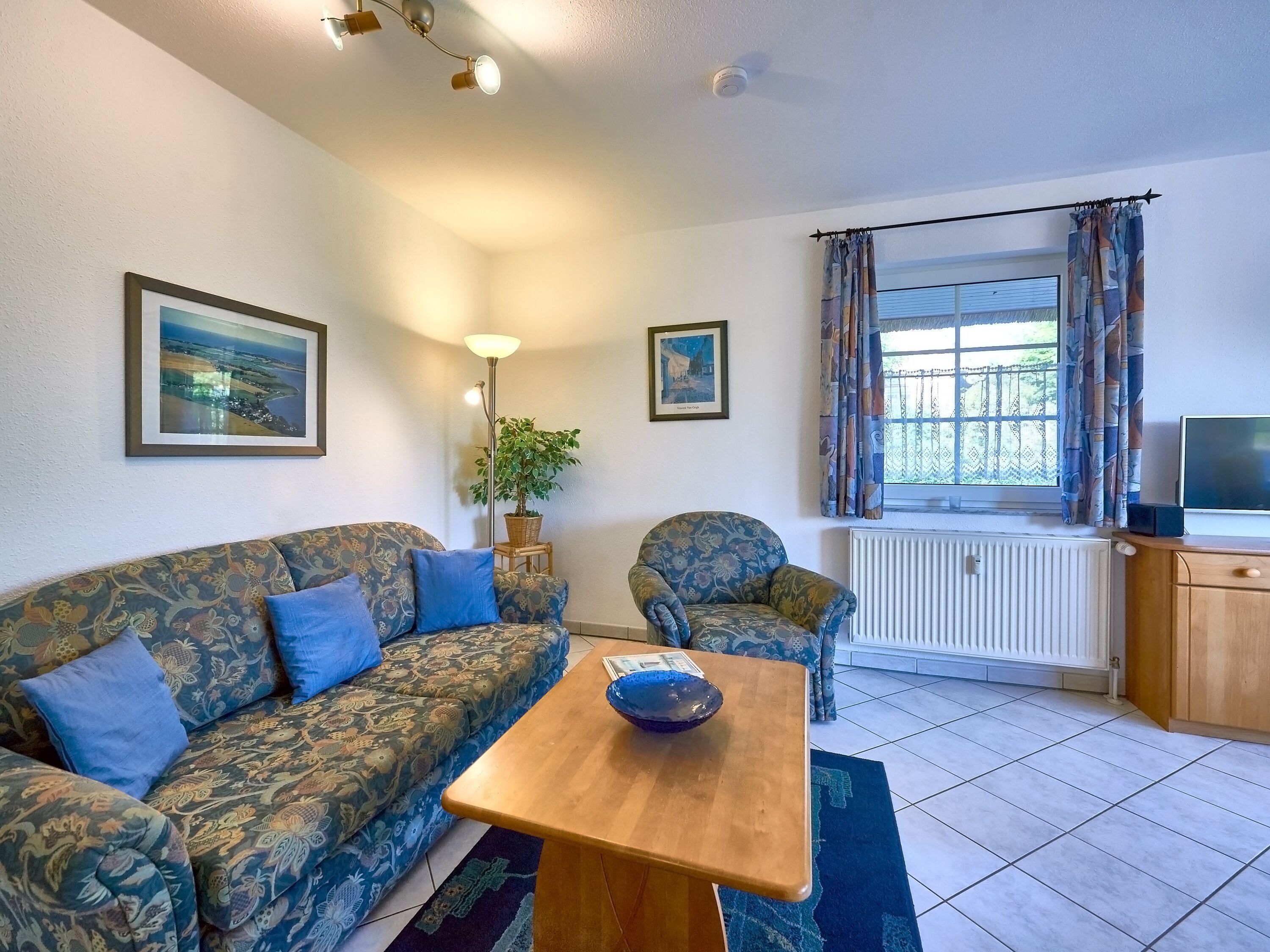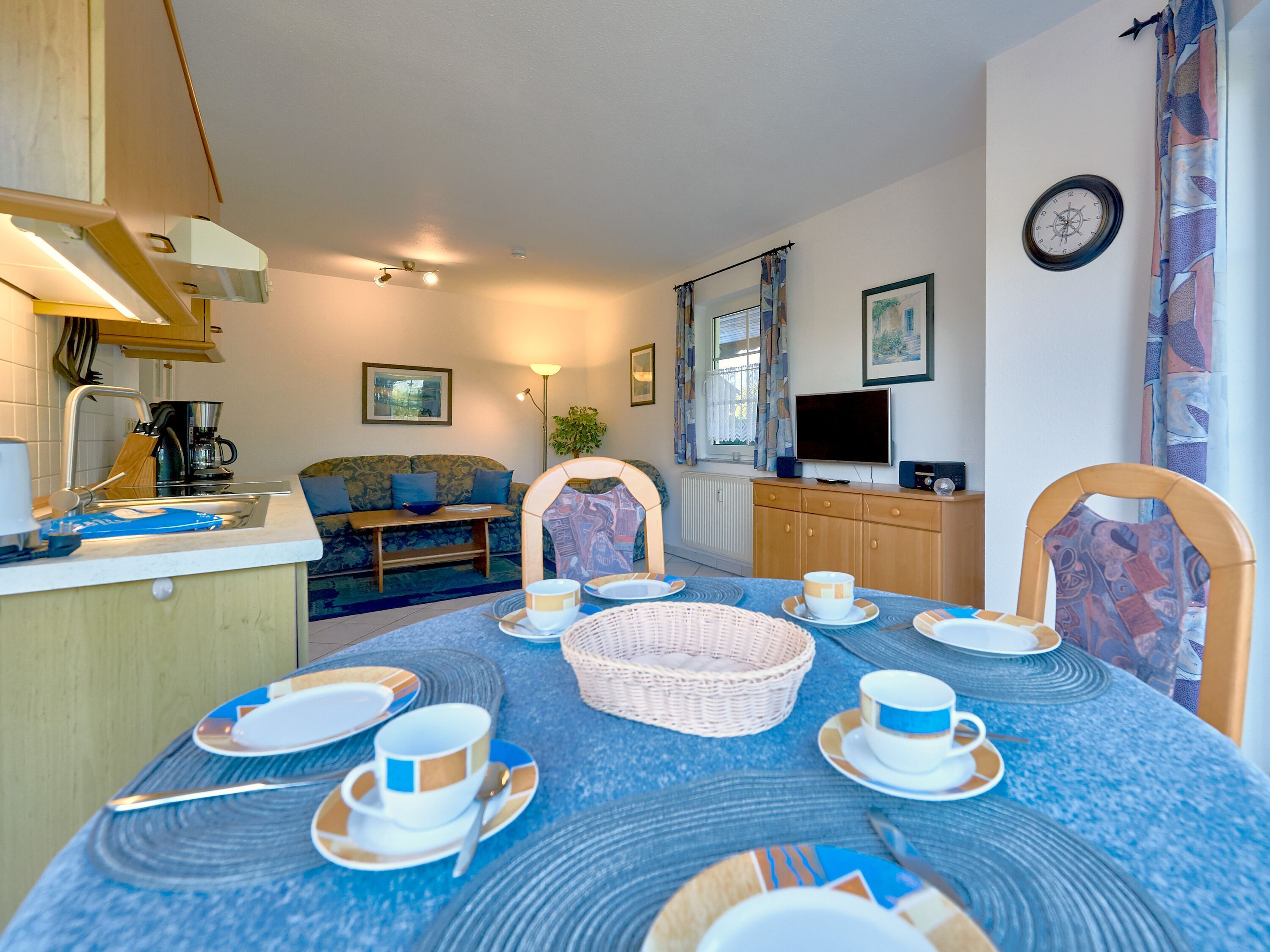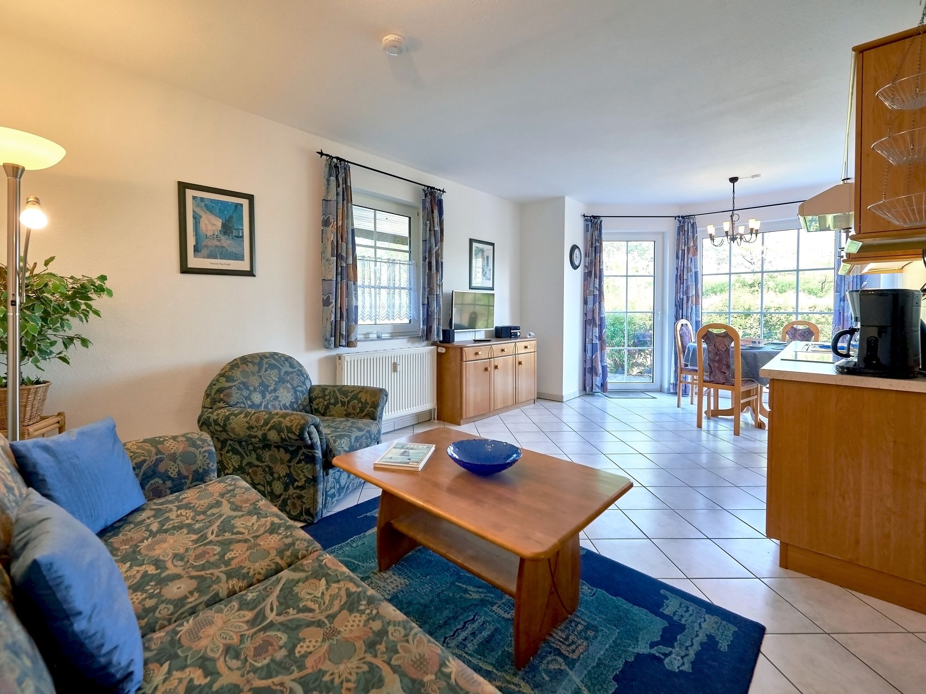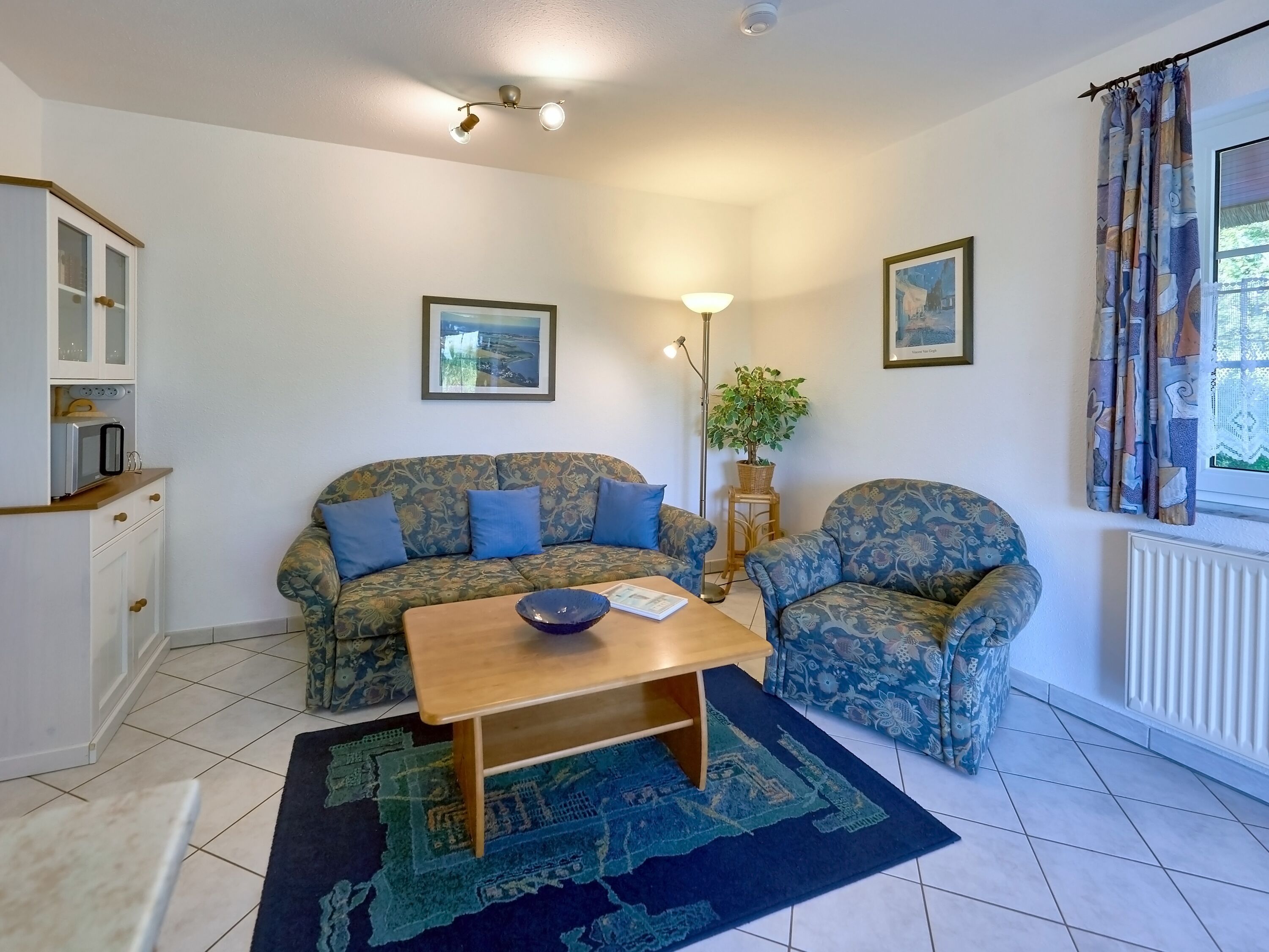 Im gemütlichen Wohnraum befinden sich eine Couchgarnitur (Aufbettung für zwei Personen), ein Fernseher und eine Stereoanlage mit CD-Player, ein Esstisch im hellen Erker und die im Wohnraum integrierte Küchenzeile. Dort stehen Ihnen u.a. ein Kühlschrank, ein 4-Platten-Herd, eine Kaffeemaschine, ein Toaster und diverses Kleininventar zur Verfügung, das die Küchenausstattung komplettiert.