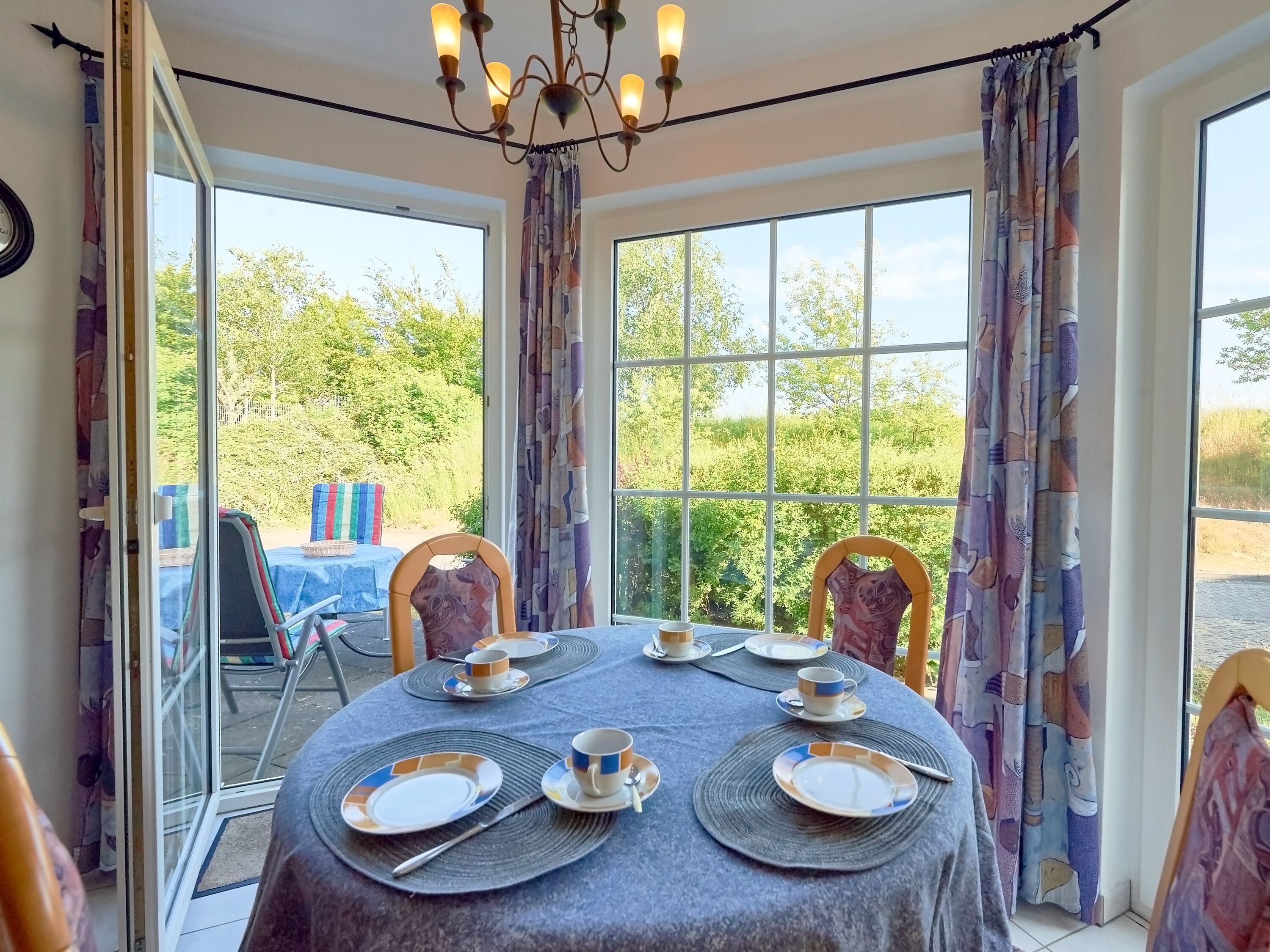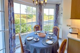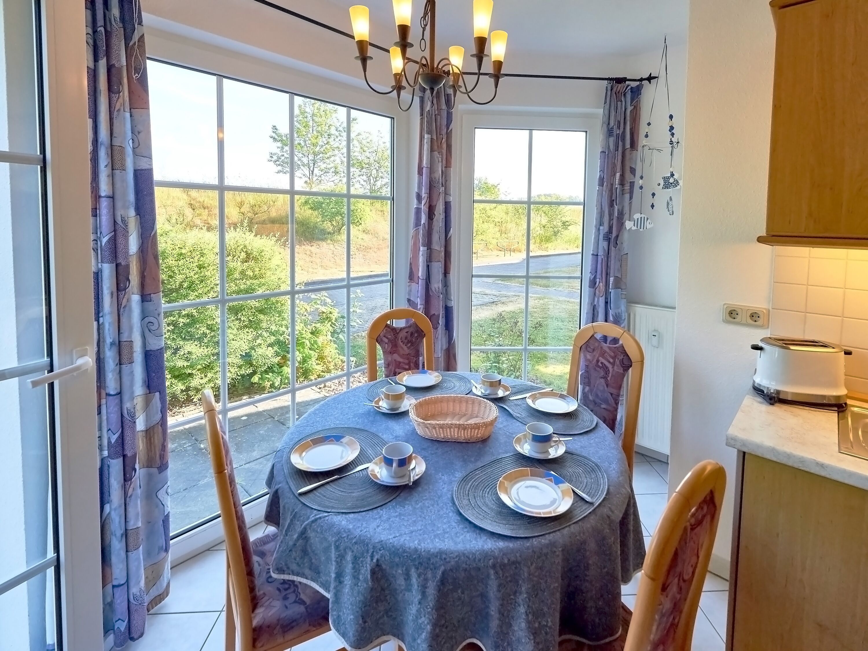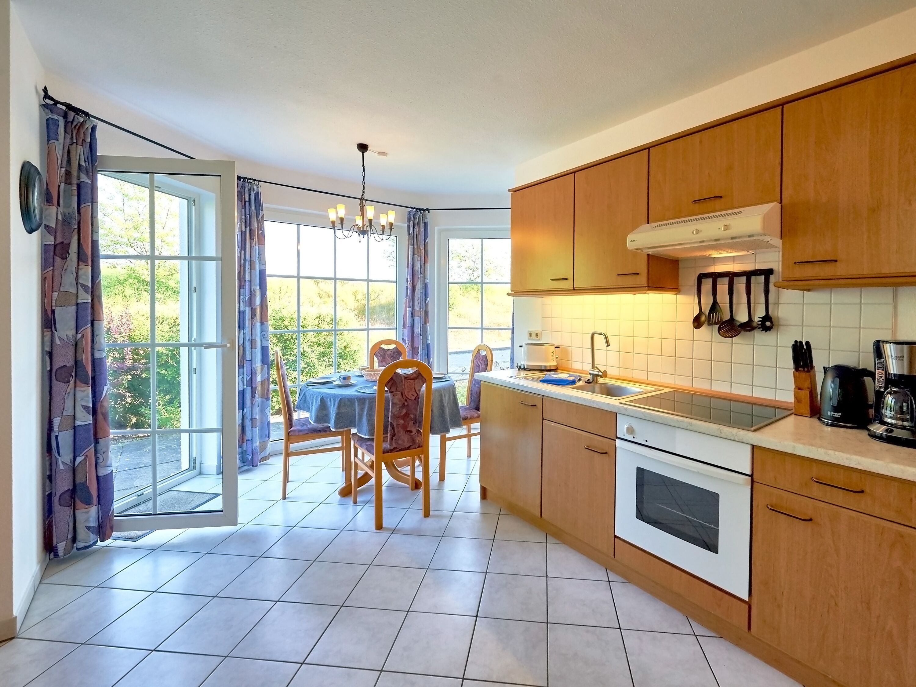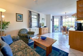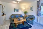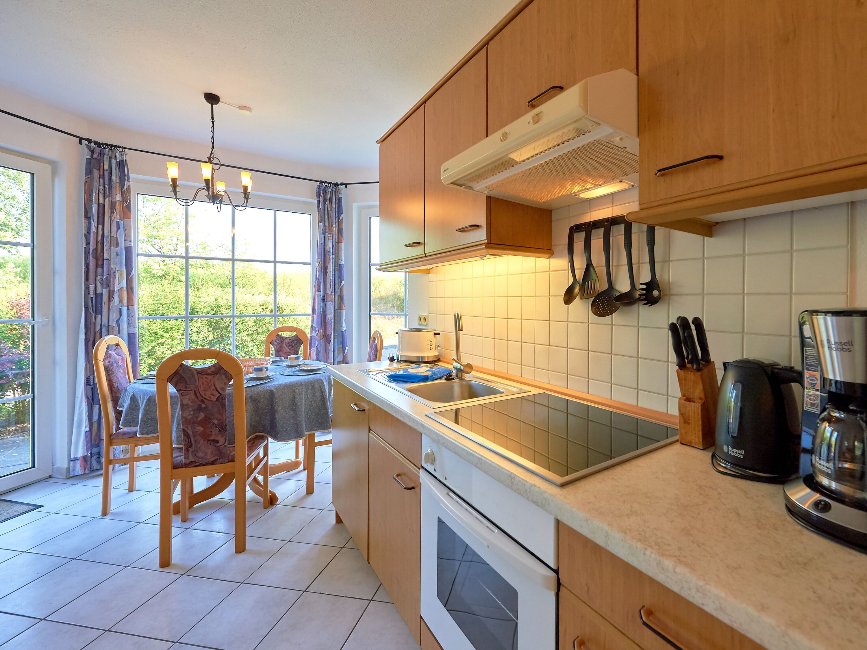 Im gemütlichen Wohnraum befinden sich eine Couchgarnitur (Aufbettung für zwei Personen), ein Fernseher und eine Stereoanlage mit CD-Player, ein Esstisch im hellen Erker und die im Wohnraum integrierte Küchenzeile. Dort stehen Ihnen u.a. ein Kühlschrank, ein 4-Platten-Herd, eine Kaffeemaschine, ein Toaster und diverses Kleininventar zur Verfügung, das die Küchenausstattung komplettiert.