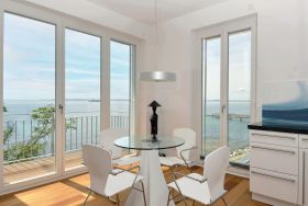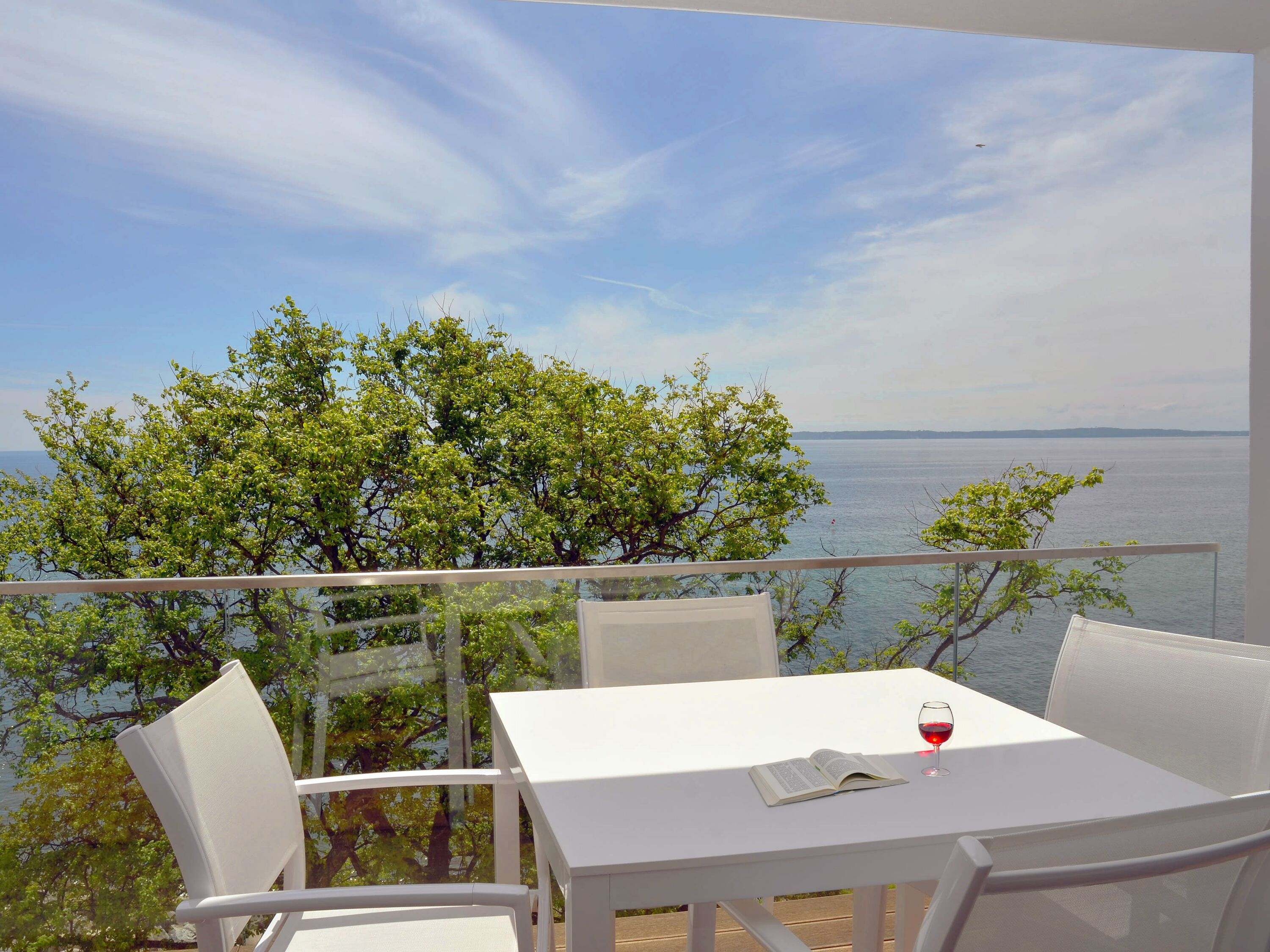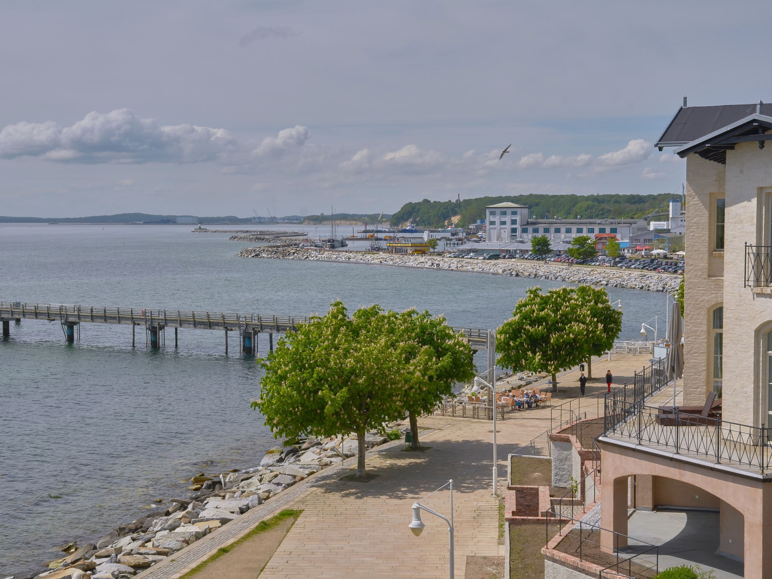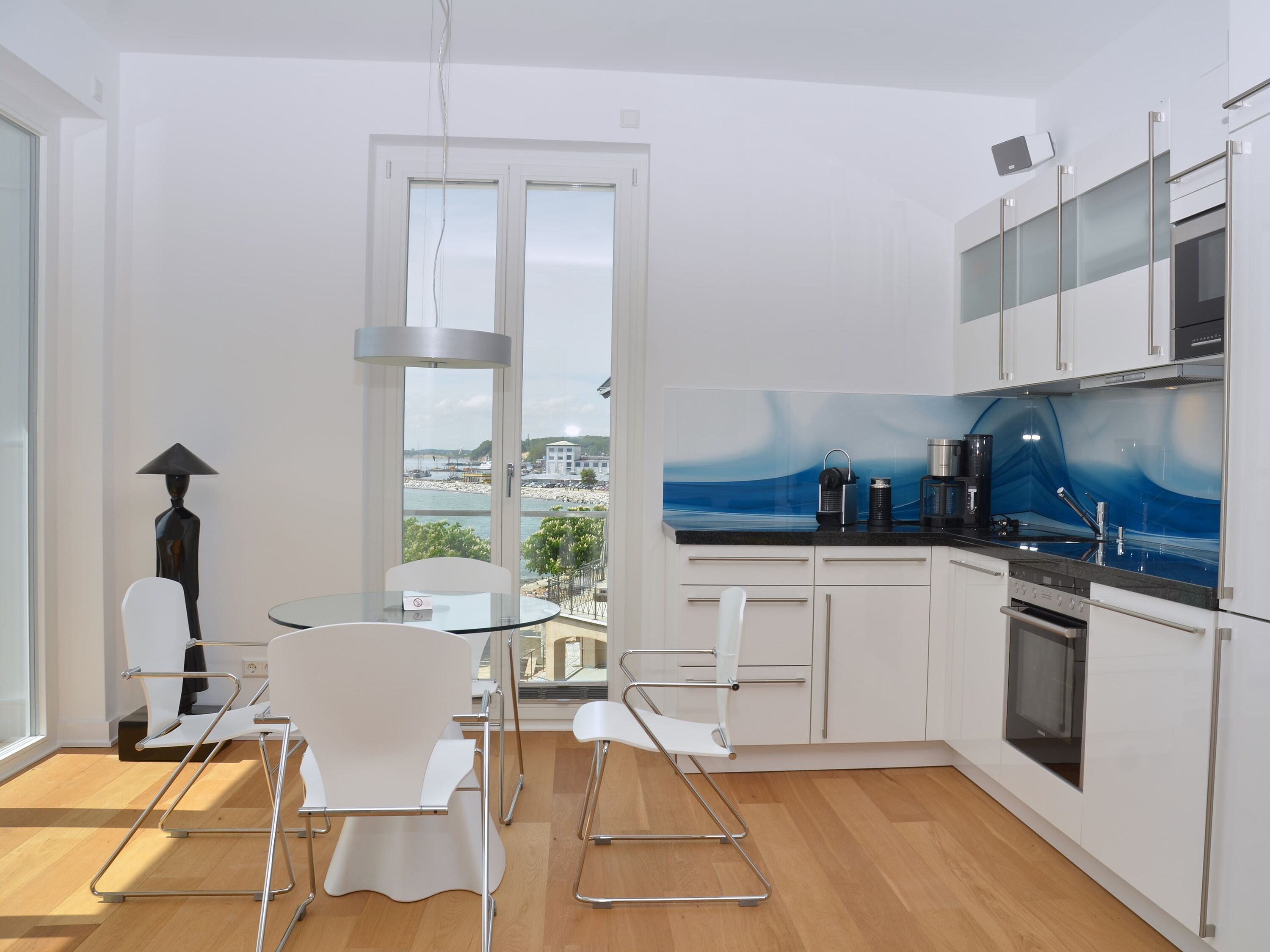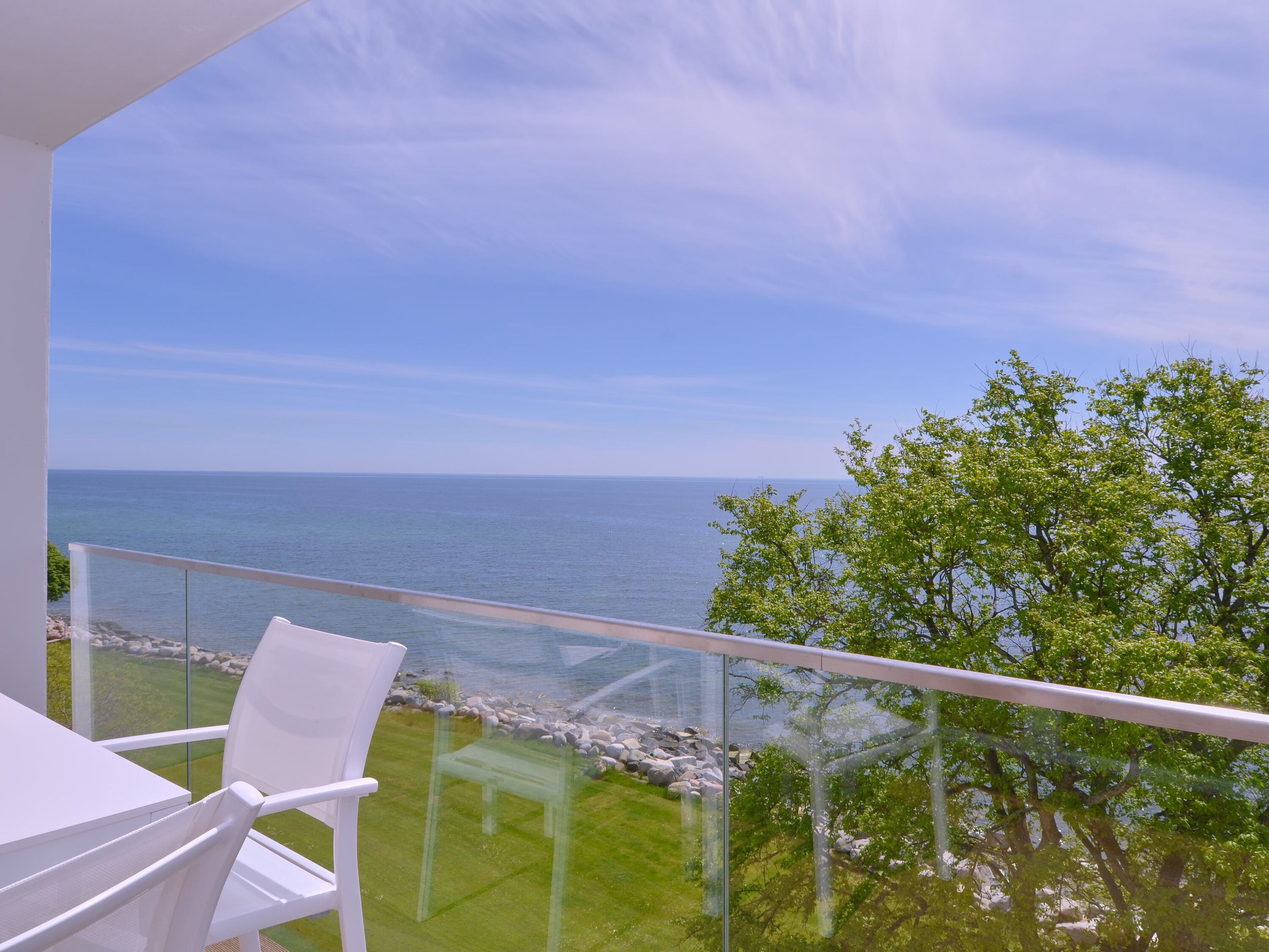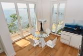 Die sehr schöne, windgeschützte Loggia ist nach Südwesten ausgerichtet und eröffnet durch bodentiefe Fenster einen spektakulären Blick über das Meer, den Hafen und die Sassnitzer Hafenpromenade. Der daran anschließende, kleine Balkon lädt zum Sonnenbad mit Ostseeblick ein. Die Balkon- bzw. Terrassenmöbel stehen saisonal - in der Regel von Mai bis Ende September - zur Verfügung.