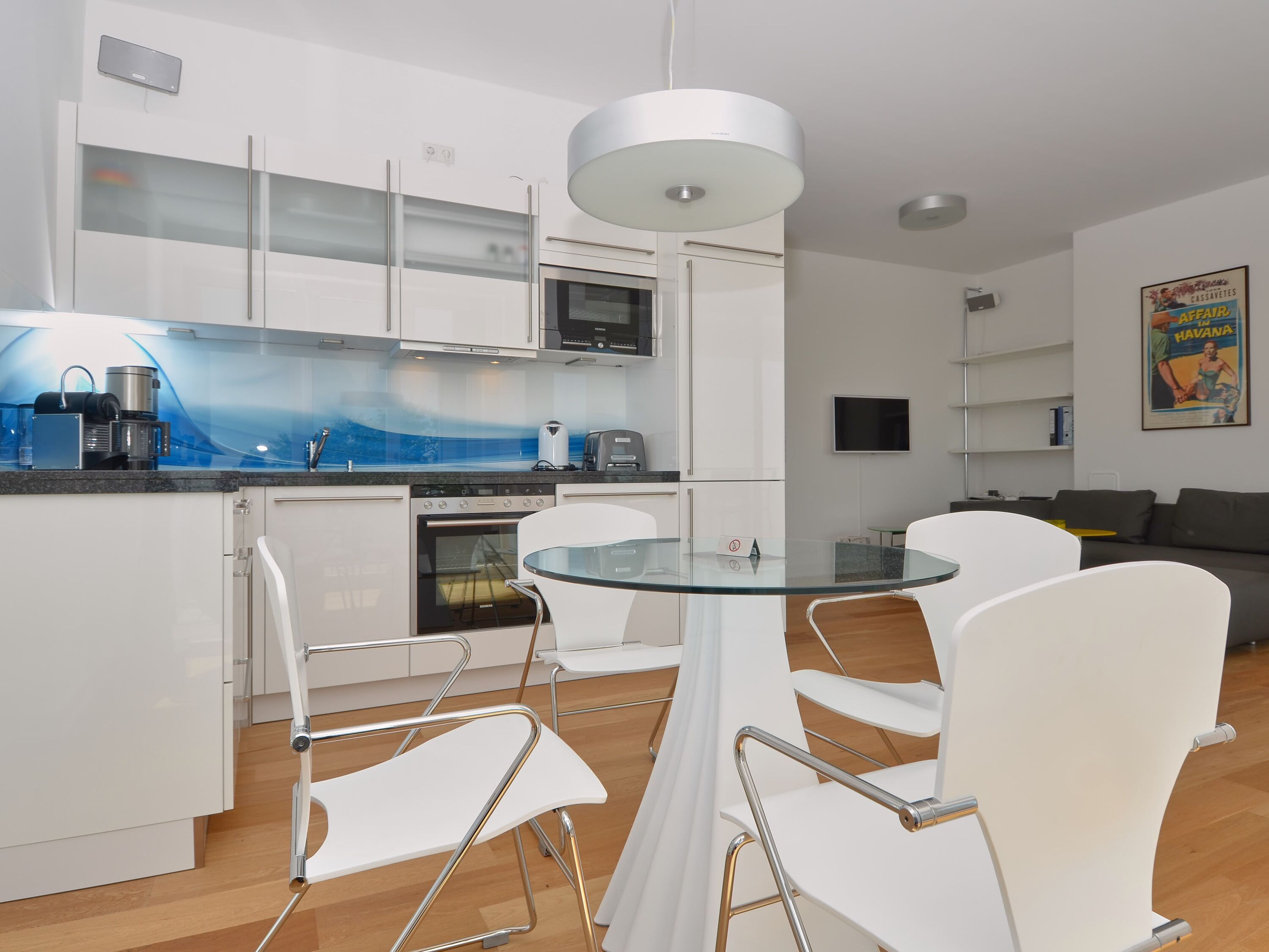 Die im Wohn-/Essbereich harmonisch integrierte Küche mit ihrer hervorragenden Ausstattung mit einem 4-Zonen-Ceran-Induktionskochfeld, einem Backofen, einem Kühlschrank mit Gefrierfach, eine Nespresso-Kaffeemaschine (Kapseln sind nicht vorhanden), einer Spülmaschine, einer Mikrowelle, Kaffeemaschine, Toaster und diversem Kleininventar machen das Kochen in diesem Penthouse zu einem besonderen Erlebnis.