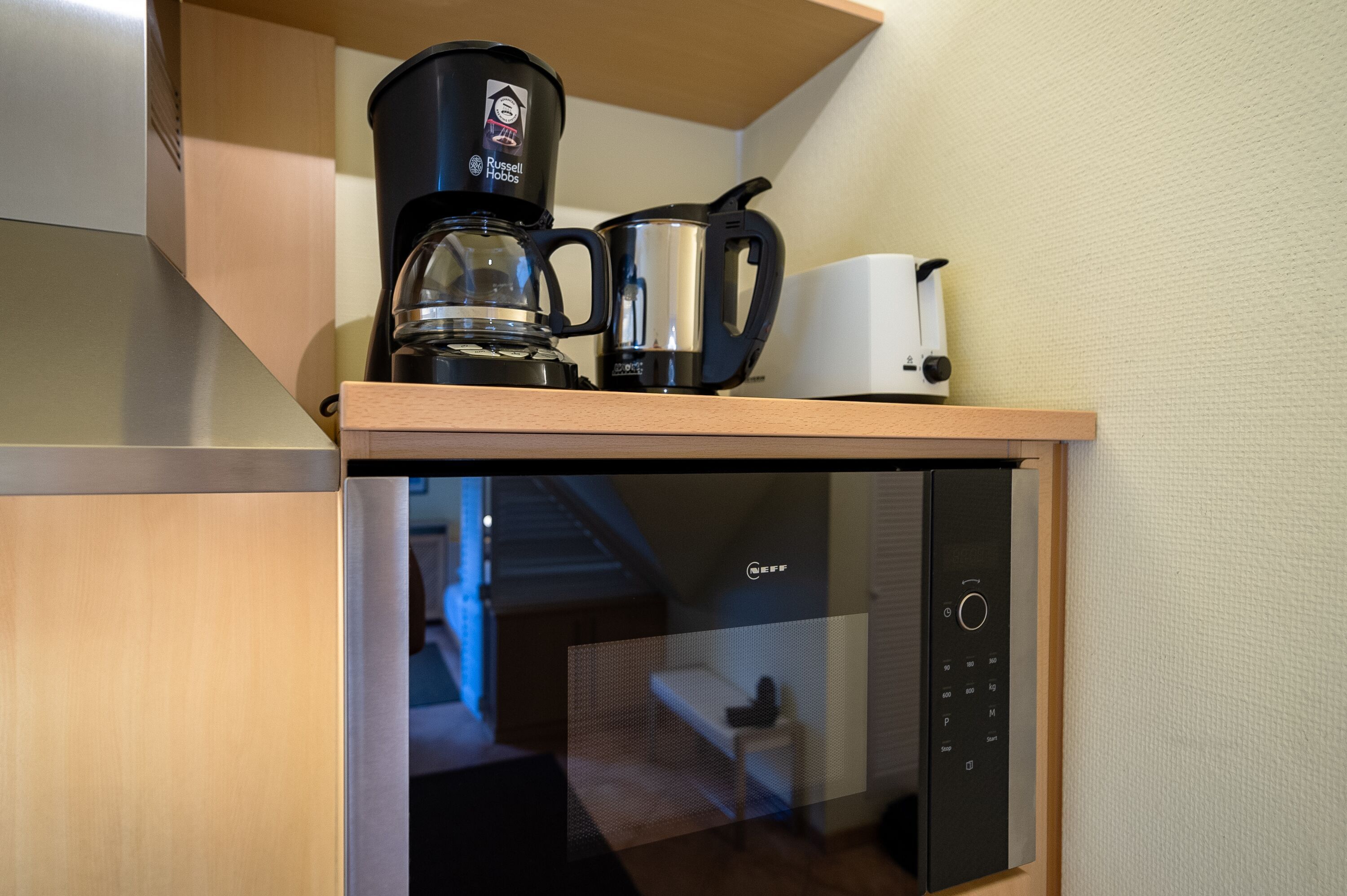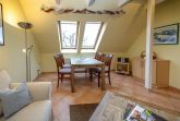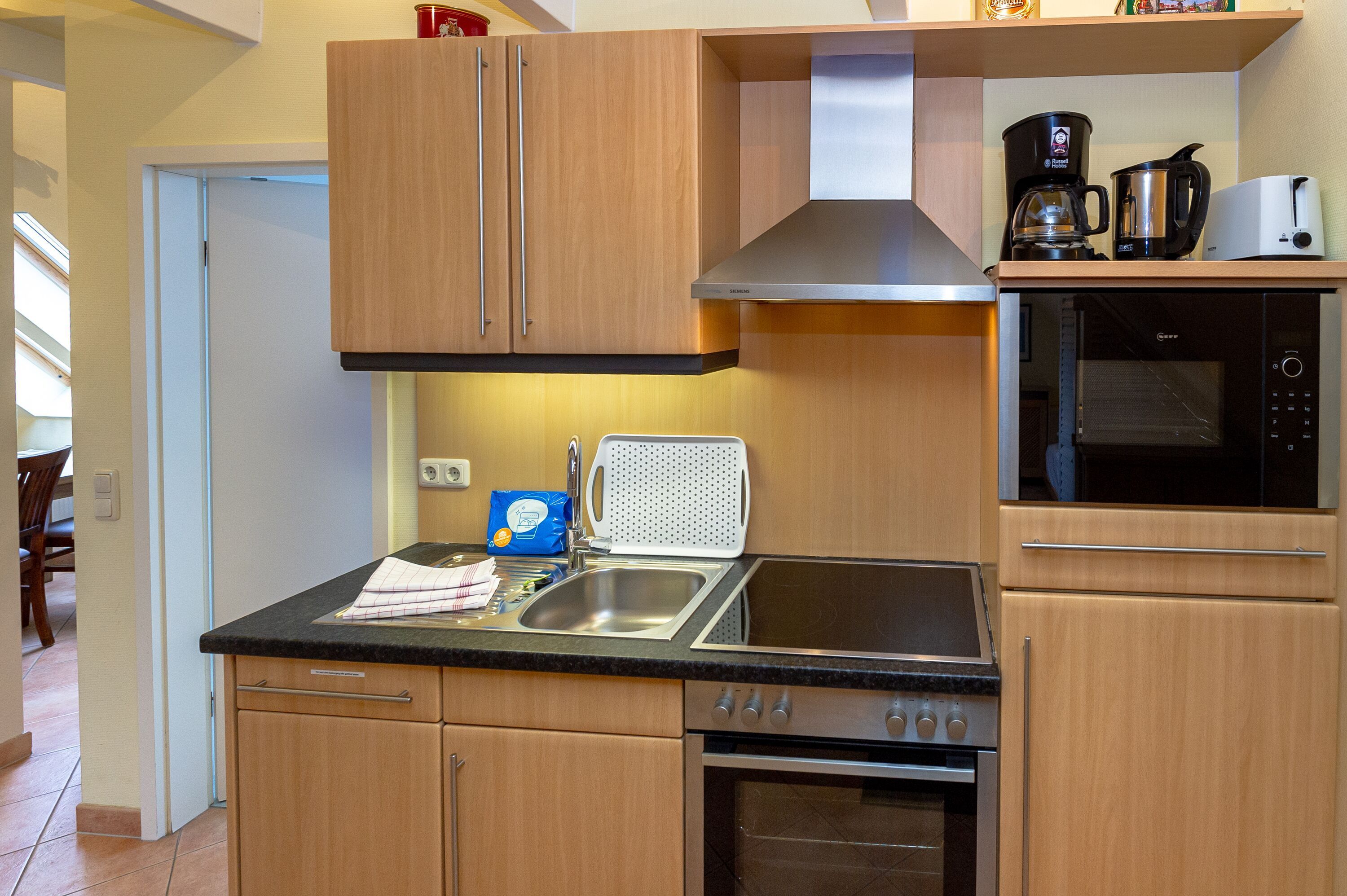 Die harmonisch in den Wohnbereich integrierte Küchenzeile ist mit einem Kühlschrank, einem 4-Zonen-Ceranherd, einem Backofen, einer Mikrowelle, Wasserkocher, Kaffeemaschine, Toaster, diversem Kleininventar und einer amerikanischen Küchentheke mit zwei Barhockern ausgestattet. Nur etwa zwei Gehminuten entfernt bieten Ihnen gleich zwei Bäcker eine reichhaltige Auswahl, dazu finden Sie wenige Schritte weiter einen gut sortierten Einkaufsmarkt. Der Esstisch bietet genügend Platz für 4 Personen.