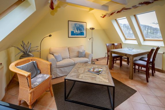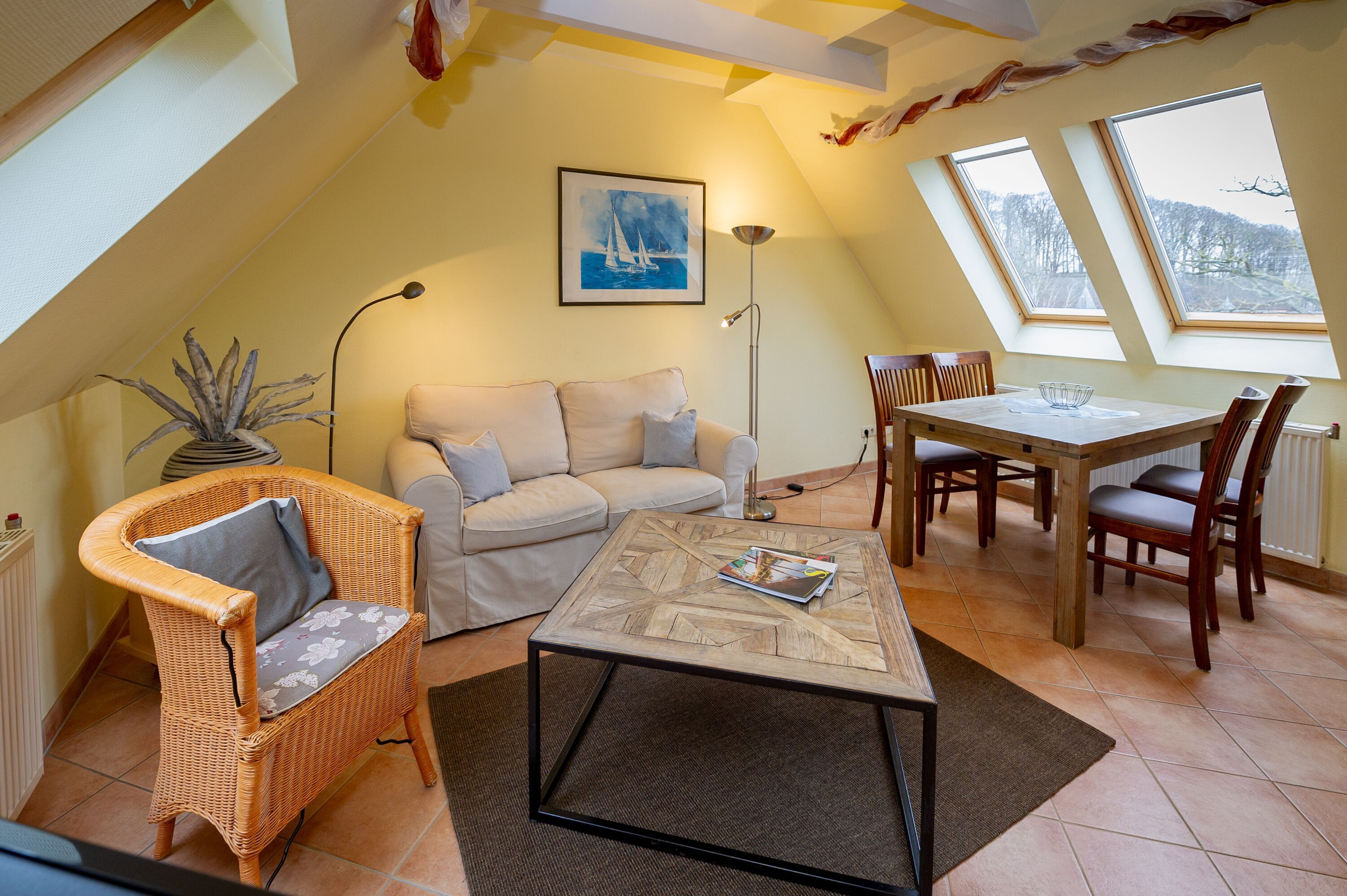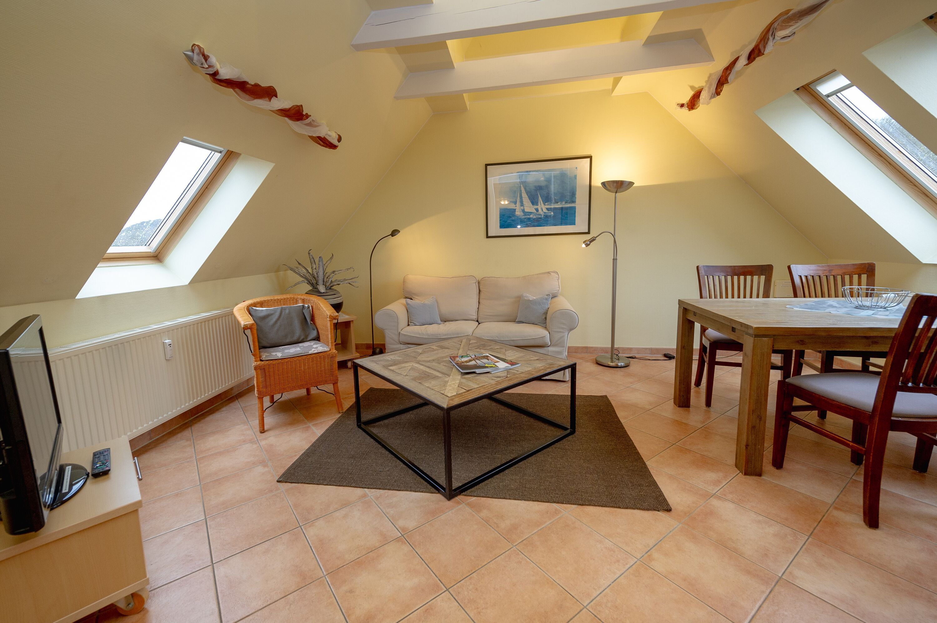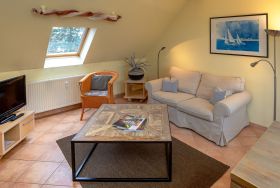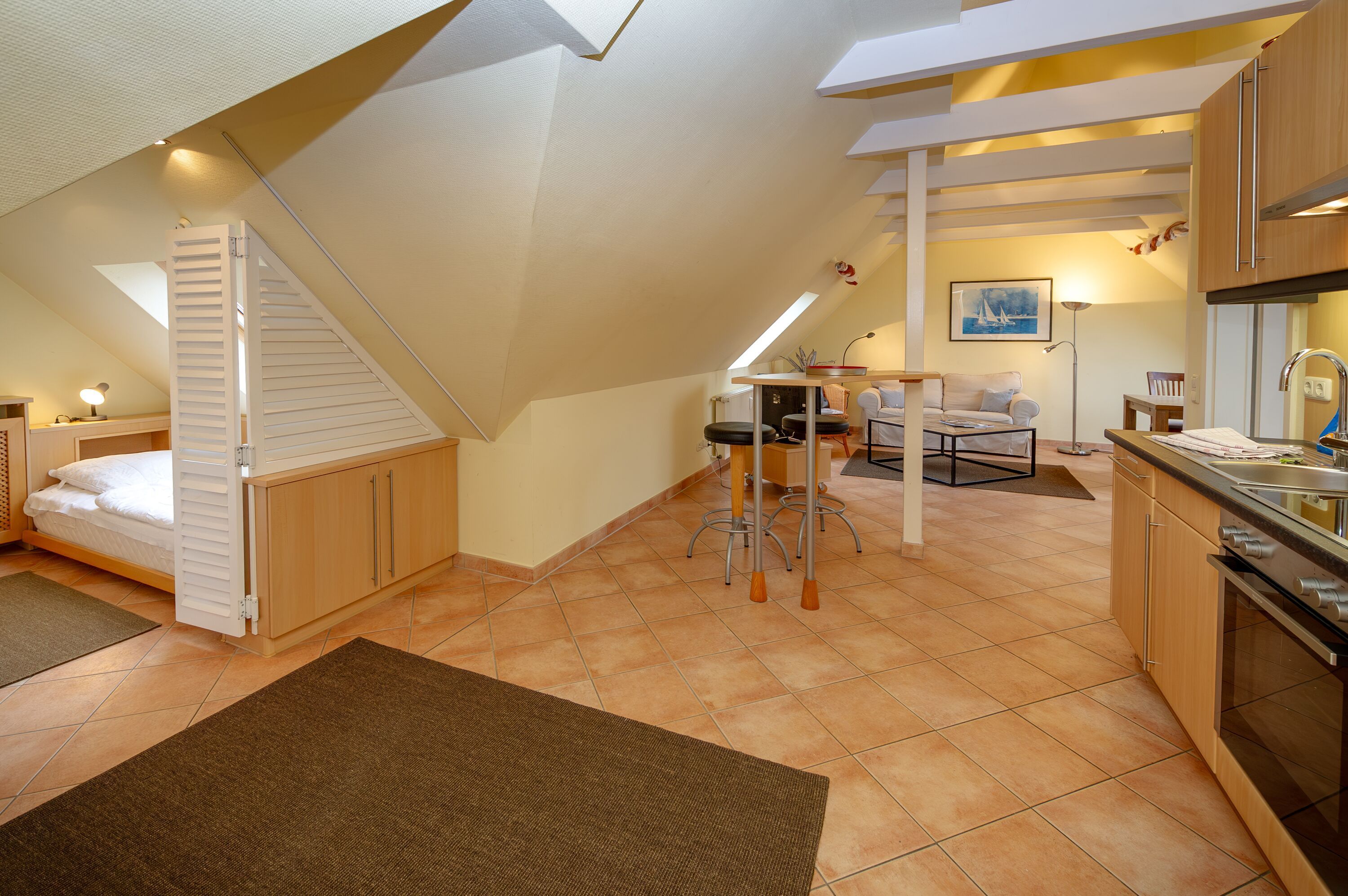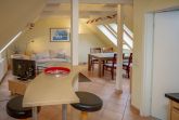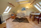 Dieses zauberhafte 3-Raum-Penthouse mit rund 58m² Wohnfläche erwartet Sie im dritten OG/Dachgeschoss. Herzstück Ihres Zuhauses auf Zeit ist der ca. 20m² große, freundliche Wohnbereich, der Sie unter gemütlichen Dachschrägen mit einer bequemen Couch, einem Korbsessel, einem LCD-TV sowie einer Mini-Stereoanlage mit Radio/CD-Player zu behaglichen Stunden einlädt. Internet per LAN und W-LAN steht Ihnen zur kostenfreien Verfügung.