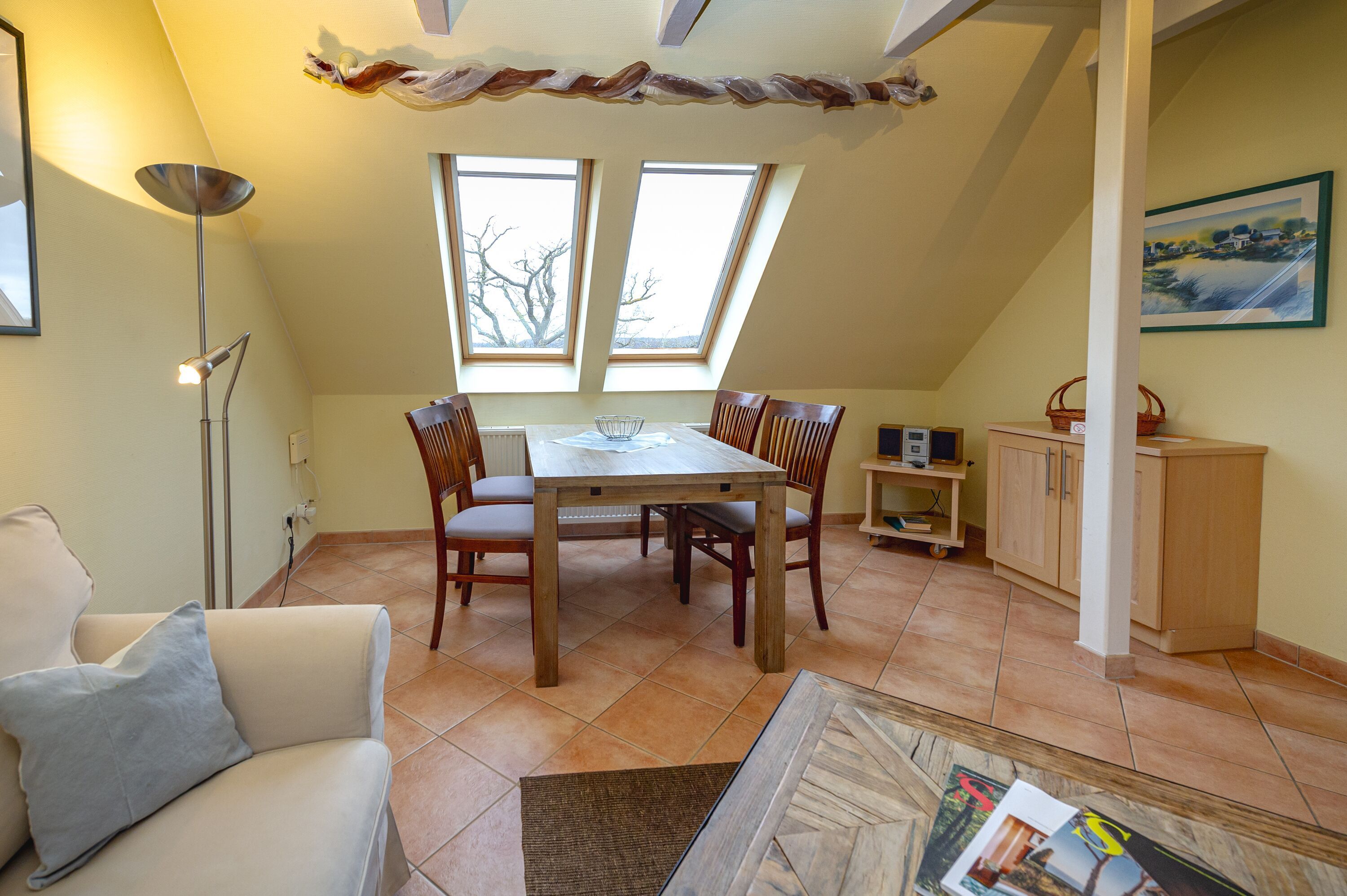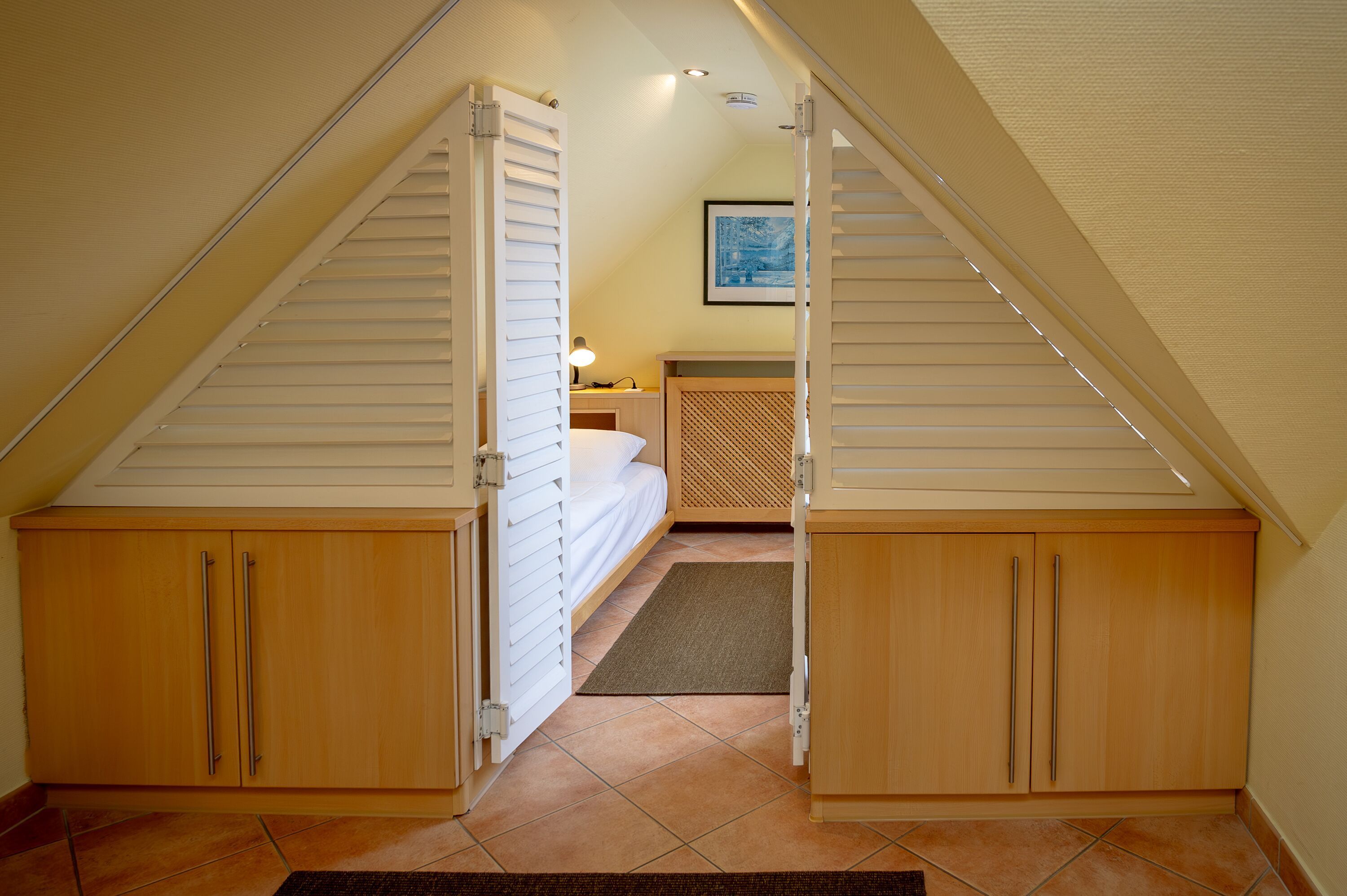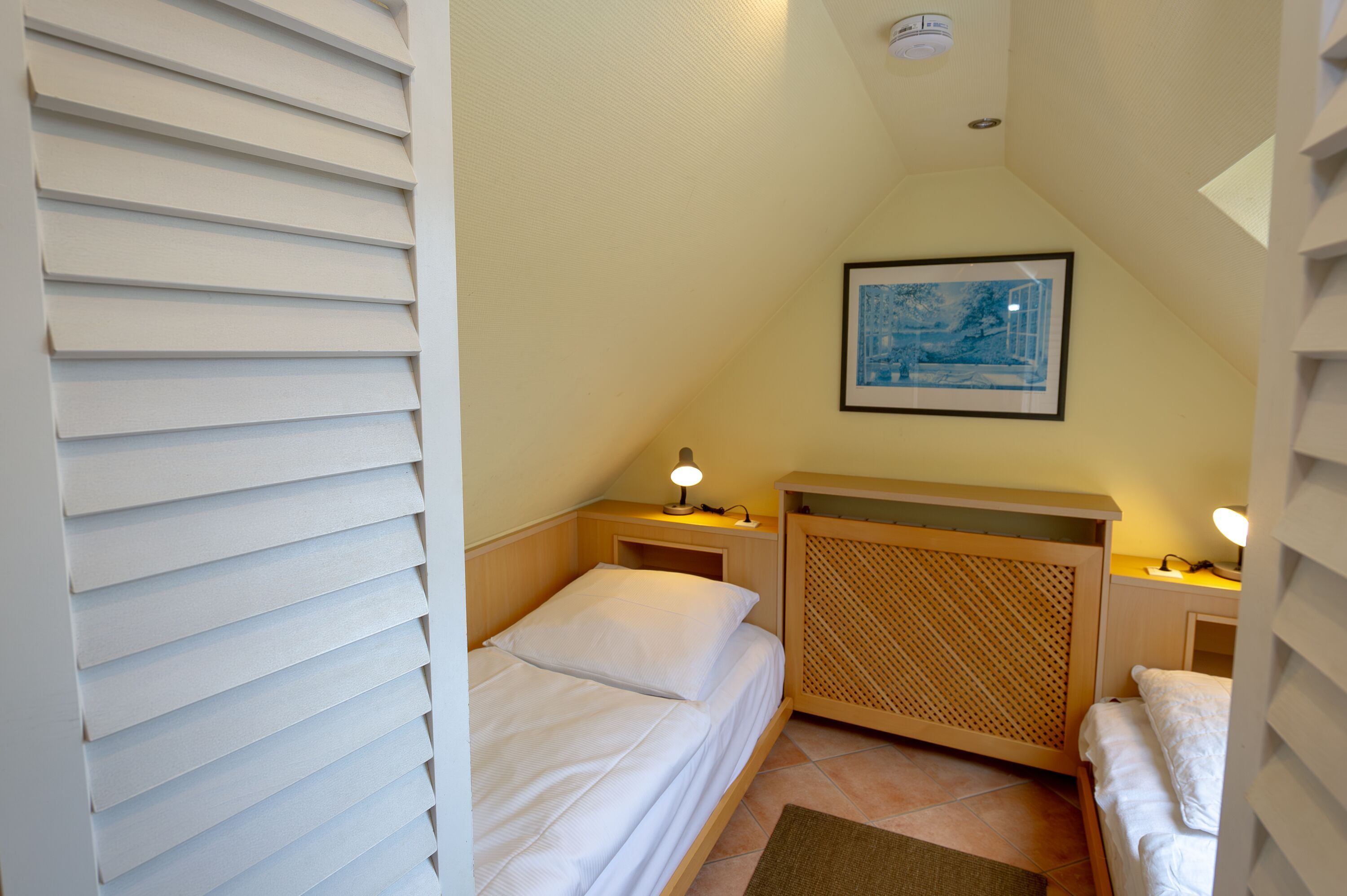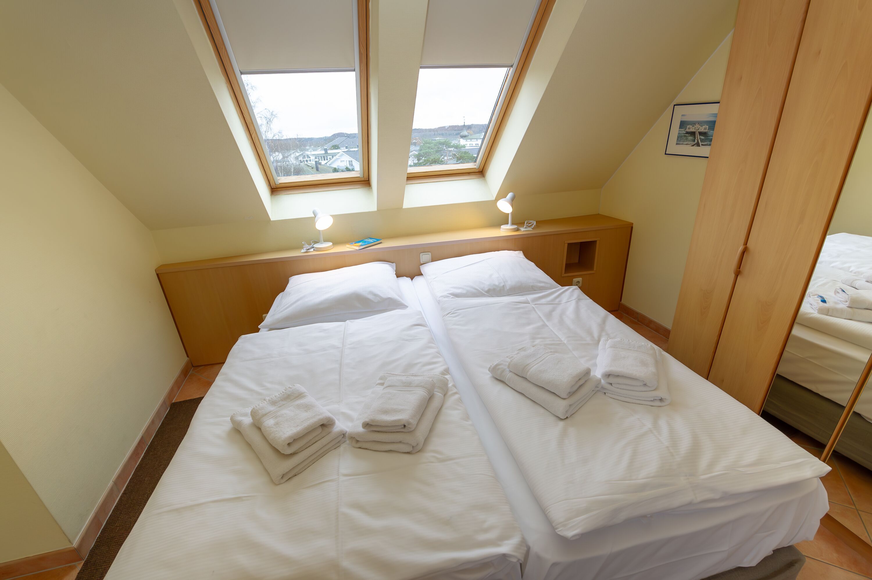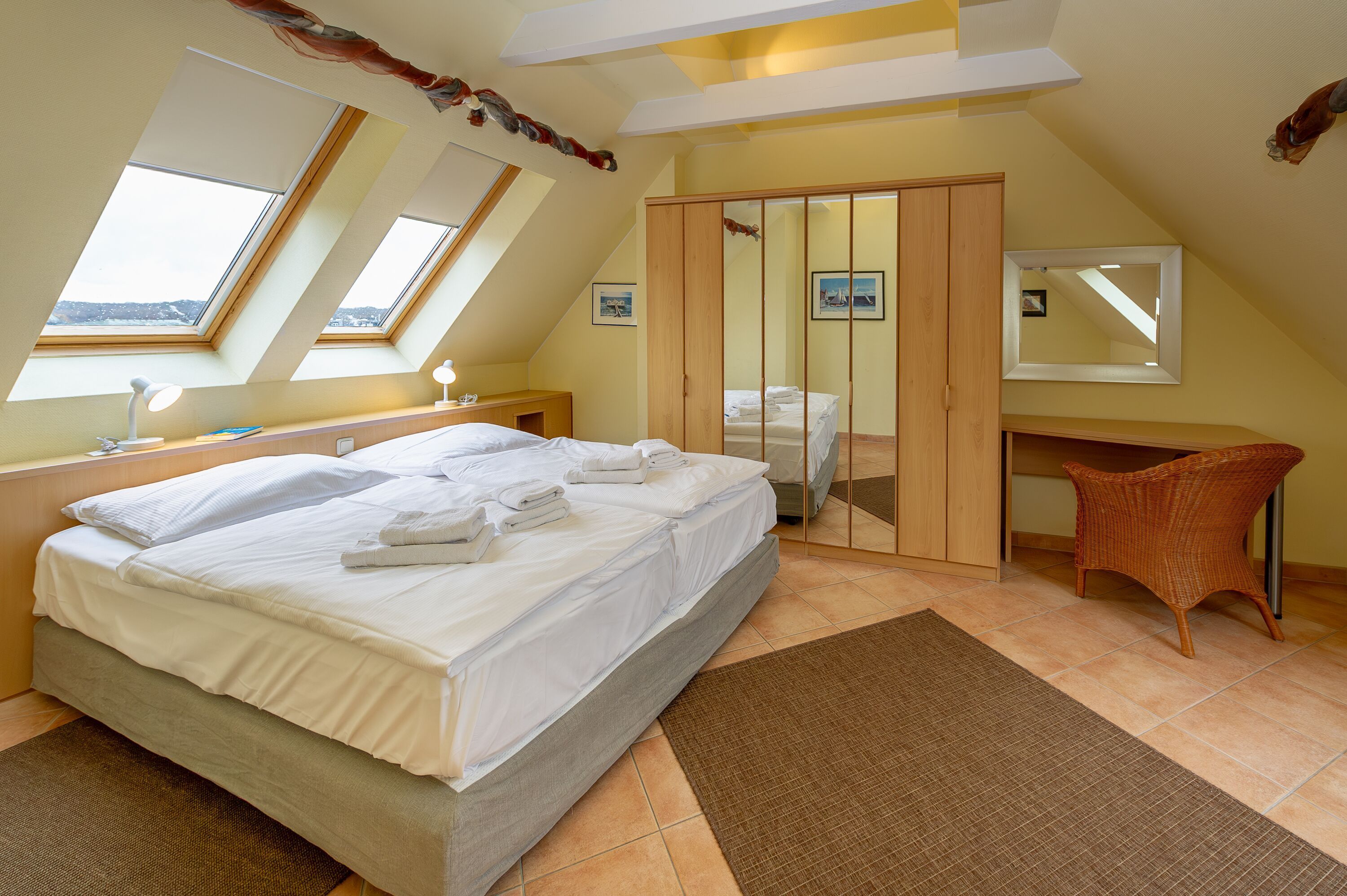Das Appartement verfügt über zwei unterschiedlich große, freundliche Schlafzimmer. Ein Schlafzimmer ist großzügig geschnitten und mit einem Doppelbett sowie einem großen Schrank für Ihre Urlaubsgarderobe eingerichtet. Das zweite Schlafzimmer ist eine kuschelige kleine Schlafnische unter Dachschrägen mit zwei Einzelbetten - ideal geeignet für zwei Kinder, aber natürlich auch für Erwachsene.