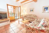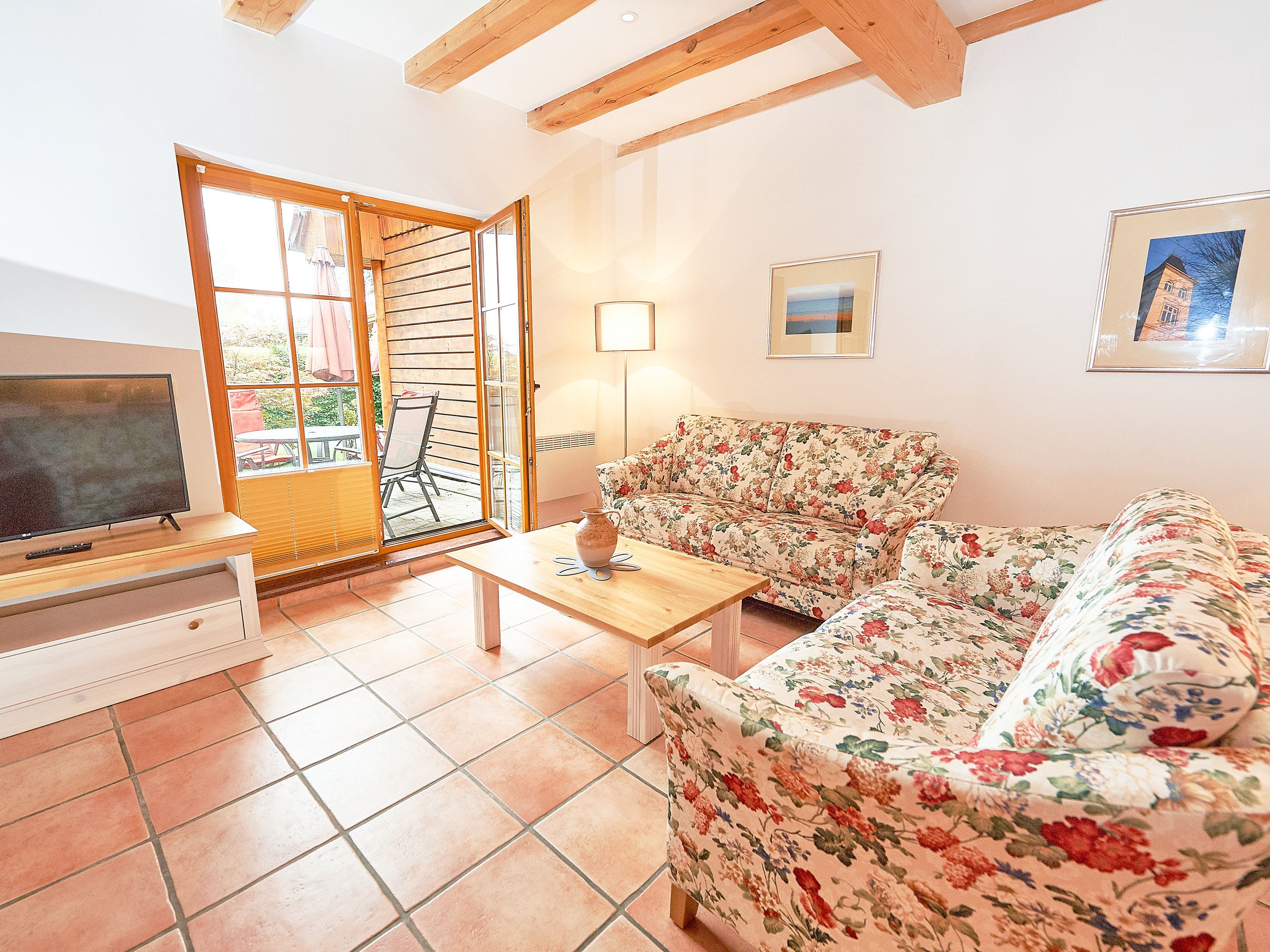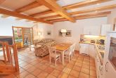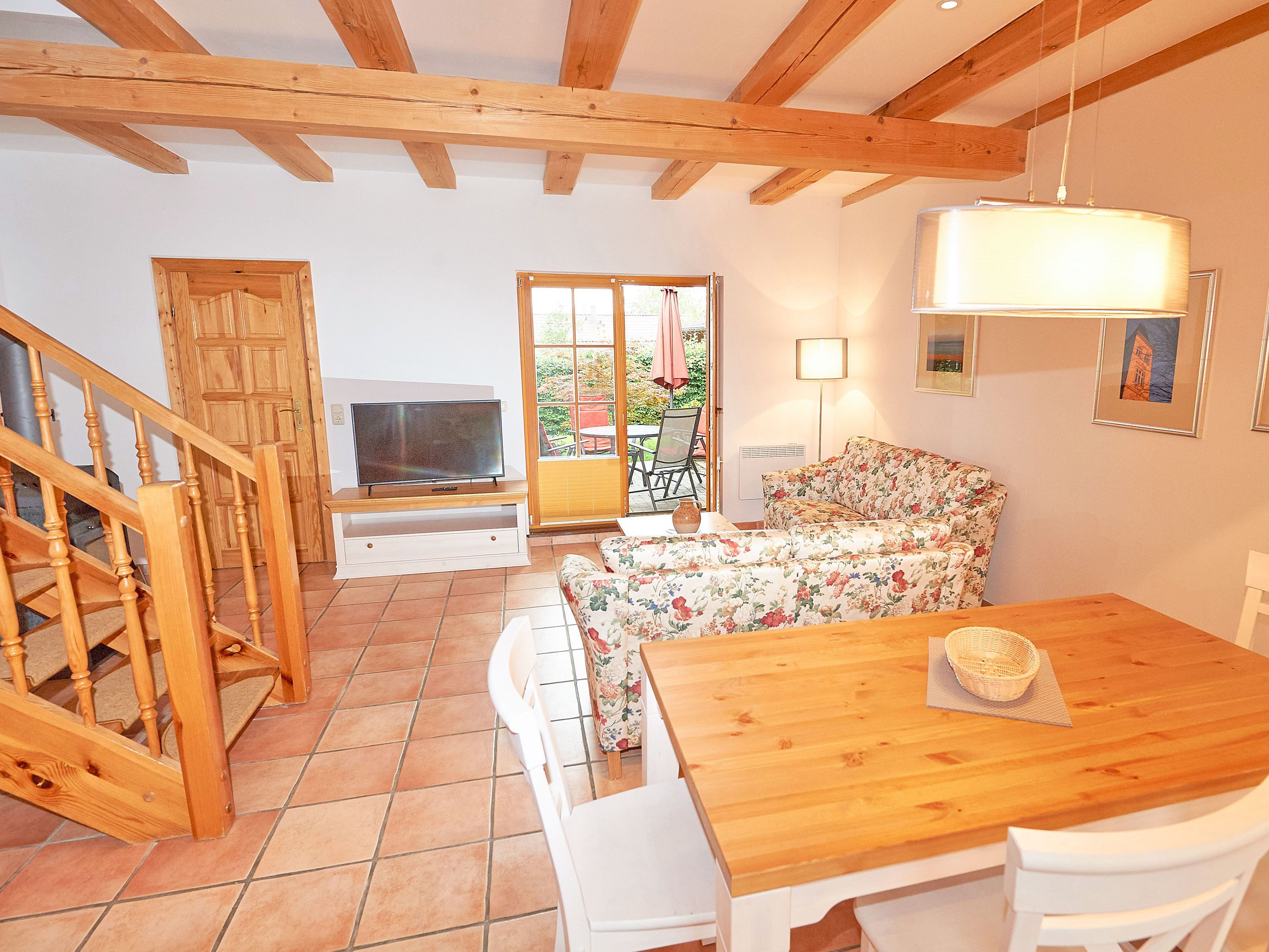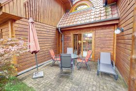 Die Haushälfte 2 erstreckt sich auf zwei Etagen über ca. 100 m² Wohnfläche und verfügt im Erdgeschoss über ein großes und funktional eingerichtetes Wohnzimmer, das durch die offenen Balken besonders gemütlich wirkt. Die Terrasse zur Westseite ist mit Sonnenliegen und Sitzgruppe ausgestattet.