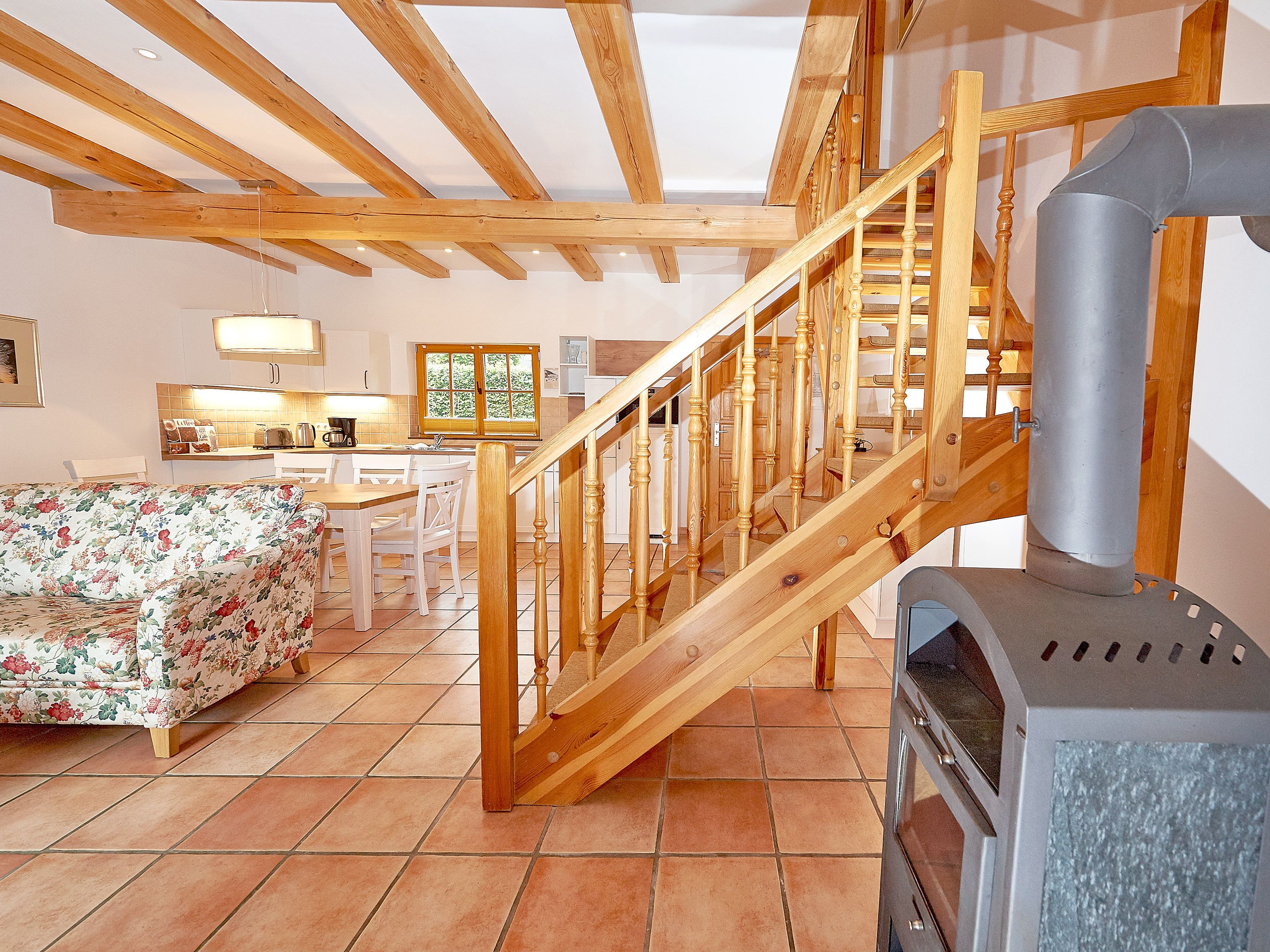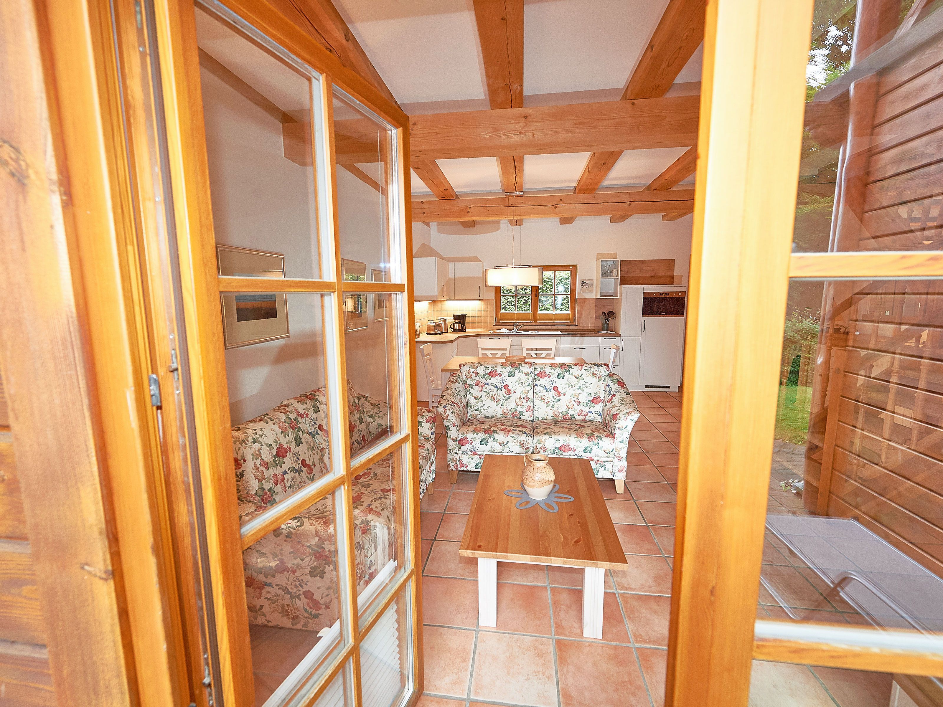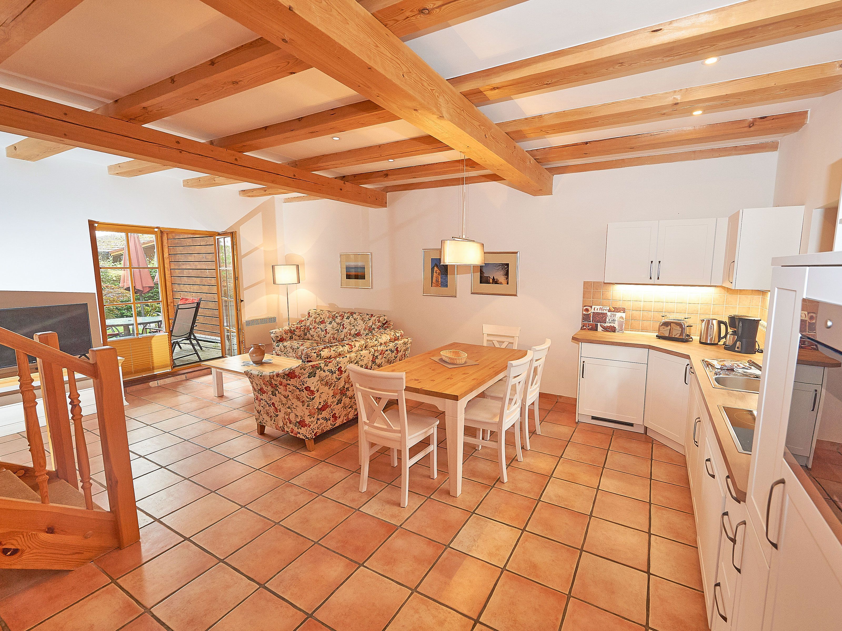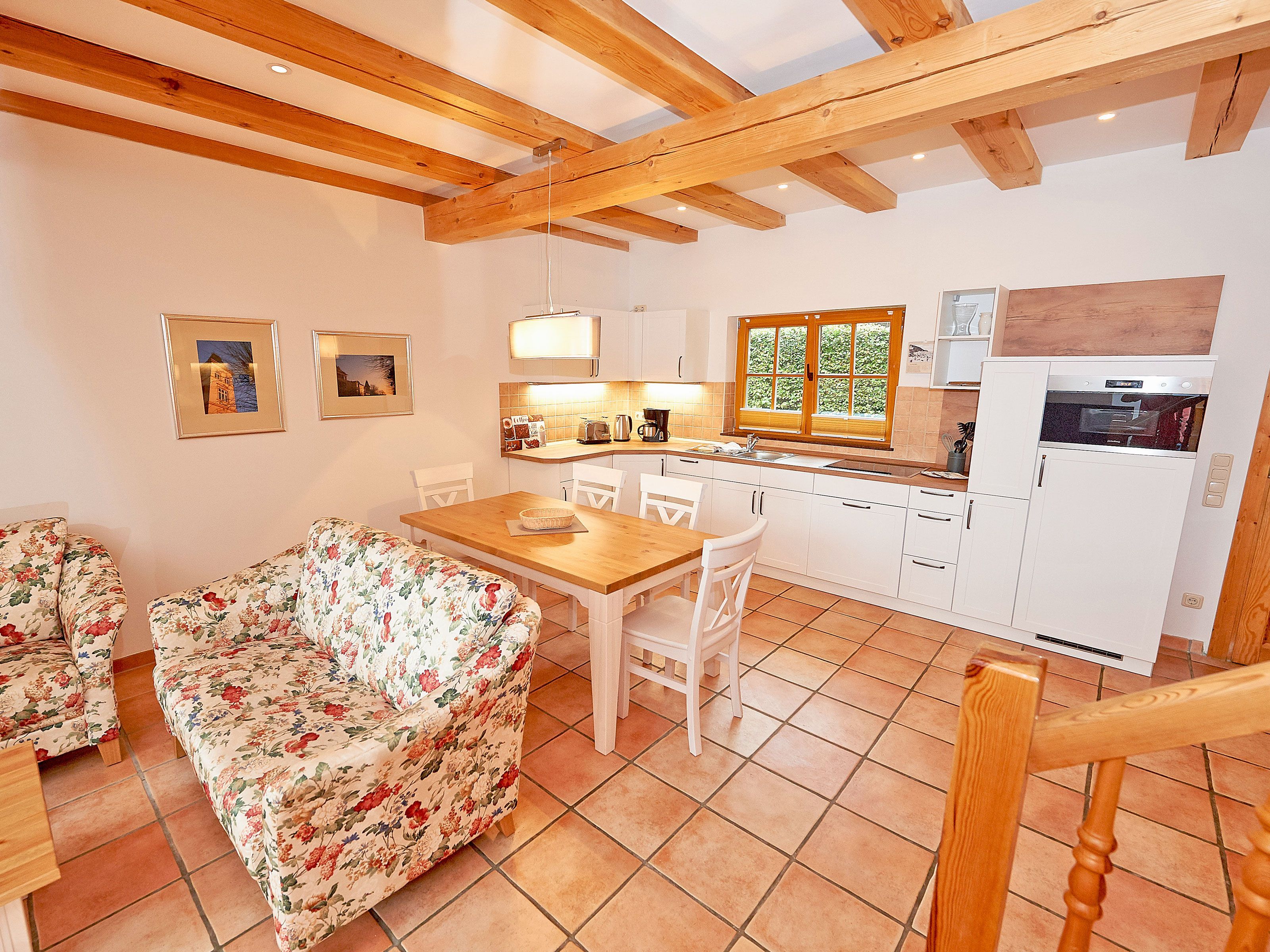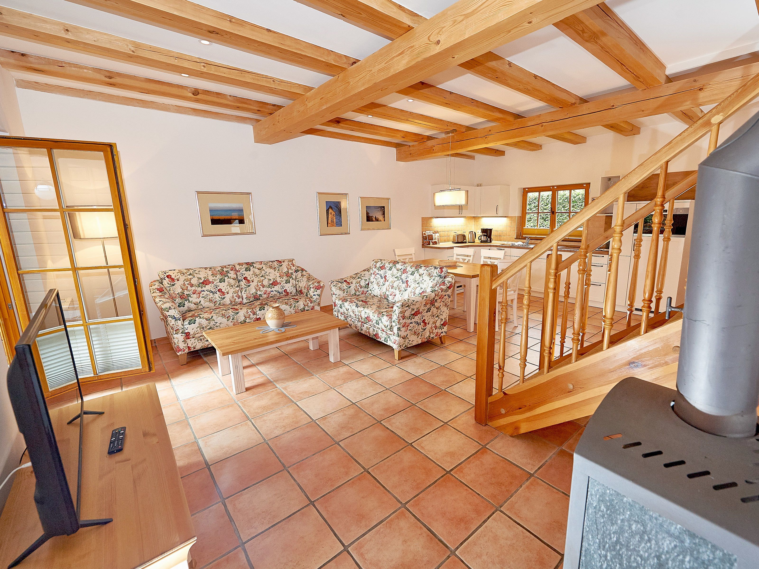 Zwei bequeme Sofas vor dem großen Flachbild-TV, kostenfreies W-LAN und der Kaminofen ermöglichen rund ums Jahr angenehme Abende. Der große Esstisch ist für 4 Personen geeignet. Die harmonisch im Wohnbereich integrierte Küchenzeile ist ausgestattet mit einem 4-Zonen-Cerankochfeld, einem Kühlschrank mit Gefriermöglichkeit, einer Spülmaschine, einer Mikrowelle mit Grill, Kaffeemaschine, Toaster, Wasserkocher und diversem Kleininventar, das die Ausstattung komplettiert. Auch Ihre kostenlos nutzbare Waschmaschine wurde hier untergebracht.