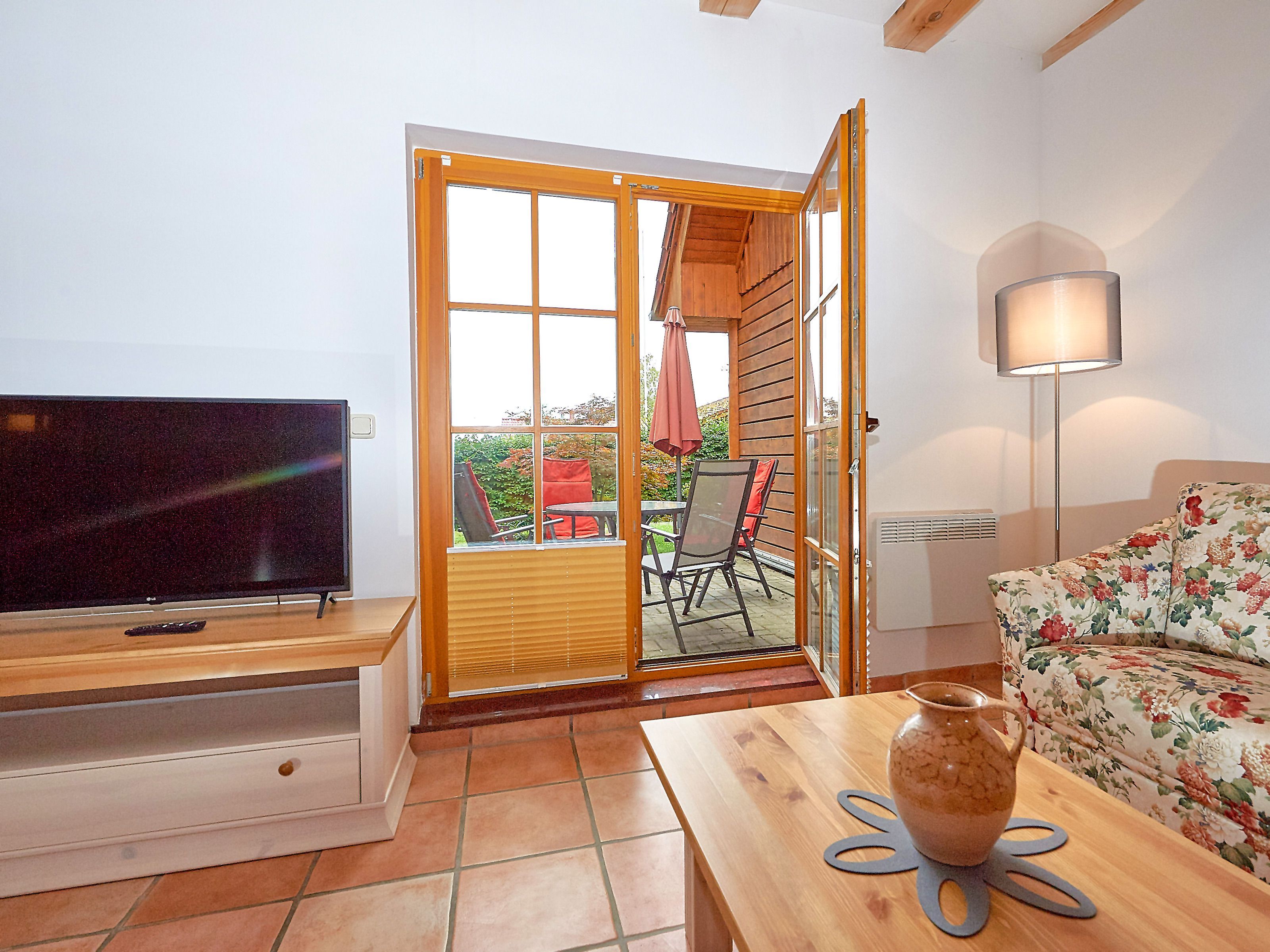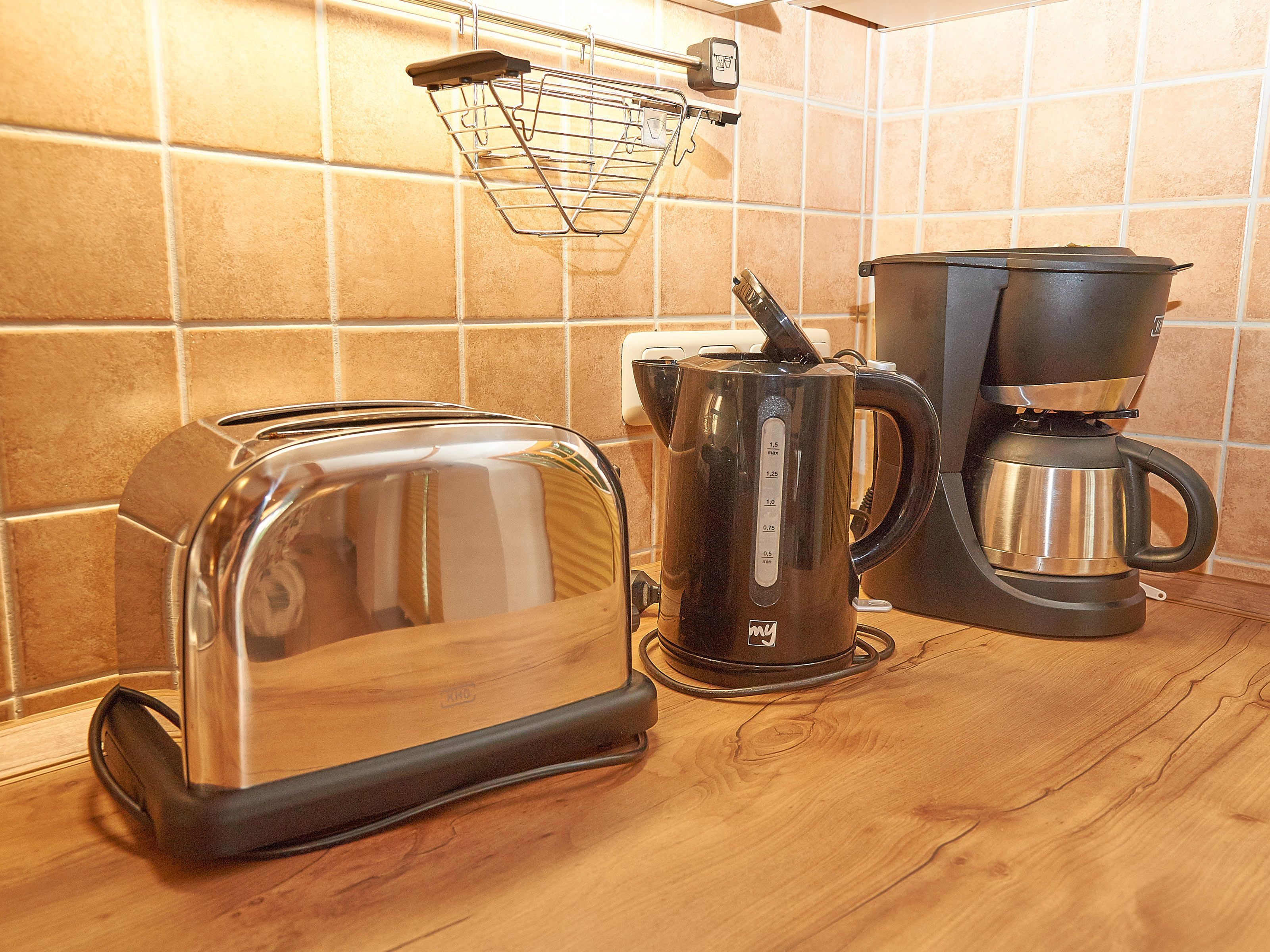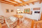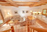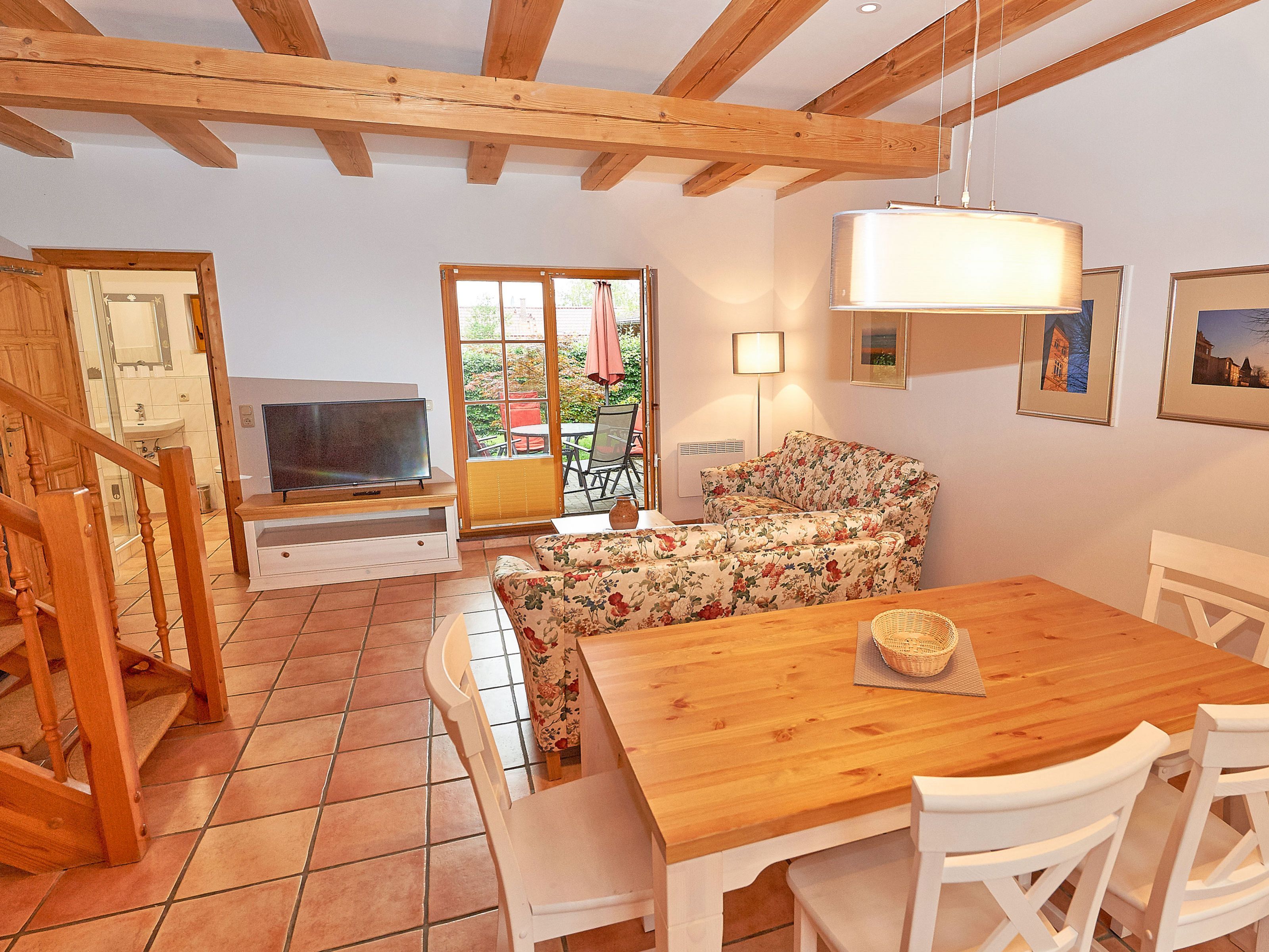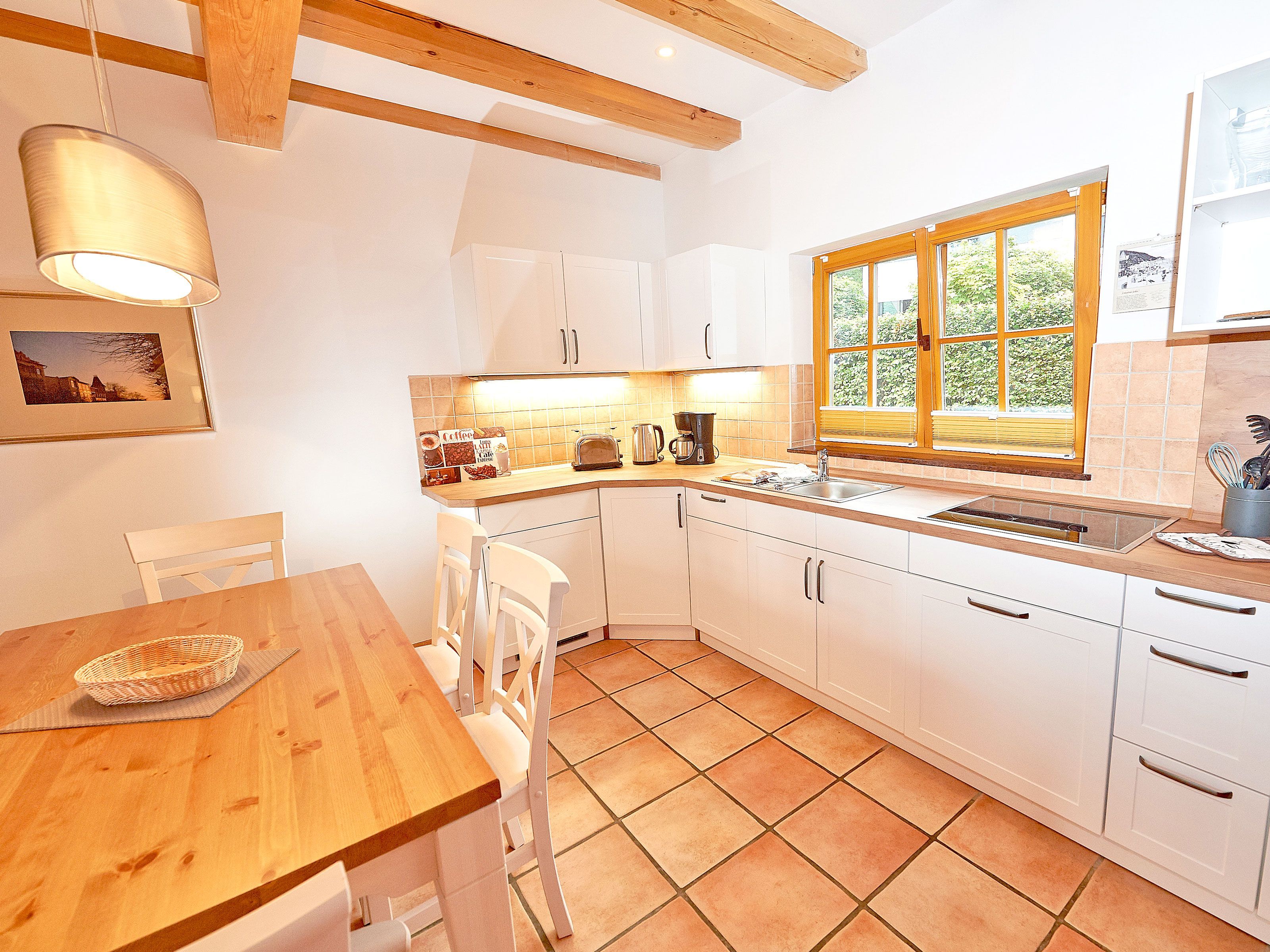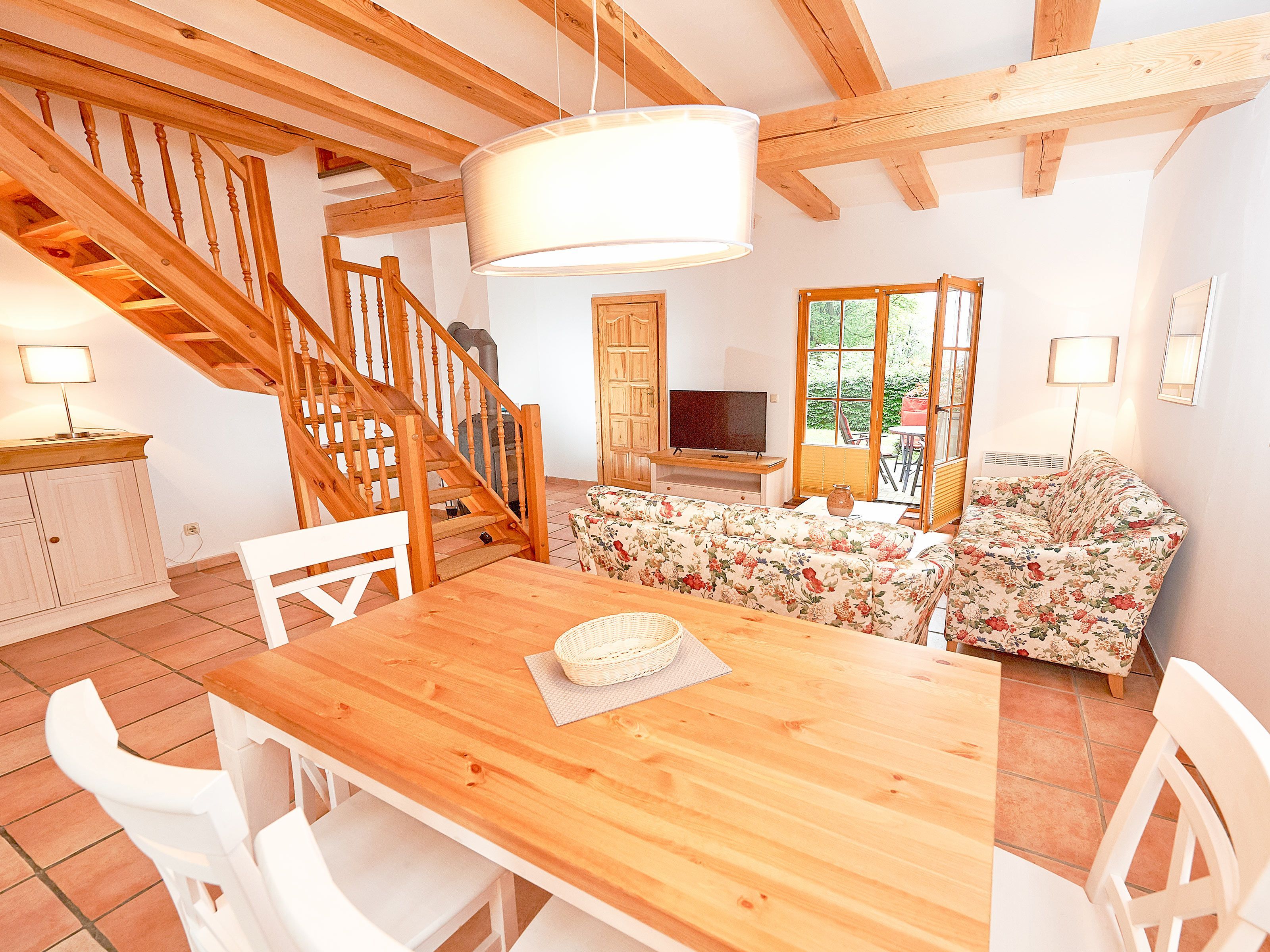 Zwei bequeme Sofas vor dem großen Flachbild-TV, kostenfreies W-LAN und der Kaminofen ermöglichen rund ums Jahr angenehme Abende. Der große Esstisch ist für 4 Personen geeignet. Die harmonisch im Wohnbereich integrierte Küchenzeile ist ausgestattet mit einem 4-Zonen-Cerankochfeld, einem Kühlschrank mit Gefriermöglichkeit, einer Spülmaschine, einer Mikrowelle mit Grill, Kaffeemaschine, Toaster, Wasserkocher und diversem Kleininventar, das die Ausstattung komplettiert. Auch Ihre kostenlos nutzbare Waschmaschine wurde hier untergebracht.