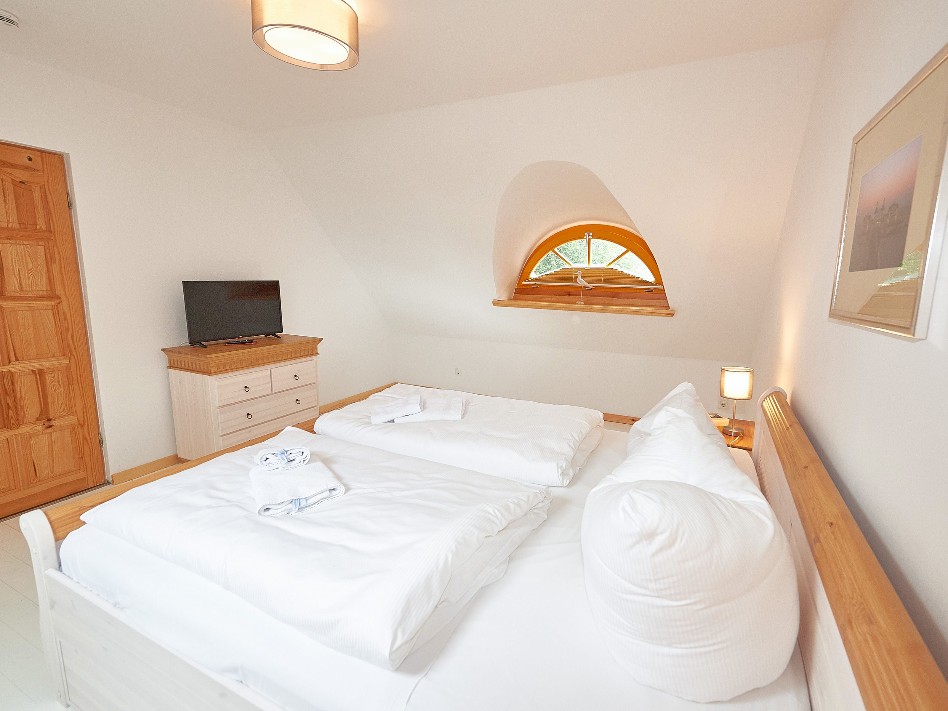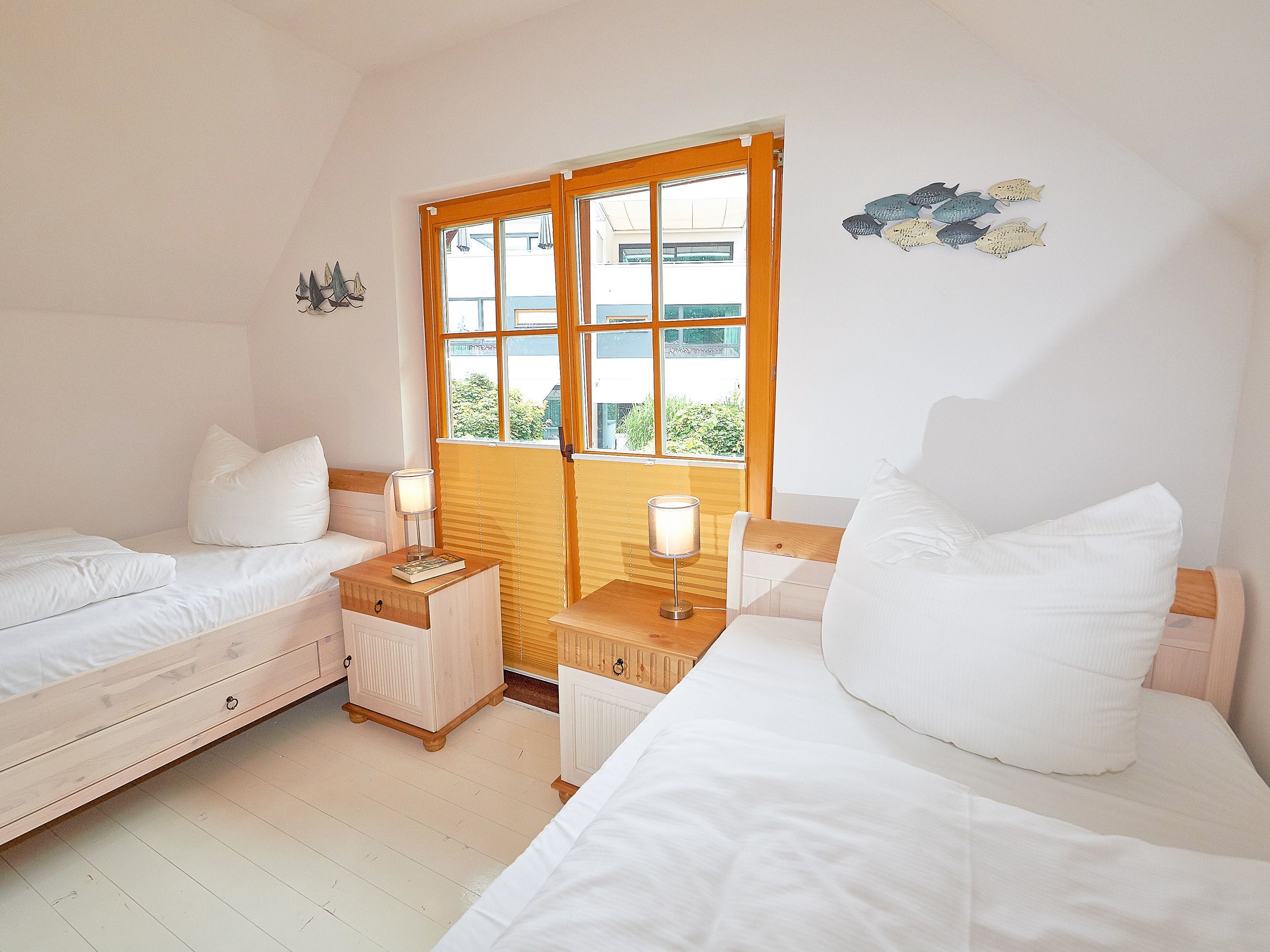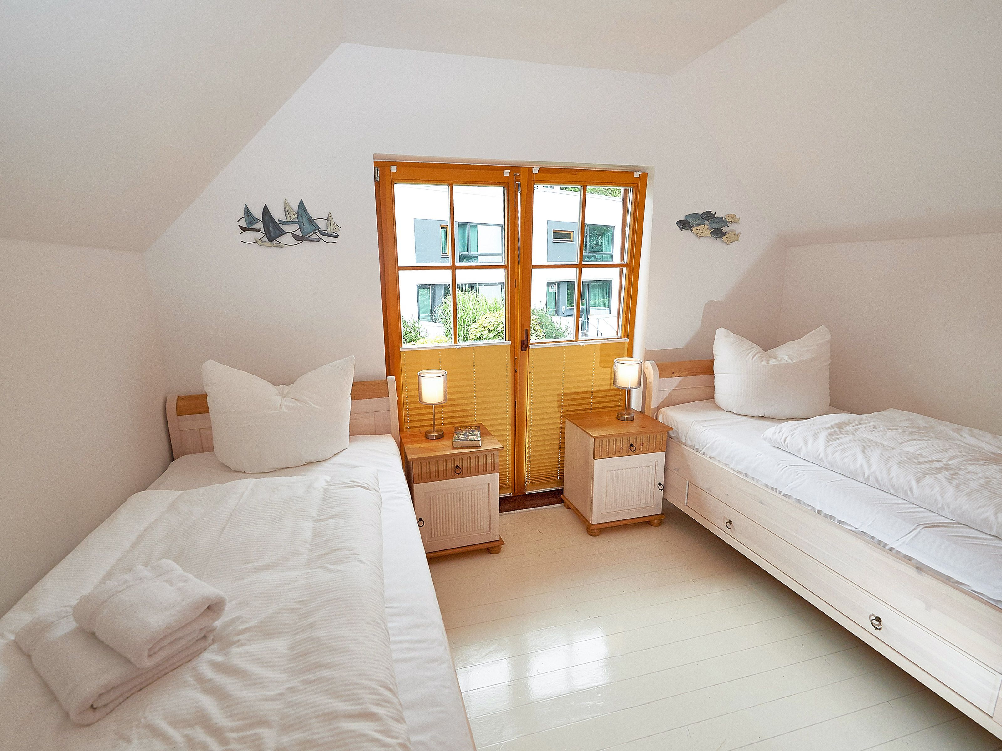 Die beiden Schlafzimmer befinden sich im Obergeschoss. Das größere ist mit einem Doppelbett und einem zusätzlichen Flachbild-TV, das kleinere mit zwei Einzelbetten und Stauraum für Ihre Garderobe ausgestattet.