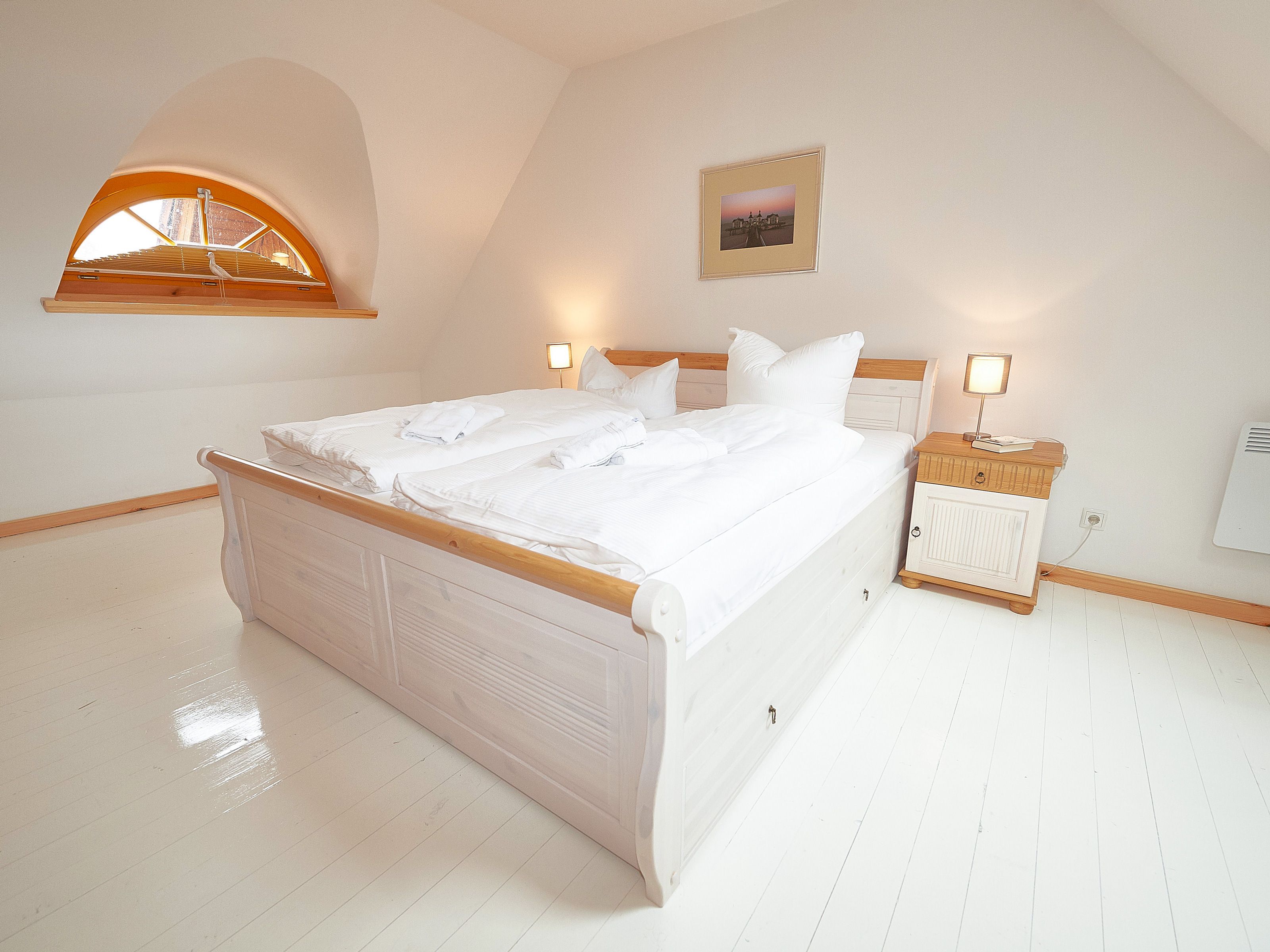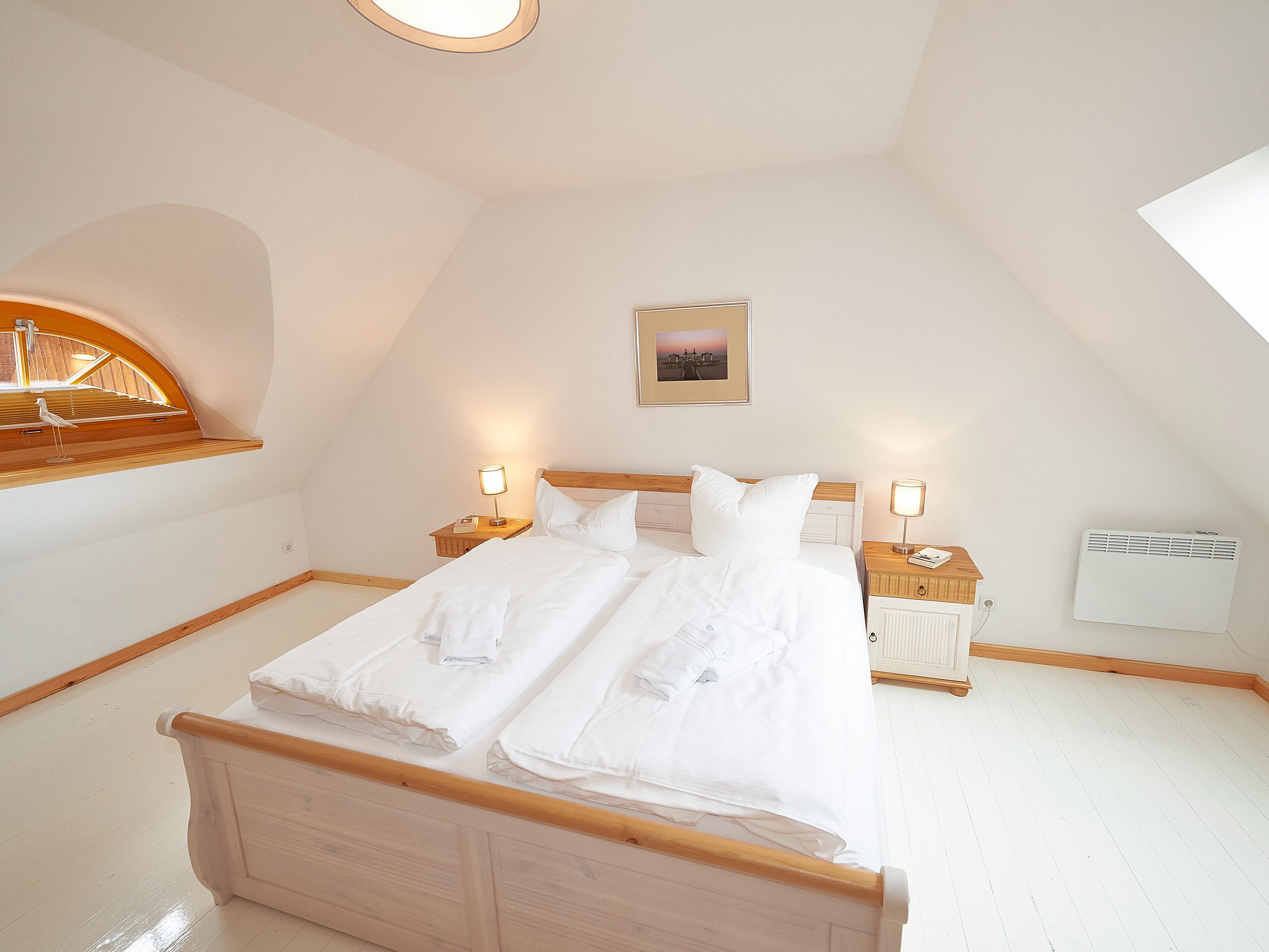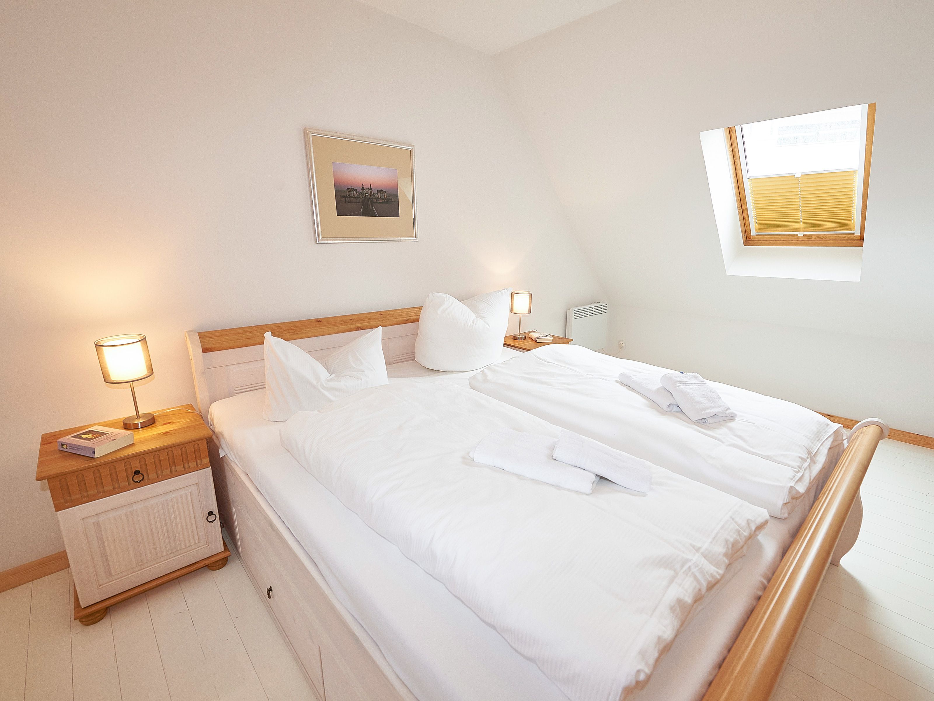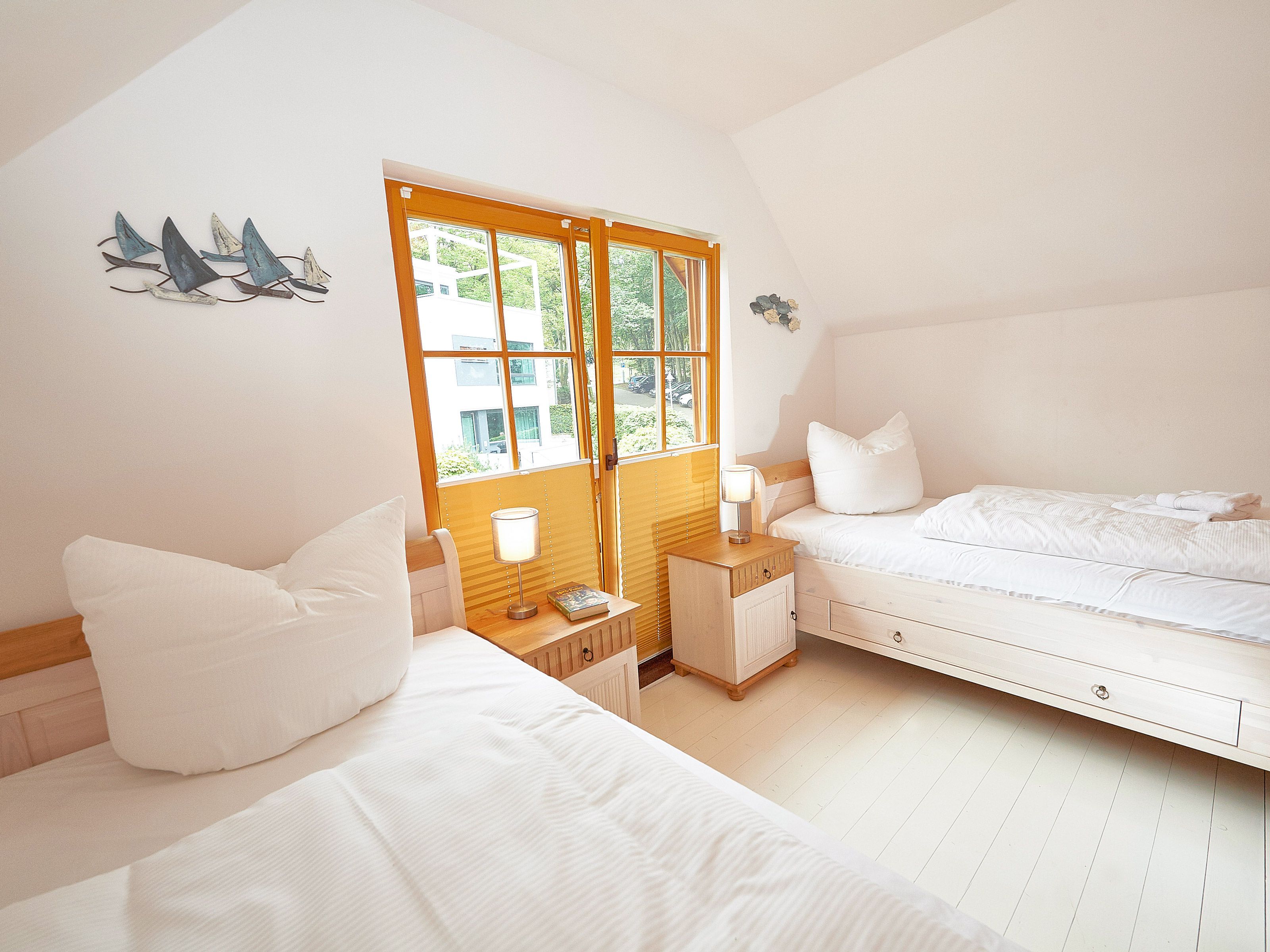 Die beiden Schlafzimmer befinden sich im Obergeschoss. Das größere ist mit einem Doppelbett und einem zusätzlichen Flachbild-TV, das kleinere mit zwei Einzelbetten und Stauraum für Ihre Garderobe ausgestattet.