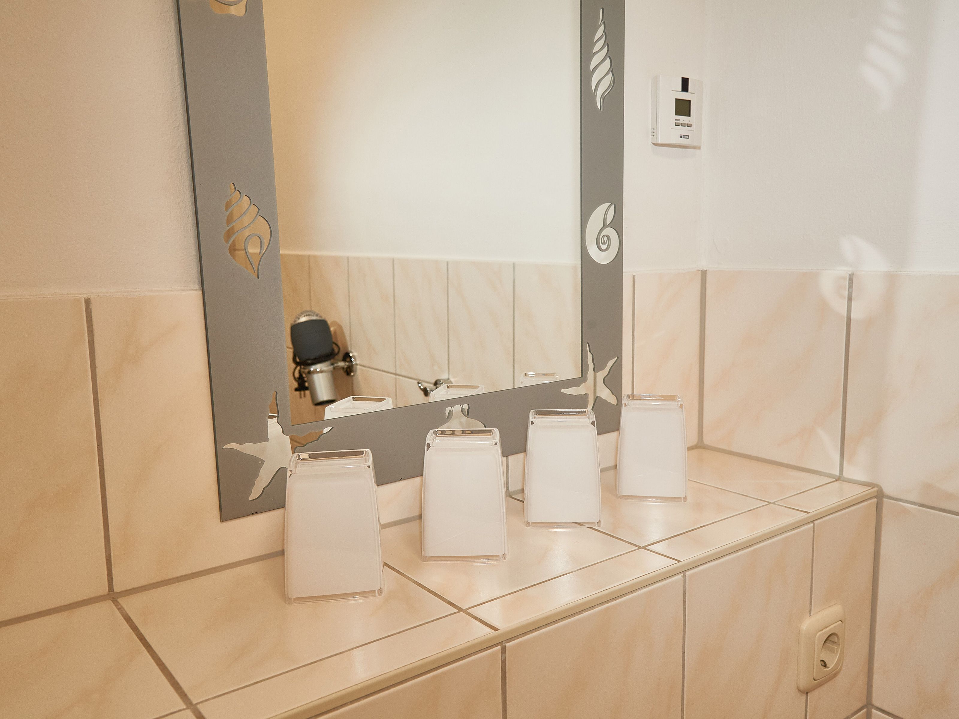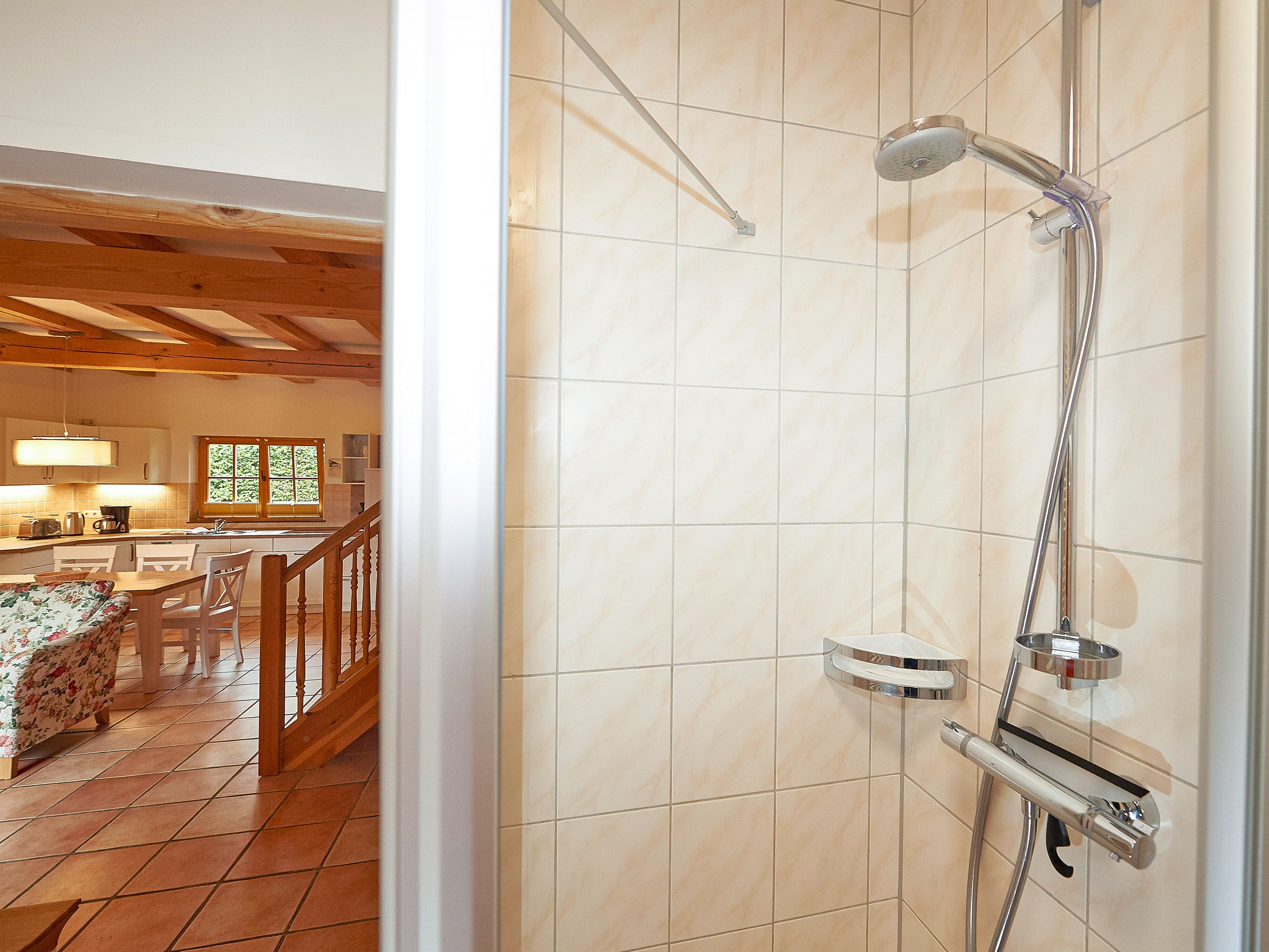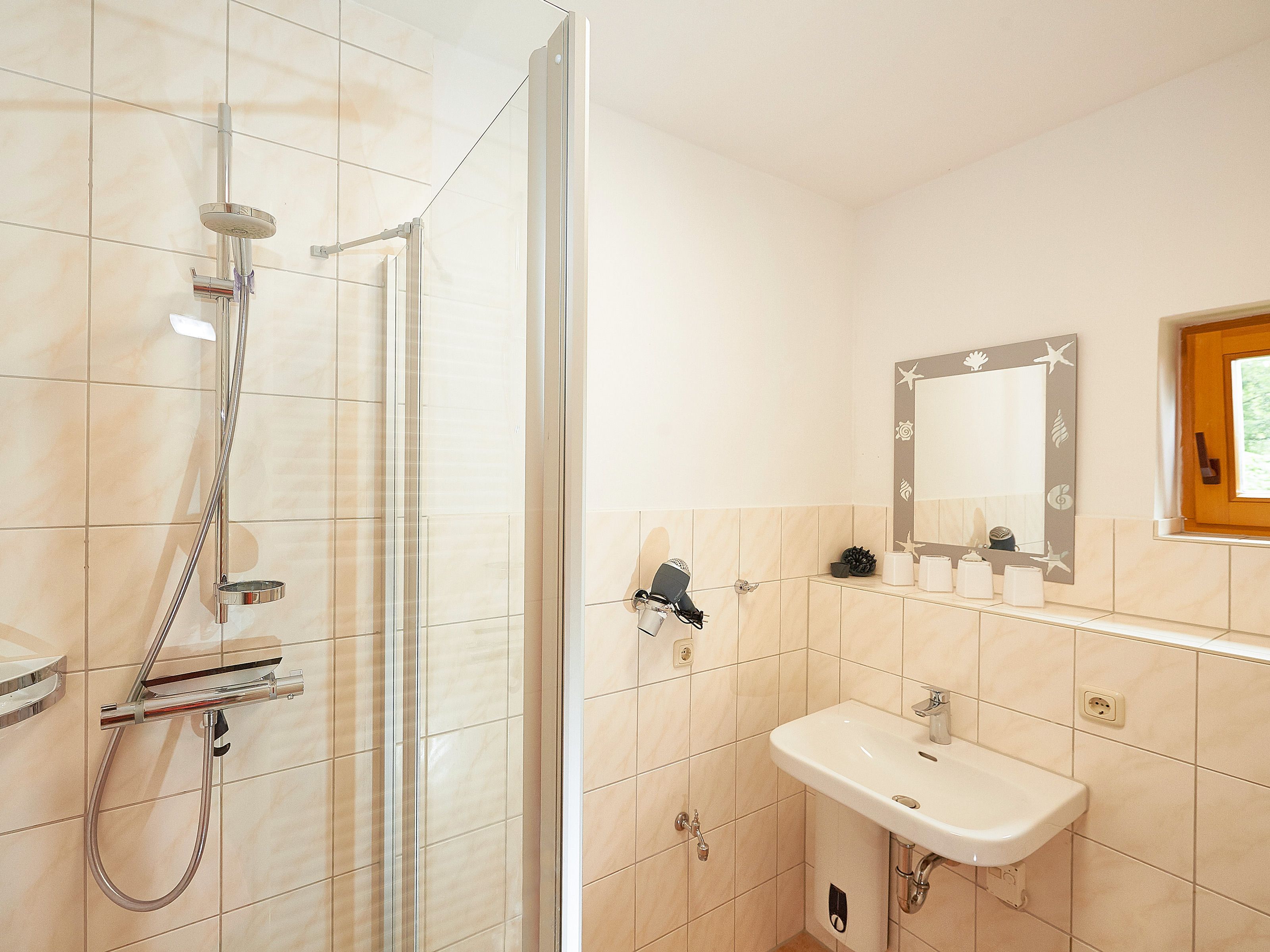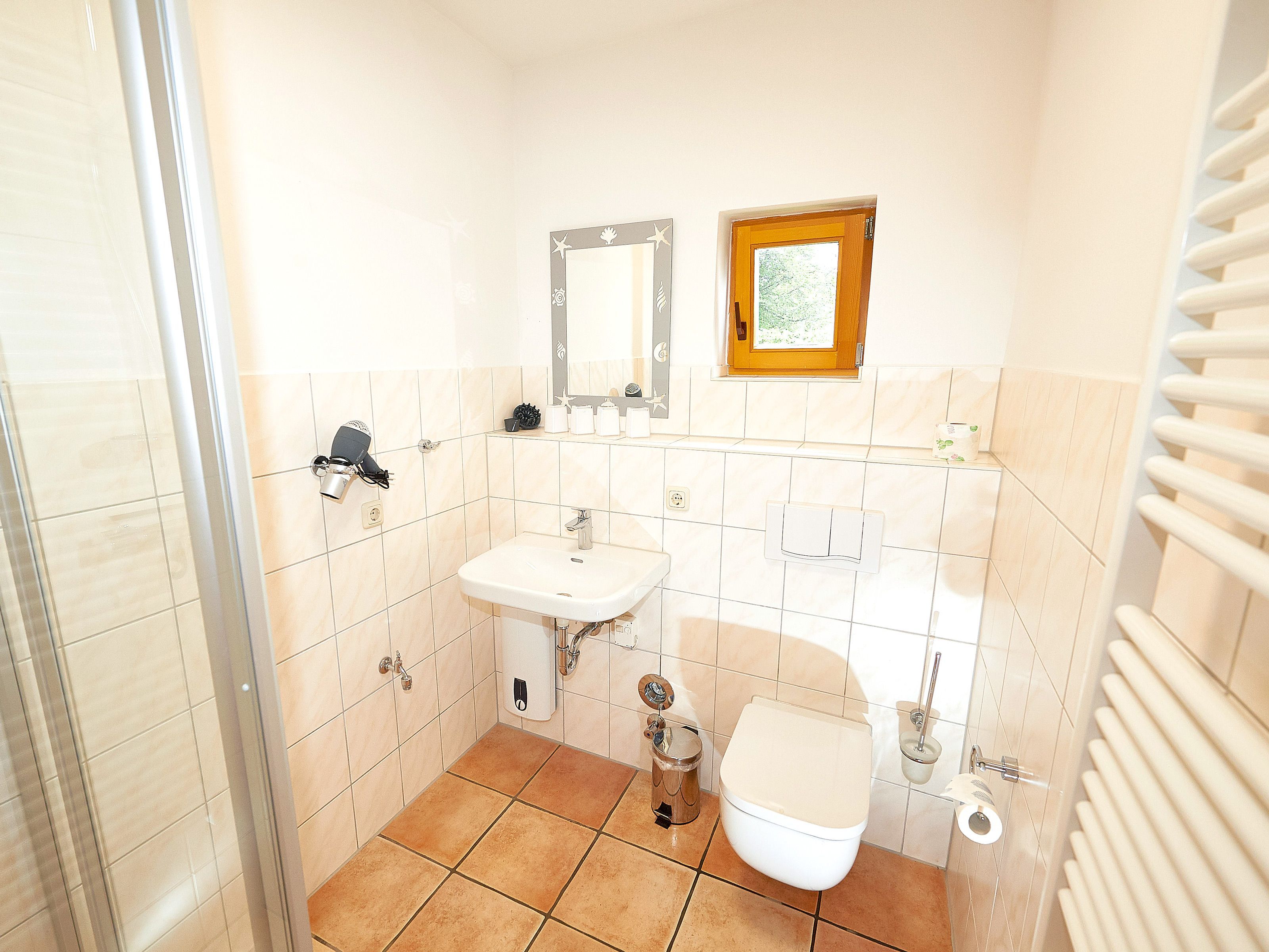Das Badezimmer Ihrer Unterkunft befindet sich ebenfalls im Erdgeschoss und ist mit Dusche/WC, einem beheizbaren Handtuchtrockner sowie einem Waschtisch inkl. Fön ausgestattet.