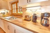 Zwei Sofas vor dem großen Flachbild-TV, kostenfreies W-LAN und der Kaminofen ermöglichen angenehme Abende, auch wenn es draußen vielleicht gerade nicht so schönes Wetter ist. Der große Esstisch ist für vier Personen geeignet. Die harmonisch in den Wohnbereich integrierte Küchenzeile ist ausgestattet mit einem 4-Zonen-Cerankochfeld, einem Kühlschrank mit Gefriermöglichkeit, einer Spülmaschine, einer Mikrowelle mit Grill, Kaffeemaschine, Toaster, Wasserkocher und diversem Kleininventar, das die Ausstattung komplettiert. Auch eine Waschmaschine ist hier untergebracht.