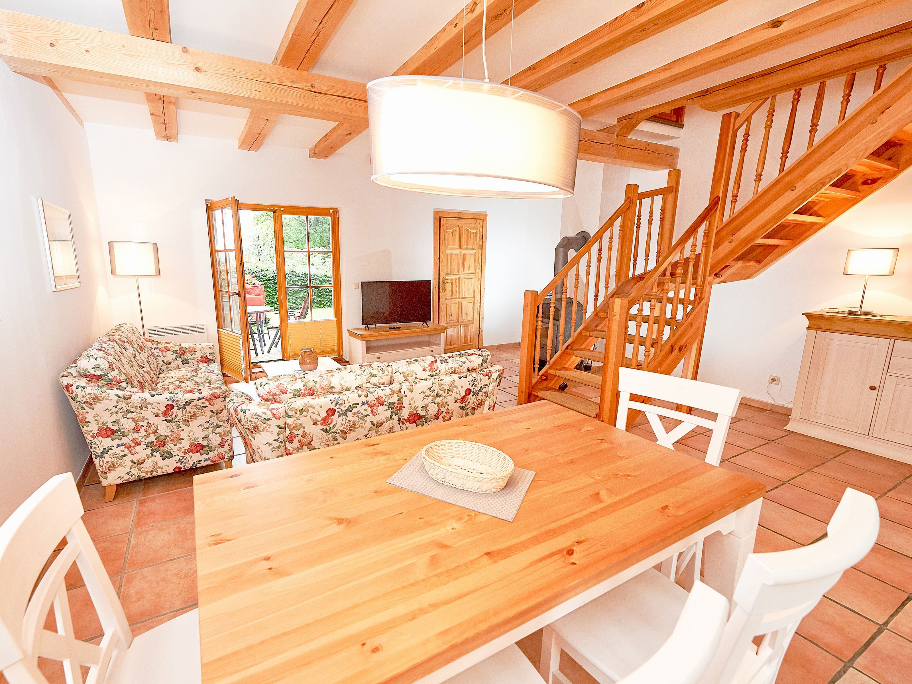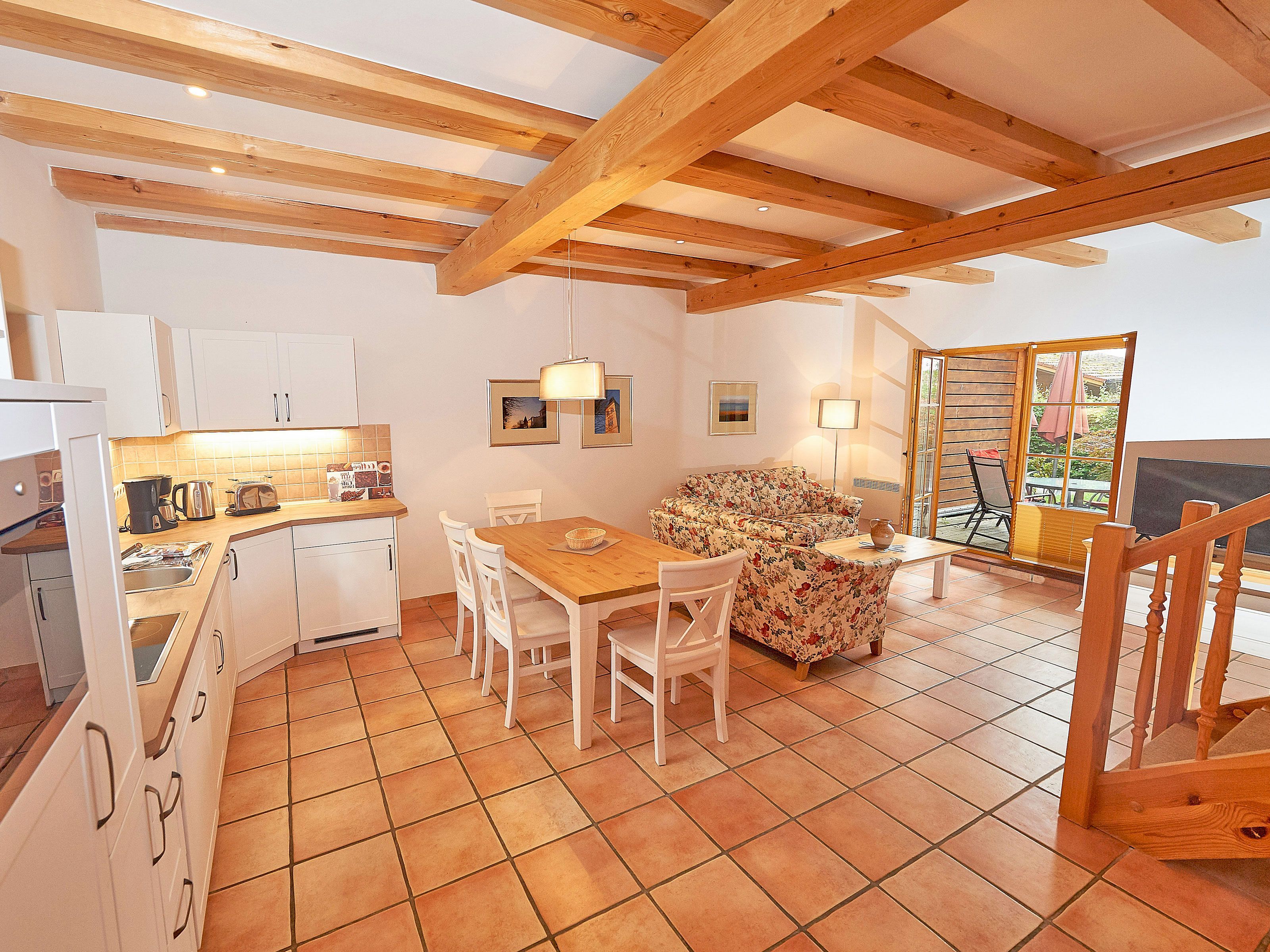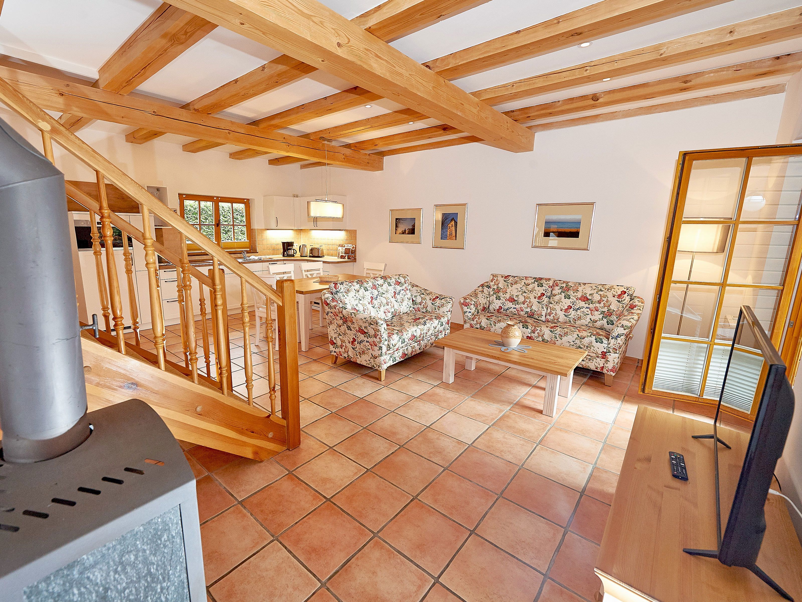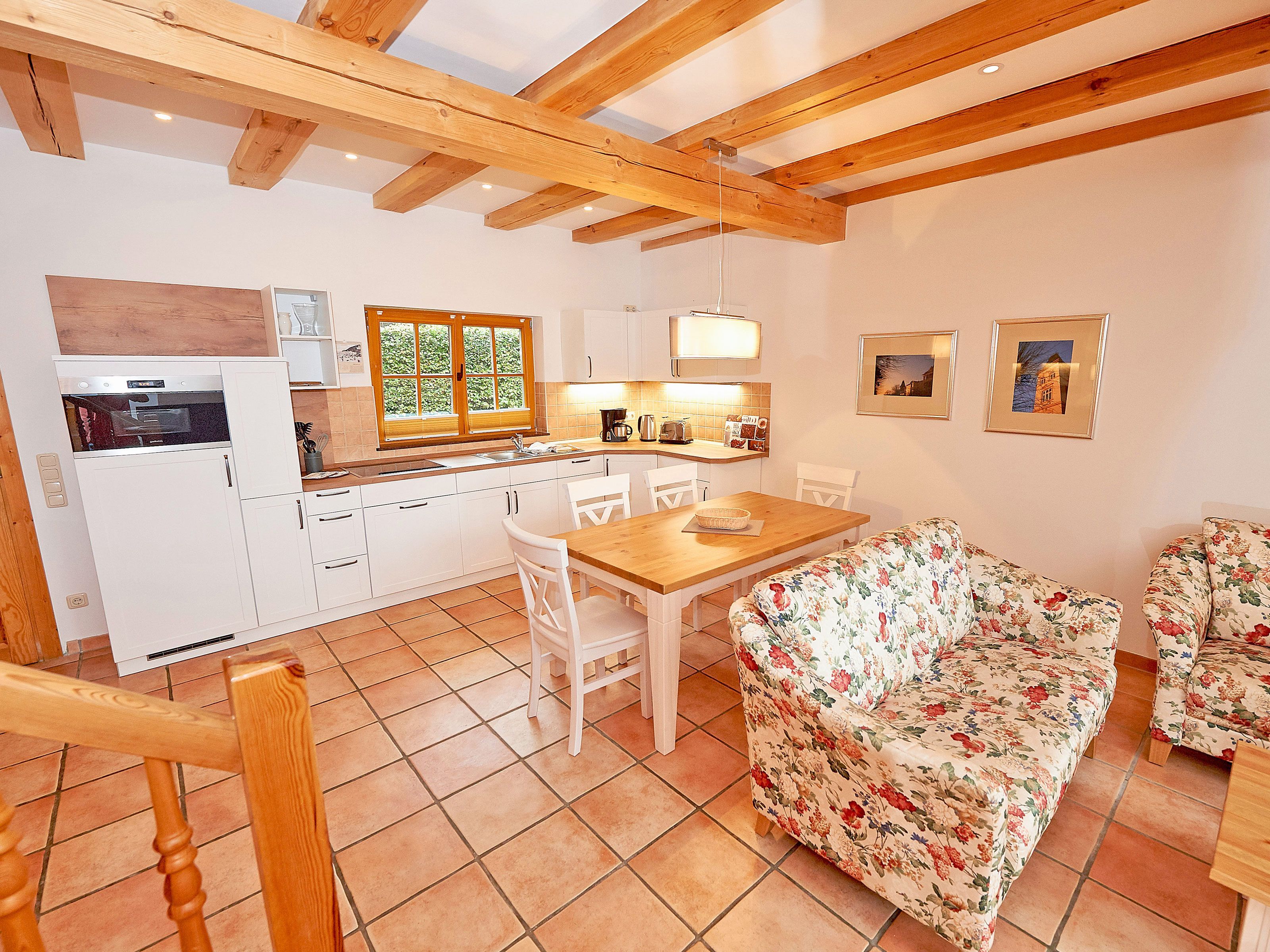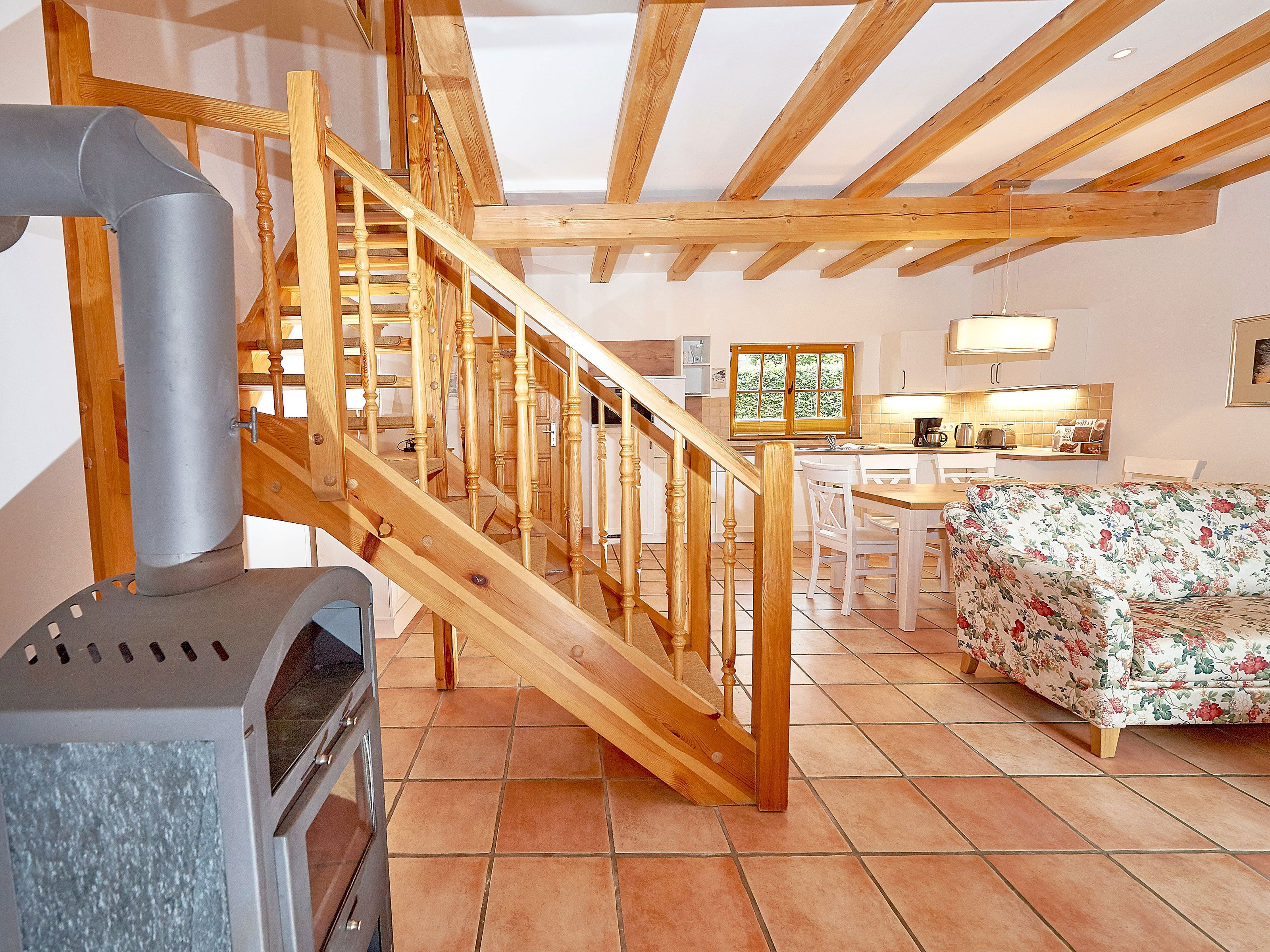 Zwei Sofas vor dem großformatigen Flachbild-TV, kostenfreies W-LAN und der Kaminofen laden zum Relaxen ein. Der große Esstisch ist für 4 Personen geeignet. Die harmonisch im Wohnbereich integrierte Küchenzeile ist ausgestattet mit einem 4-Zonen-Cerankochfeld, einem Kühlschrank mit Gefriermöglichkeit, einer Spülmaschine, einer Mikrowelle mit Grill, Kaffeemaschine, Toaster, Wasserkocher und diversem Kleininventar, das die Ausstattung komplettiert. Auch Ihre Waschmaschine wurde hier integriert.