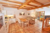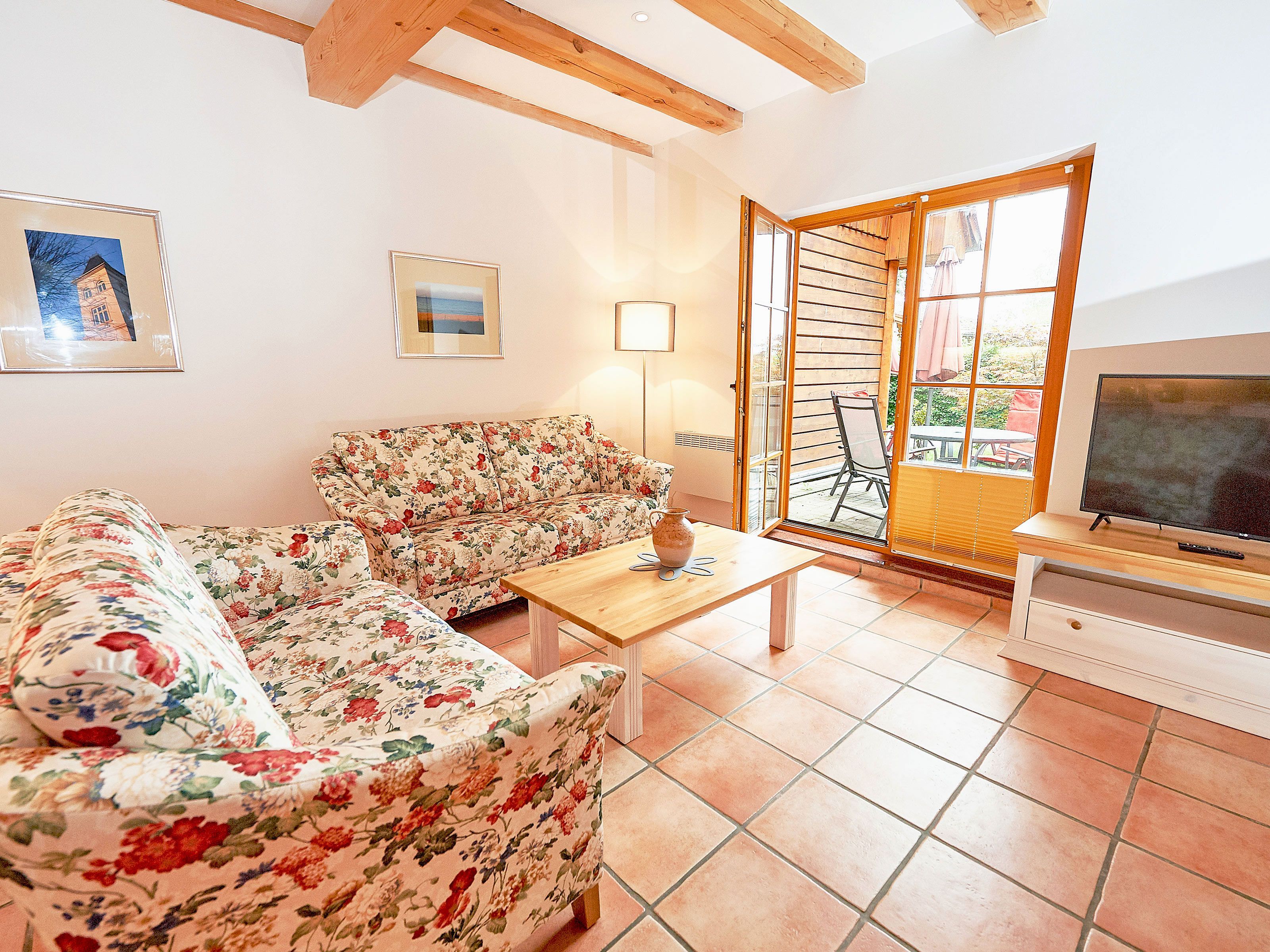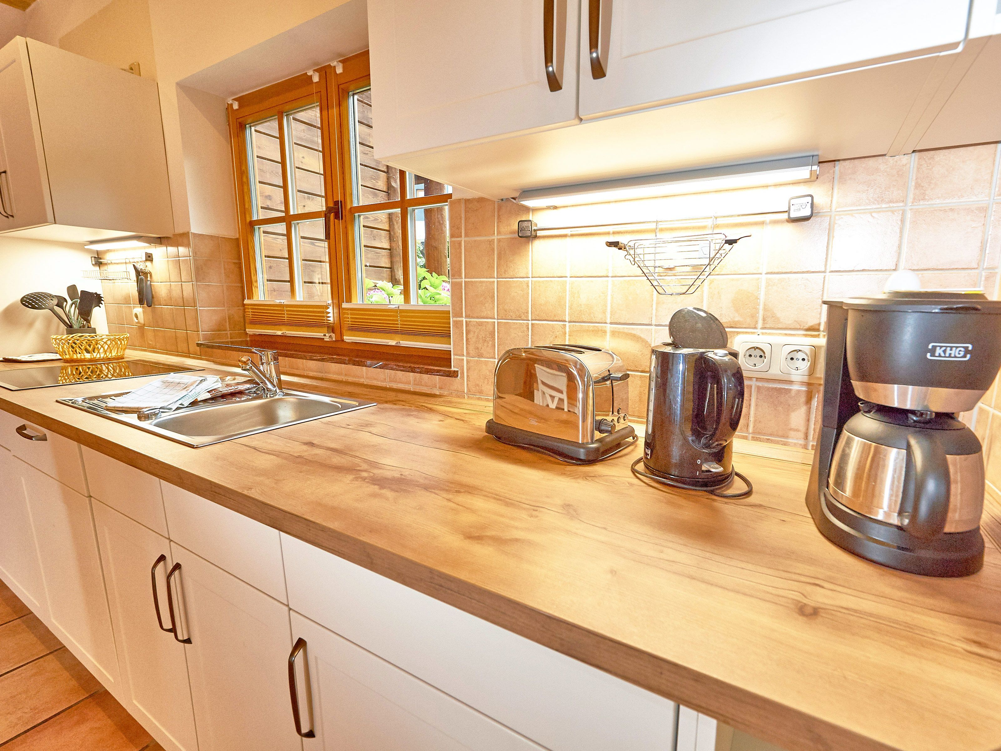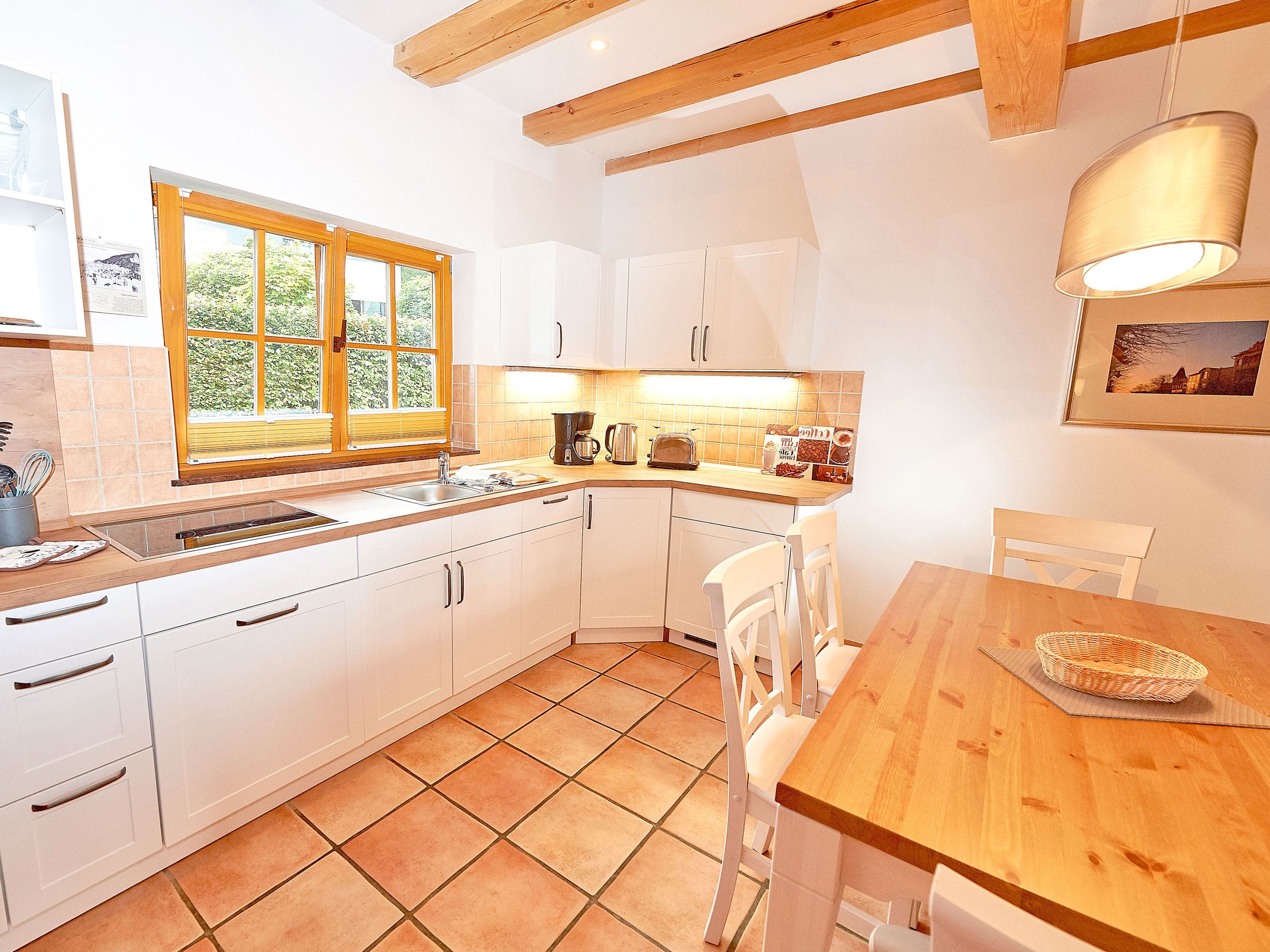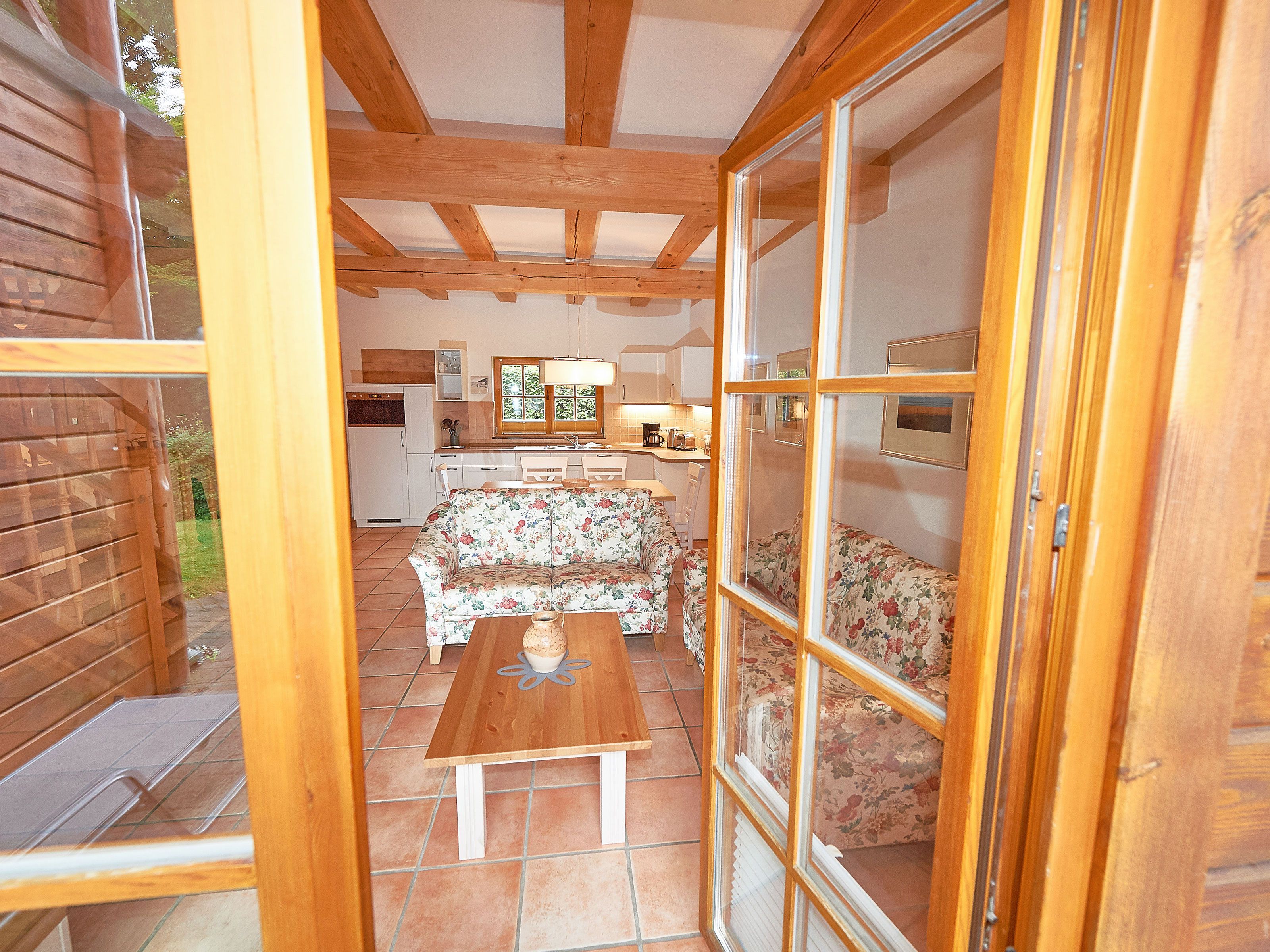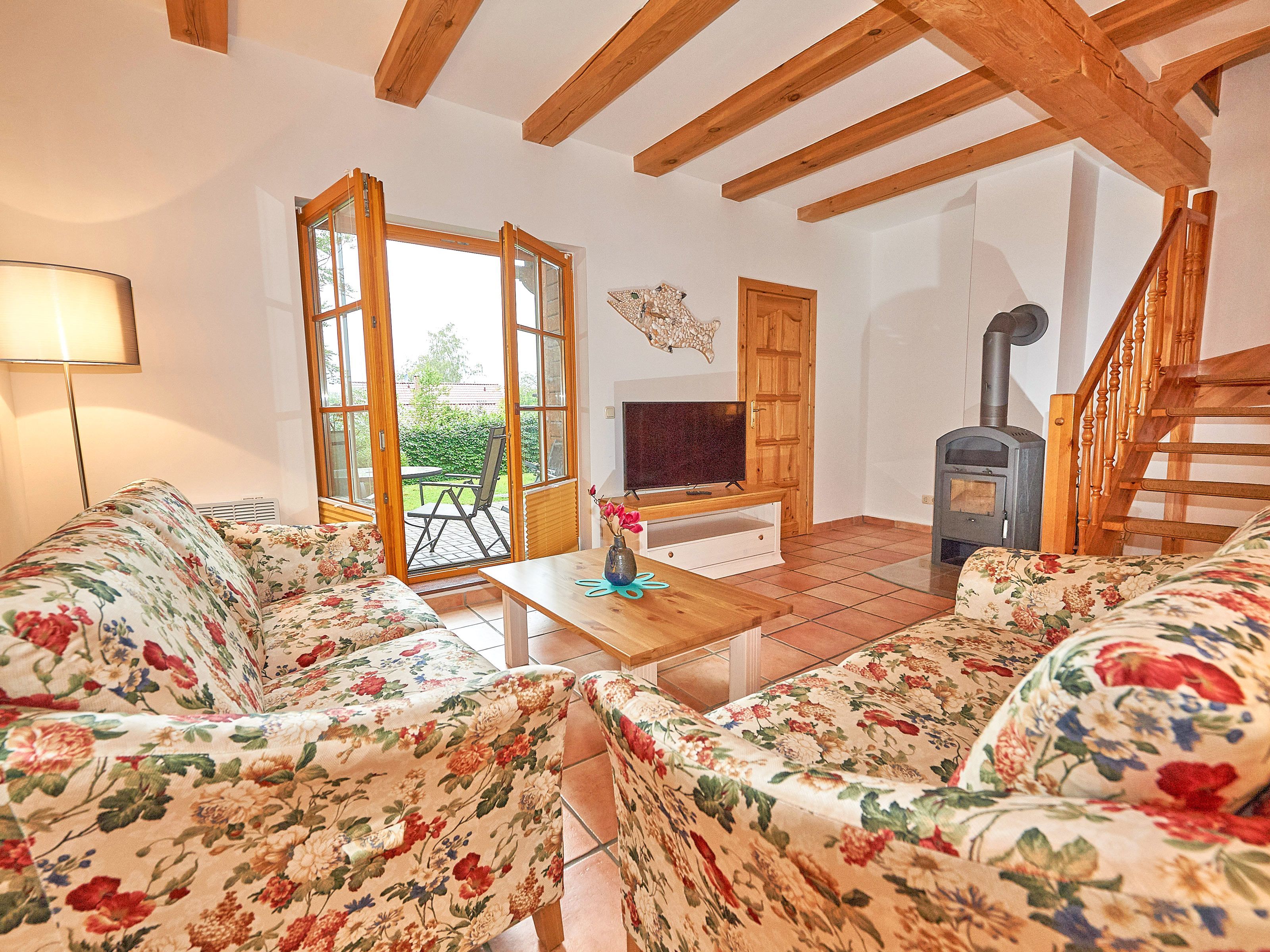 Zwei Sofas vor dem großformatigen Flachbild-TV, kostenfreies W-LAN und der Kaminofen laden zum Relaxen ein. Der große Esstisch ist für 4 Personen geeignet. Die harmonisch im Wohnbereich integrierte Küchenzeile ist ausgestattet mit einem 4-Zonen-Cerankochfeld, einem Kühlschrank mit Gefriermöglichkeit, einer Spülmaschine, einer Mikrowelle mit Grill, Kaffeemaschine, Toaster, Wasserkocher und diversem Kleininventar, das die Ausstattung komplettiert. Auch Ihre Waschmaschine wurde hier integriert.