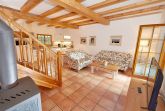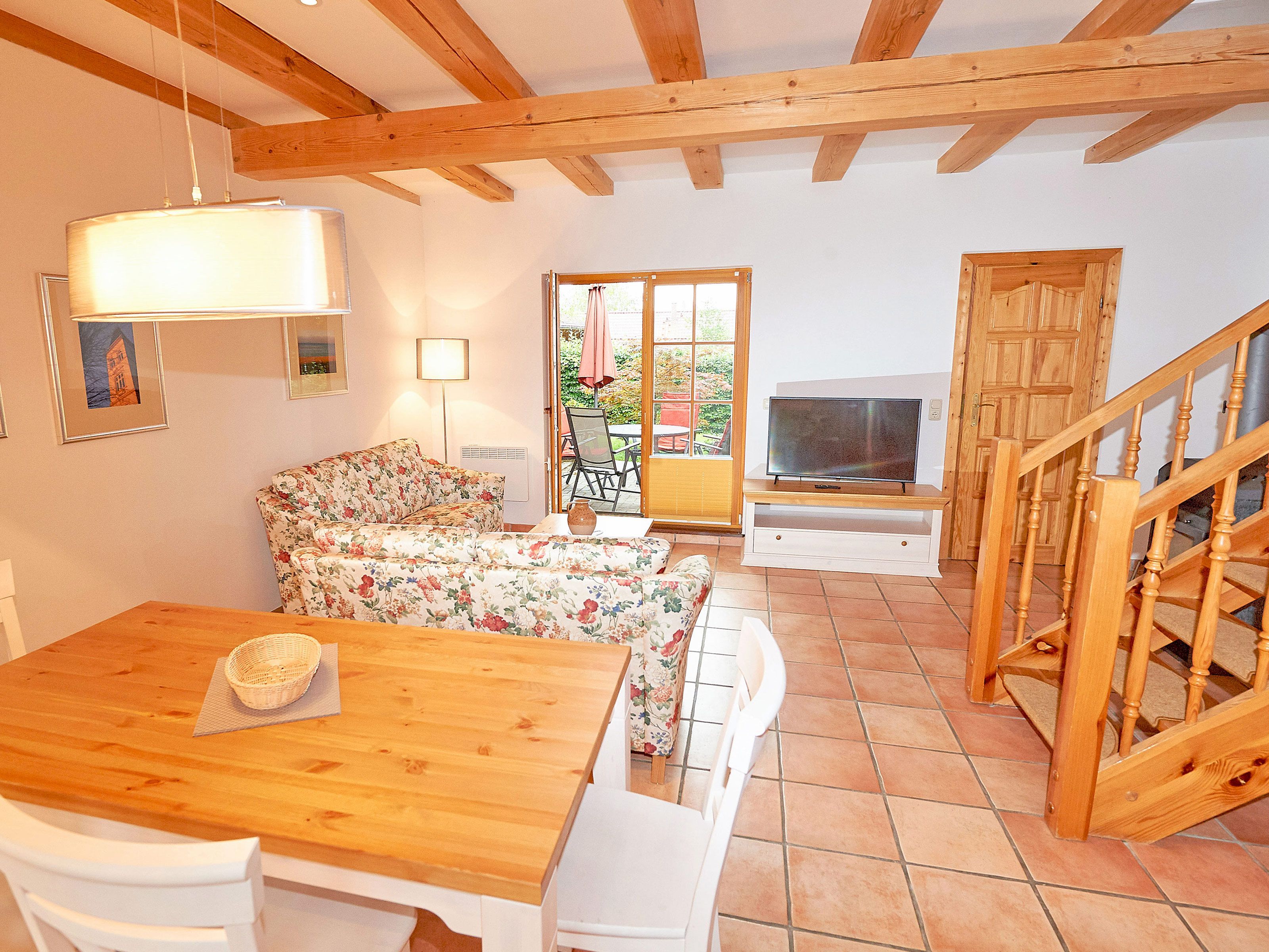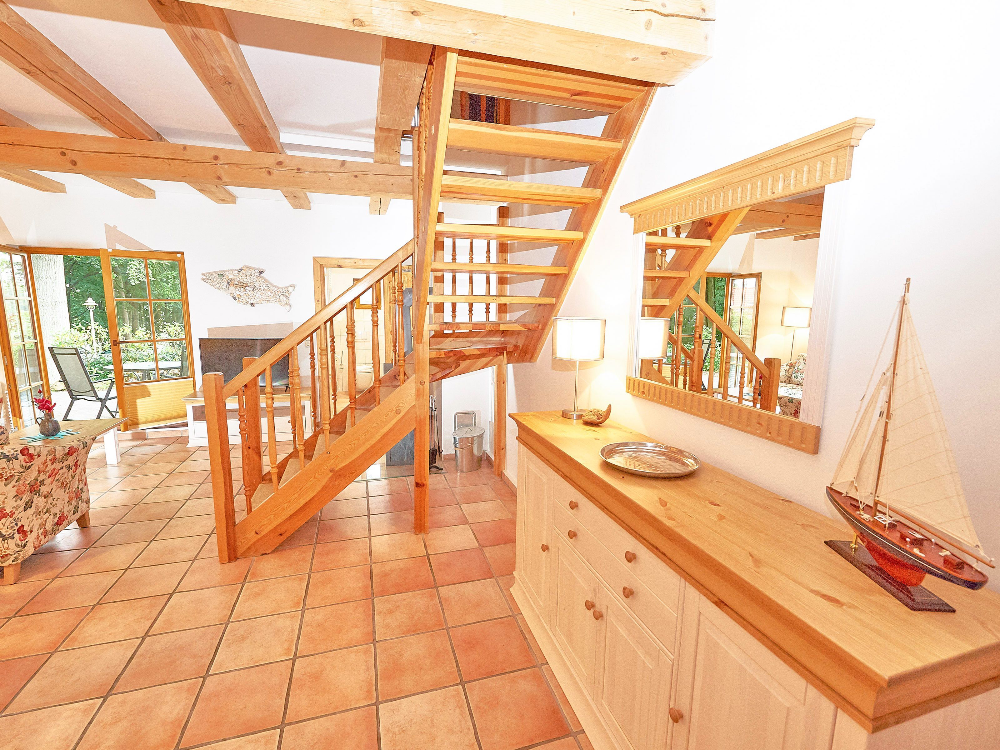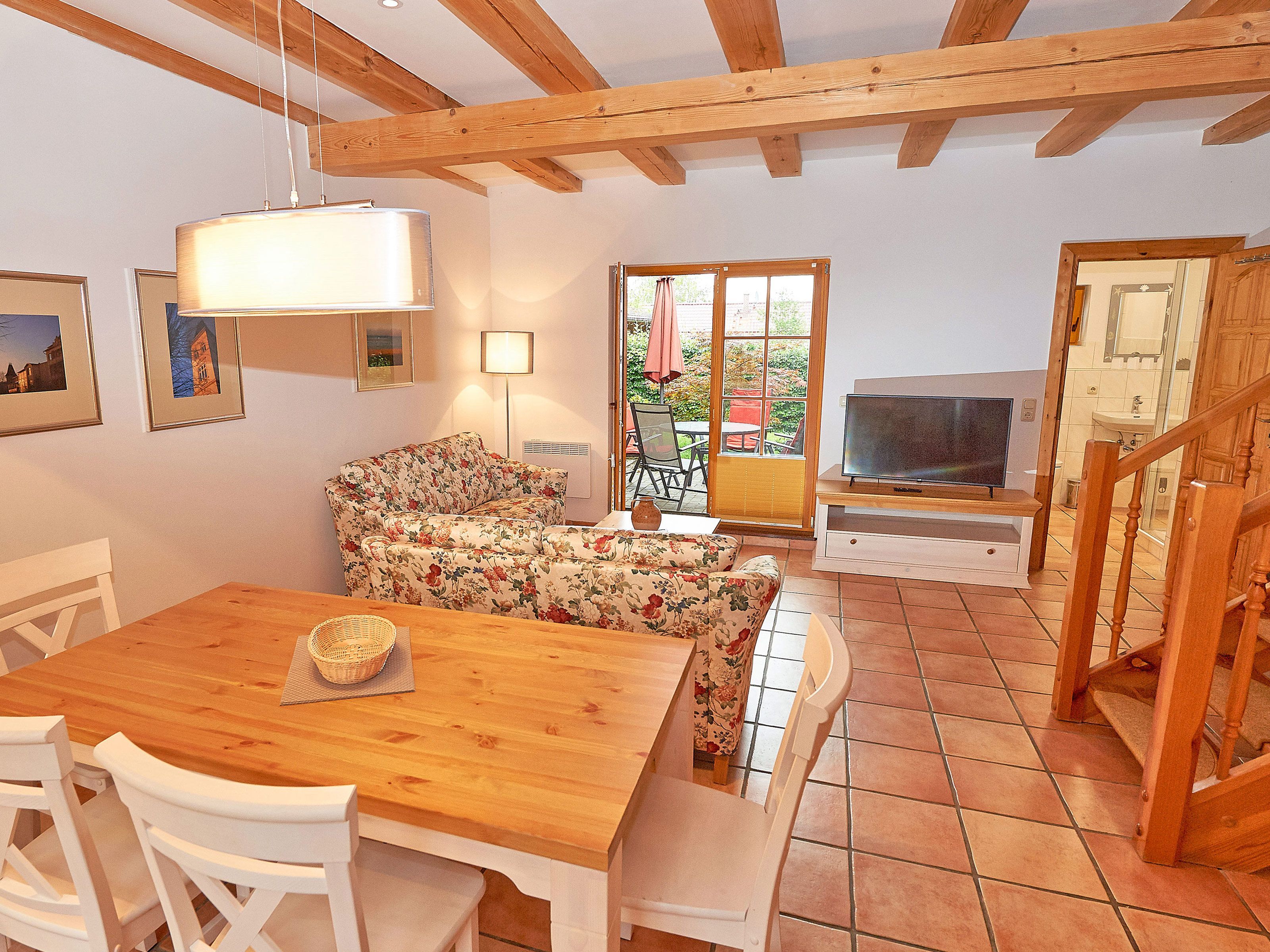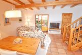 Die Haushälfte 3 erstreckt sich über zwei Ebenen und rund 100 m² Wohnfläche. Im Erdgeschoss finden Sie Ihr geräumiges Wohnzimmer, das durch die offenen Balken besonders gemütlich wirkt. Die dem Wohnzimmer vorgelagerte Terrasse zur Westseite ist mit Sonnenliegen und Sitzgruppe ausgestattet.