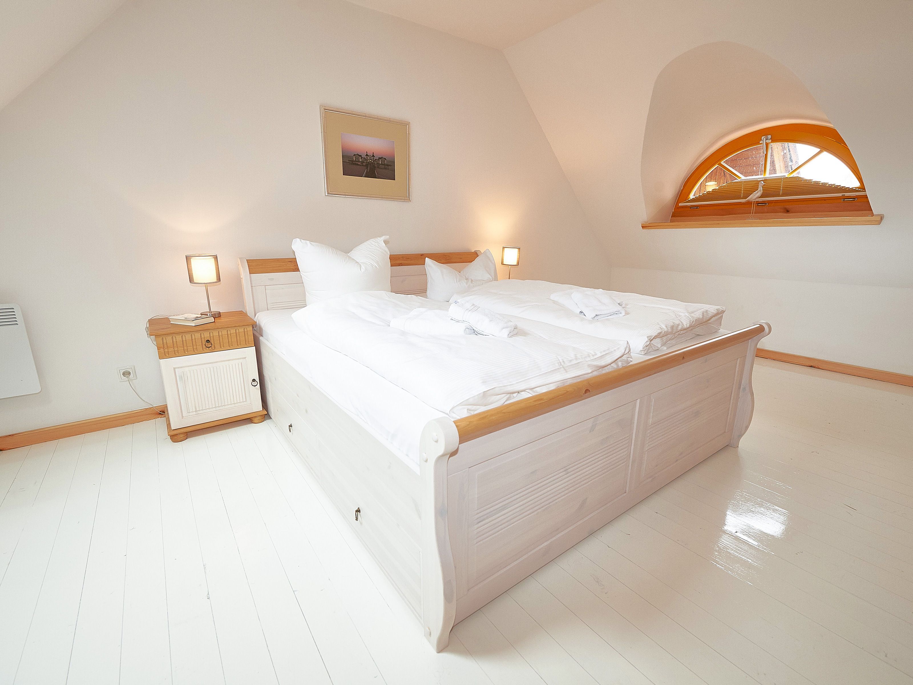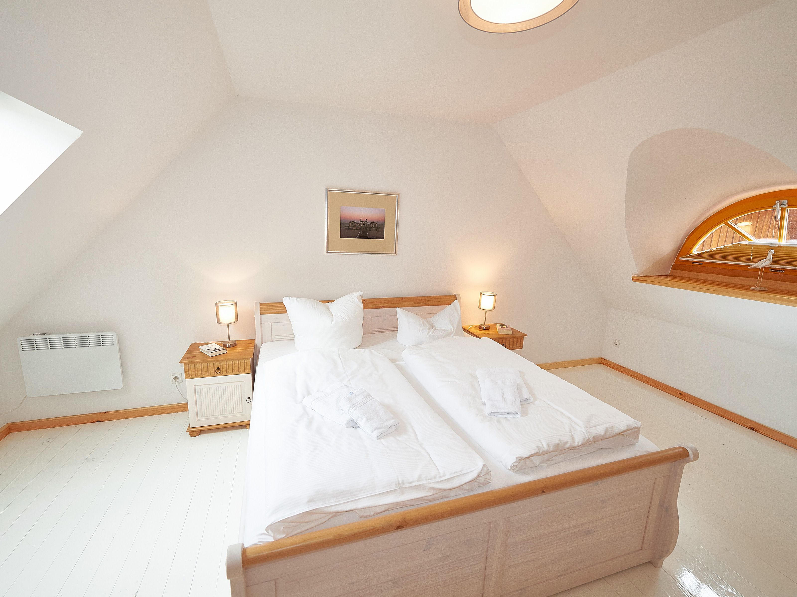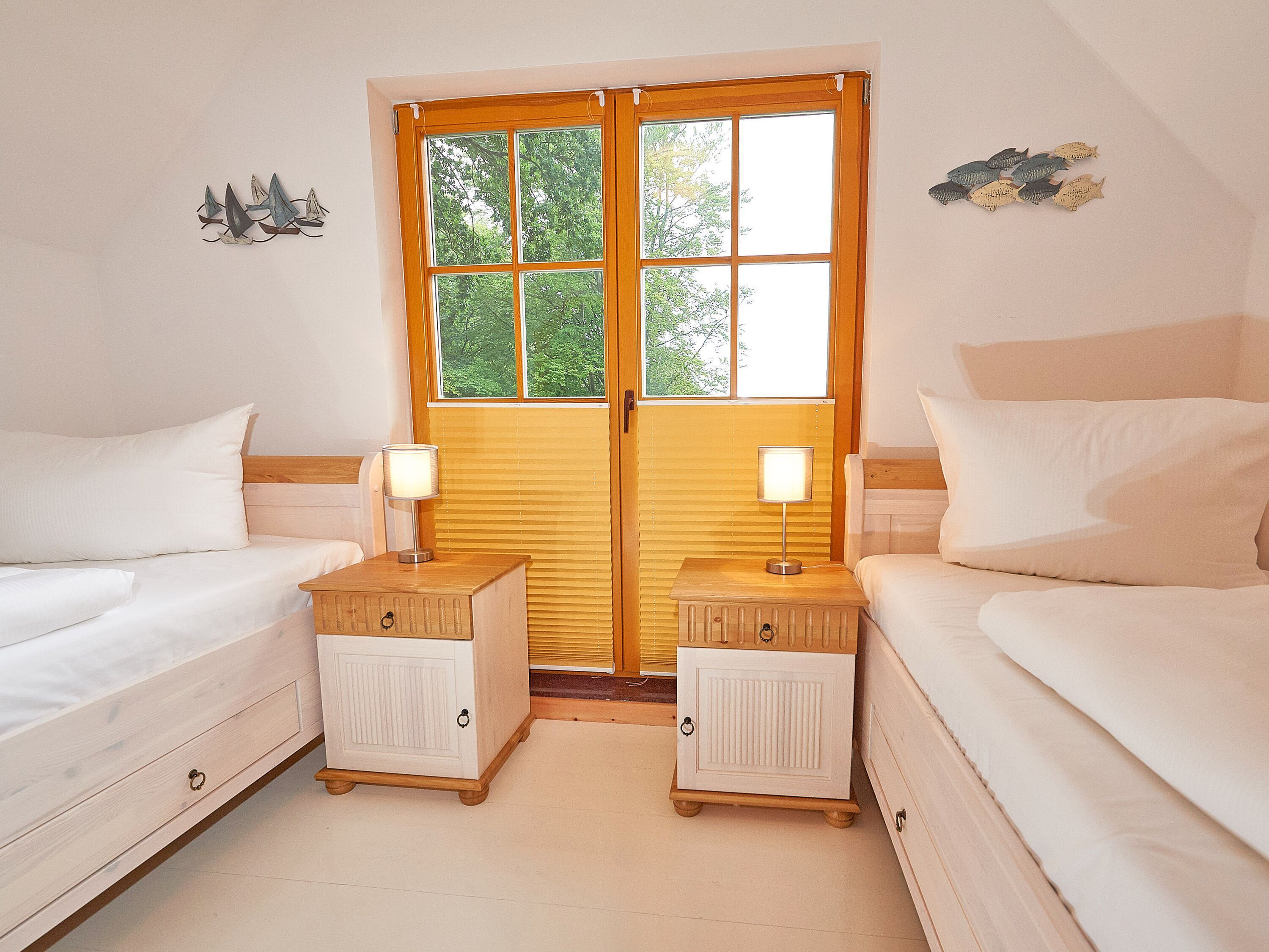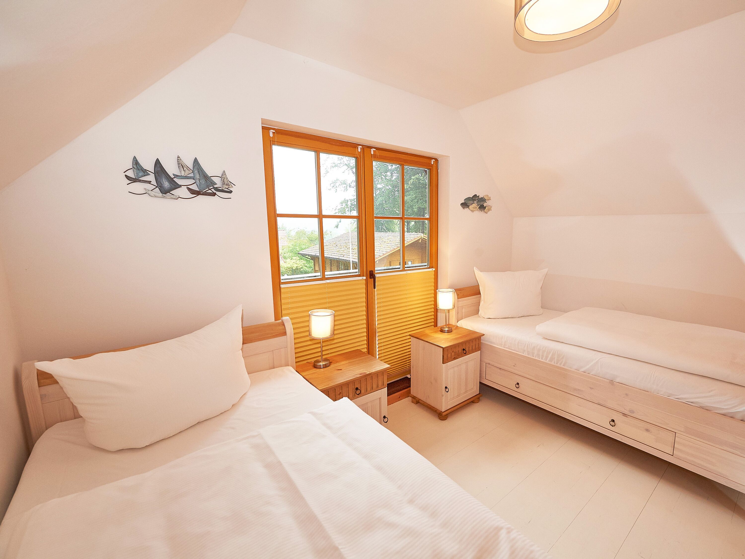 Die beiden Schlafzimmer erwarten Sie im Obergeschoss. Während das größere mit einem Doppelbett und einem zweiten TV-Gerät ausgestattet ist, verfügt das kleinere über zwei Einzelbetten sowie genügend Stauraum für Ihre Garderobe.